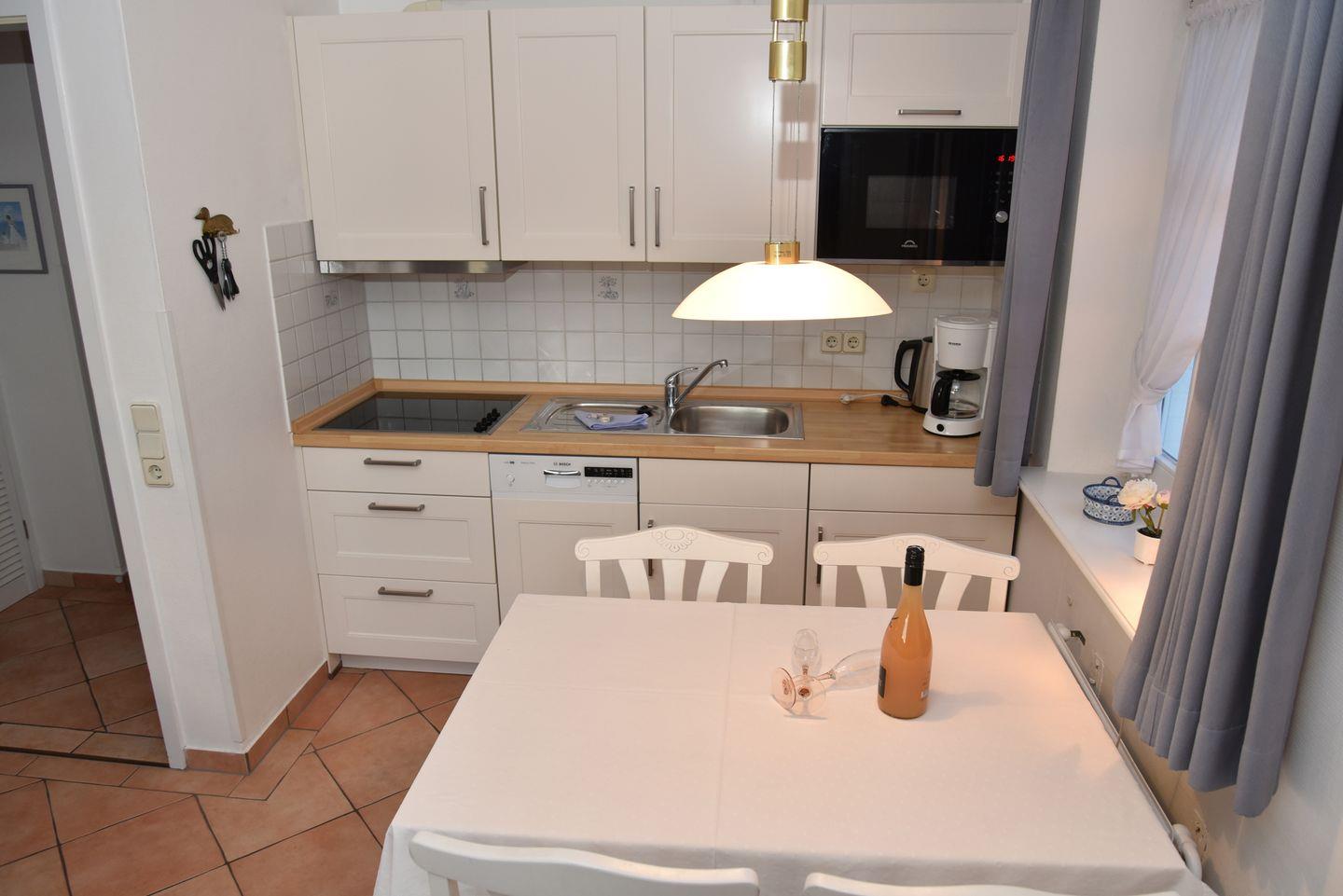 Der helle Wohnraum lädt mit einer modernen Küchenzeile und einer gemütlichen Essecke zum Verweilen ein. Von hier aus gelangen Sie direkt auf die sonnige Südterrasse, wo Sie herrliche Stunden im Freien verbringen können.