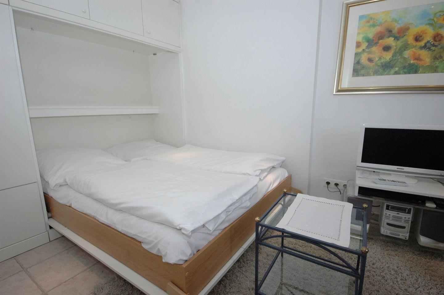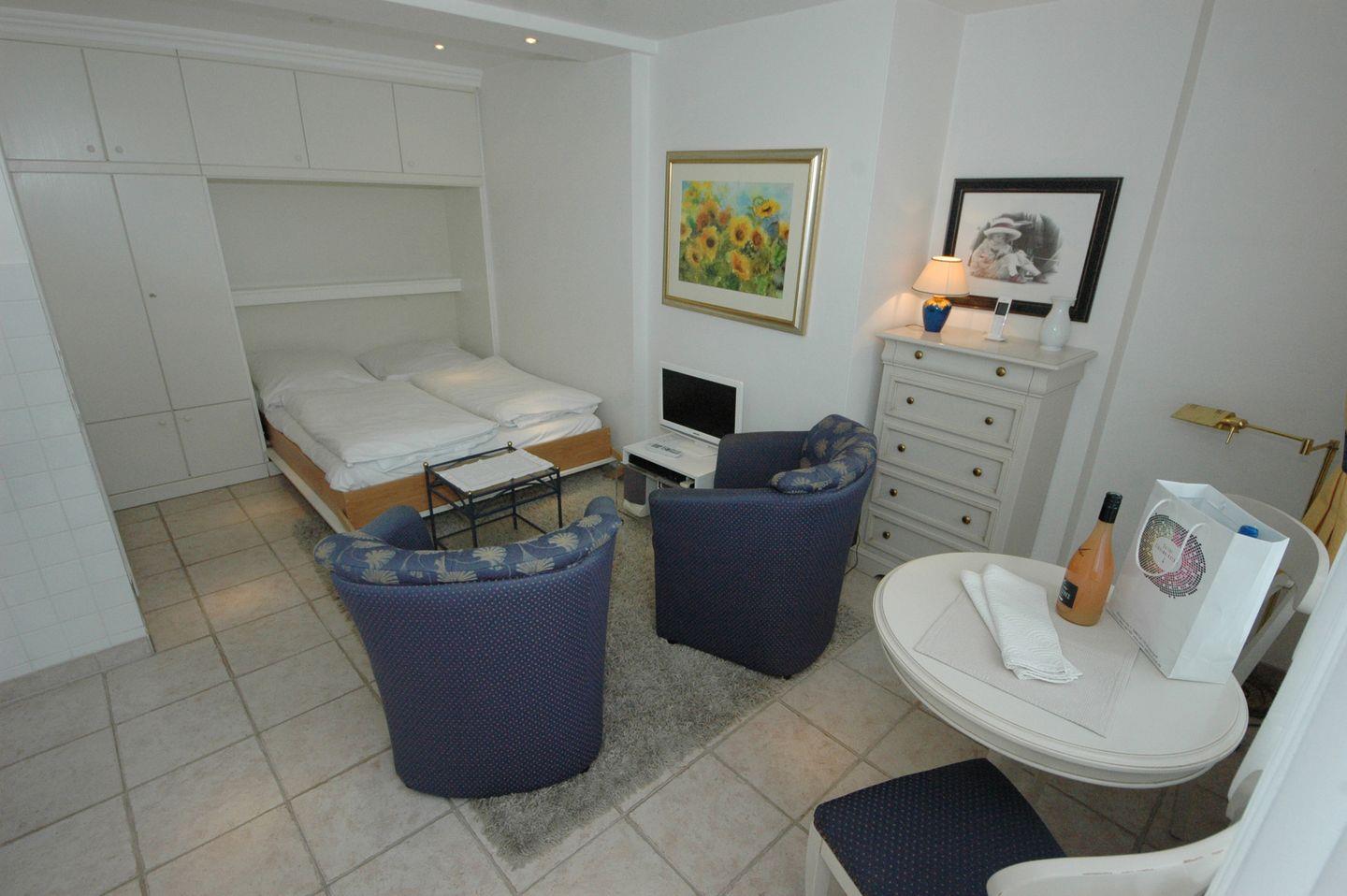 Diese charmante Wohnung bietet auf 20 Quadratmetern einen einladenden Wohn- und Essbereich mit einem praktischen Schrankbett. Tagsüber können Sie den Wohnbereich zum Entspannen nutzen und das Schrankbett nachts leicht ausklappen, um erholsame Nächte zu verbringen.