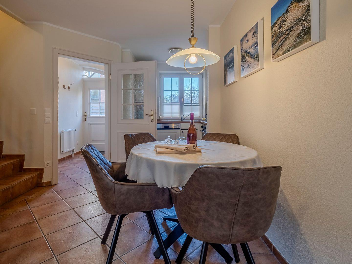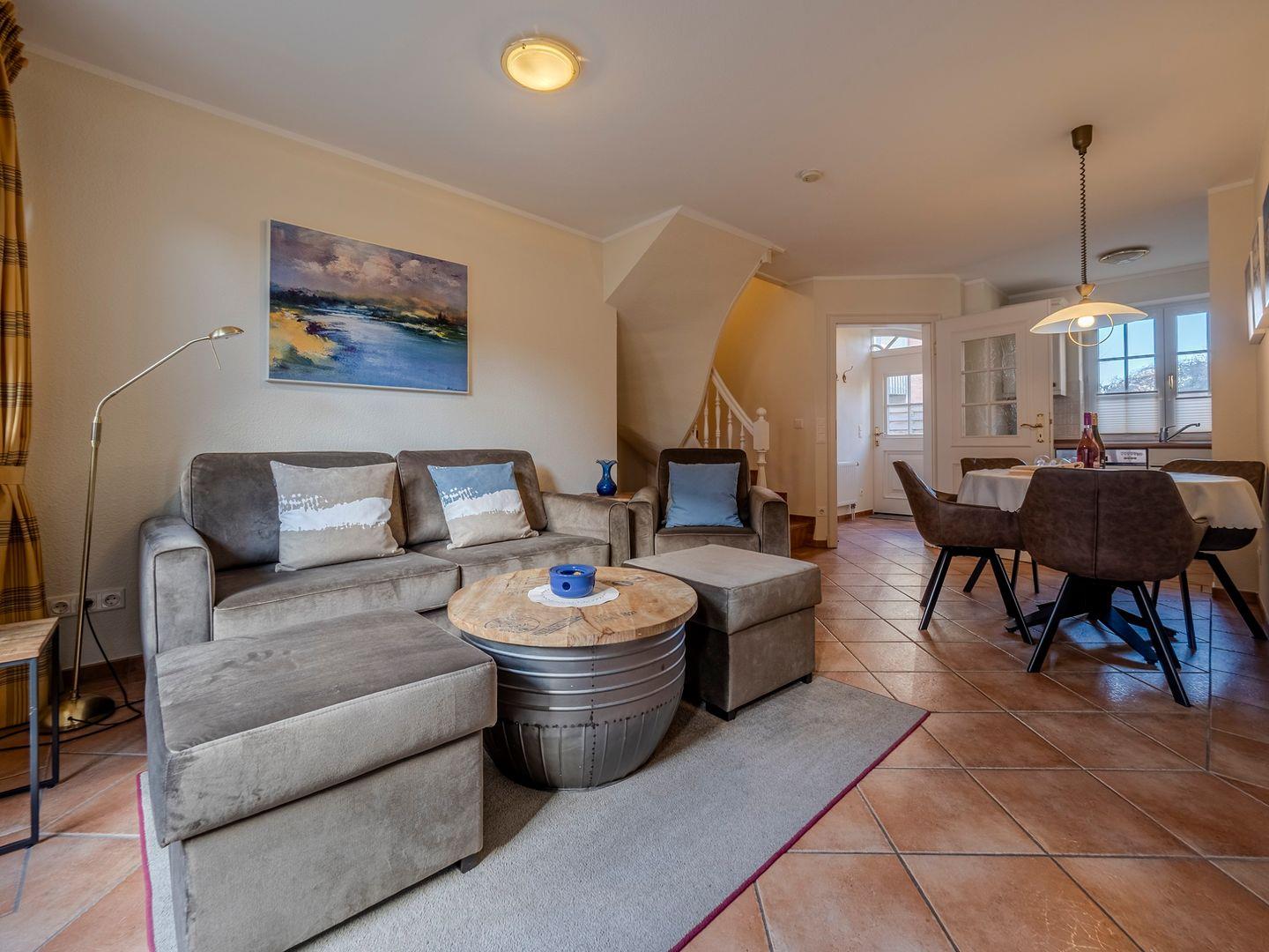 Im Erdgeschoss erwartet Sie ein einladender Wohnraum mit gemütlicher Essecke und einer voll ausgestatteten Küchenzeile, wo Sie köstliche Mahlzeiten zubereiten können. Von hier aus gelangen Sie auch auf die Terrasse, die mit bequemen Gartenmöbeln ausgestattet ist und sich perfekt für entspannte Stunden im Freien eignet.