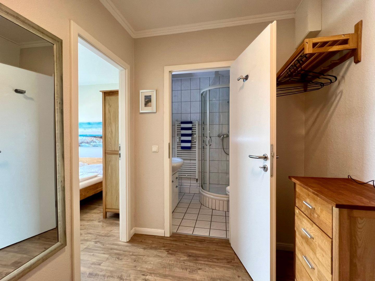 Das Appartement Nr. 43 im 2. Obergeschoss (ca. 40 qm) verfügt über 1 Wohnzimmer mit Schlafcouch, Sideboard, Essplatz und Zugang zum Balkon; 1 Küche (ensuite zum Wohnen) ; 1 Schlafzimmer mit Schrank; 1 Flur mit Garderobe, Spiegel und Einbauschrank; 1 Badezimmer mit Dusche.