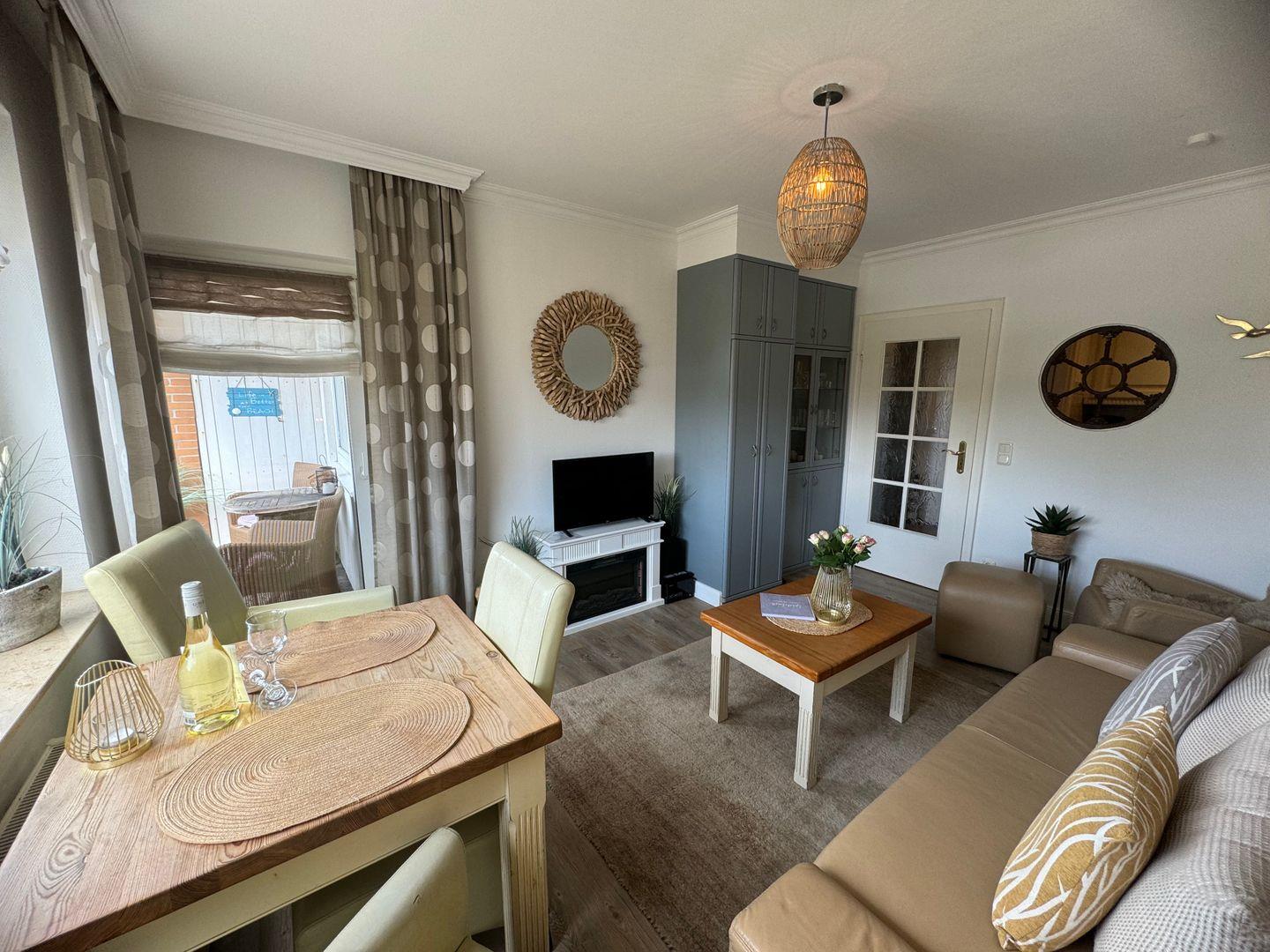 Die Wohnung verfügt über ein komfortables Schlafzimmer, das mit einem Vinylboden ausgestattet ist und einen ruhigen Rückzugsort nach einem erlebnisreichen Tag an der frischen Meeresluft bietet. Zudem finden Sie im gemütlichen Wohnzimmer eine einladendes Sofa sowie einen Esstisch, an dem Sie gemeinsame Mahlzeiten genießen können. Der Fernseher mit Kabelanschluss sorgt für Unterhaltung am Abend – sei es beim Kuscheln oder beim Planen des nächsten Ausflugs.
