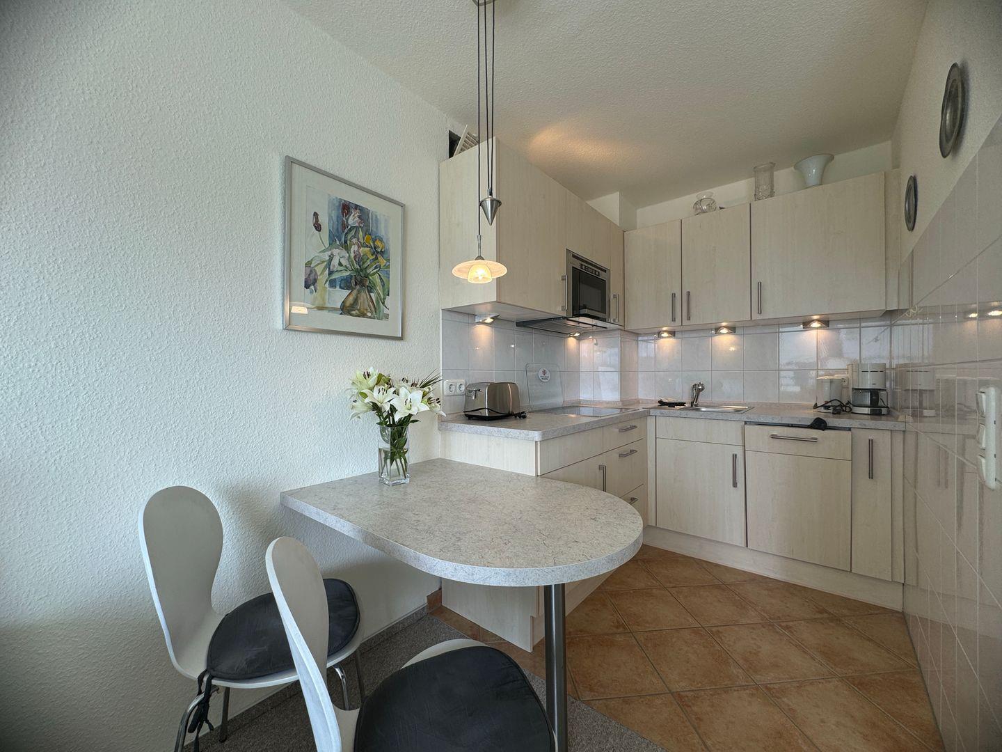 Die Ferienwohnung wurde 2022 renoviert und präsentiert sich mit einem offenen Küchen- und Wohnbereich, der eine harmonische Verbindung zwischen Kochen und Geselligkeit schafft. Bereiten Sie Ihre Lieblingsgerichte in der voll ausgestatteten Küche zu, die mit modernen Geräten wie einer Ceran-Kochplatte, Spülmaschine und Mikrowelle ausgestattet ist. Genießen Sie Ihre Mahlzeiten am Esstisch, während Sie es sich auf dem bequemen Sofa oder einem Sessel gemütlich machen.