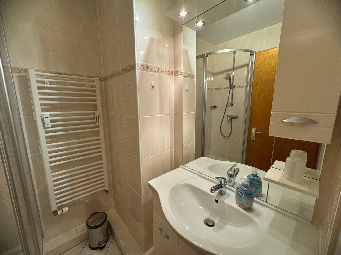 Das Badezimmer ist modern gestaltet und bietet eine Dusche und WC.