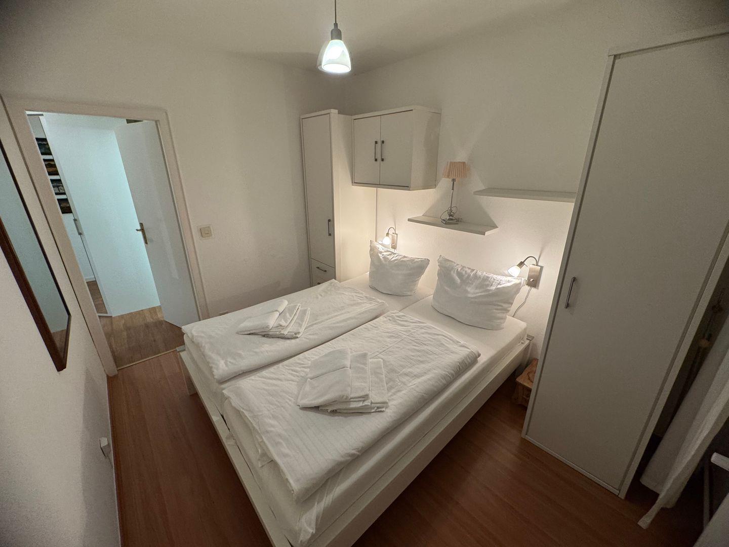 Die Ferienwohnung zählt insgesamt zwei Zimmer, darunter ein gemütliches Schlafzimmer mit einem komfortablen Doppelbett, das einen erholsamen Schlaf verspricht. Im Wohnbereich finden Sie ein einladendes Sofa, das nach einem aufregenden Tag zu entspannten Stunden einlädt. Der Essbereich ist ideal für gemeinsame Mahlzeiten und gesellige Abende. Eine vollständig ausgestattete Küche mit modernen Elektrogeräten, darunter ein 2-Platten-Ceran-Kochfeld, Kühlschrank, Geschirrspüler und Kaffeemaschine, lässt keine Wünsche offen und erlaubt es Ihnen, leckere Gerichte zuzubereiten.