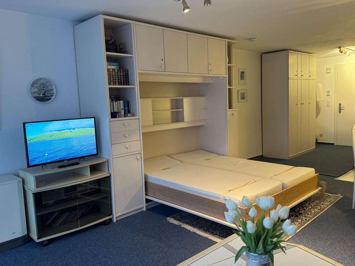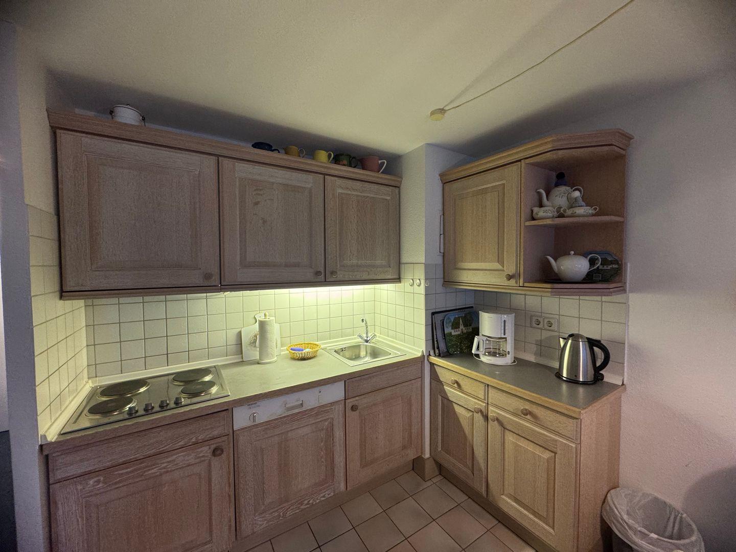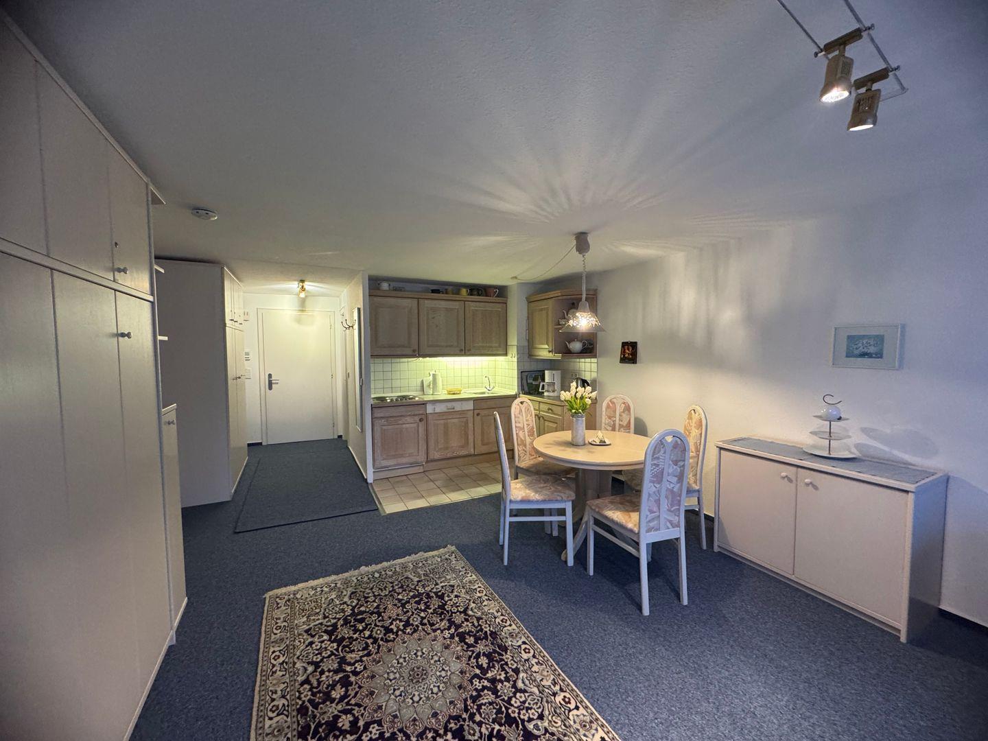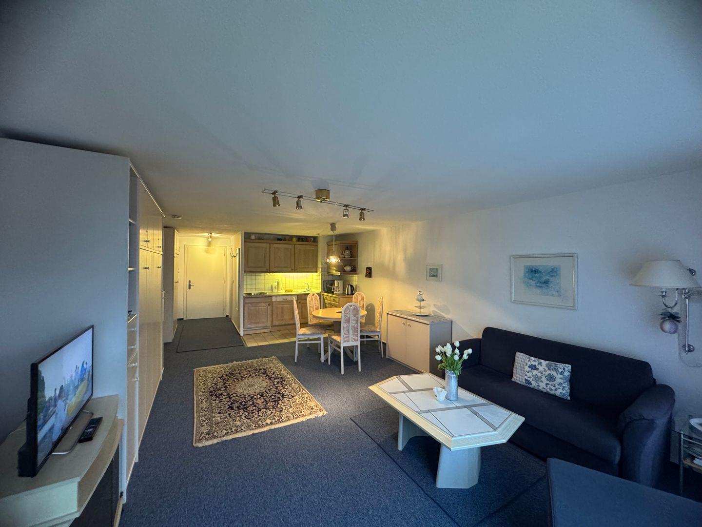 Betreten Sie die Wohnung und lassen Sie sich von dem hellen und freundlichen Ambiente verzaubern. Der Wohnbereich lädt zum Entspannen und Wohlfühlen ein. Lehnen Sie sich auf dem bequemen Sofa zurück, und genießen Sie einen spannenden Film auf dem Fernseher oder hören Sie Ihre Lieblingsmusik über das Radio. Der Esstisch bietet ausreichend Platz für ein romantisches Dinner oder ein gemeinsames Frühstück, das Sie in der voll ausgestatteten Küche zubereiten können. Hier stehen Ihnen alle modernen Kochutensilien zur Verfügung, um kulinarische Köstlichkeiten zu kreieren.