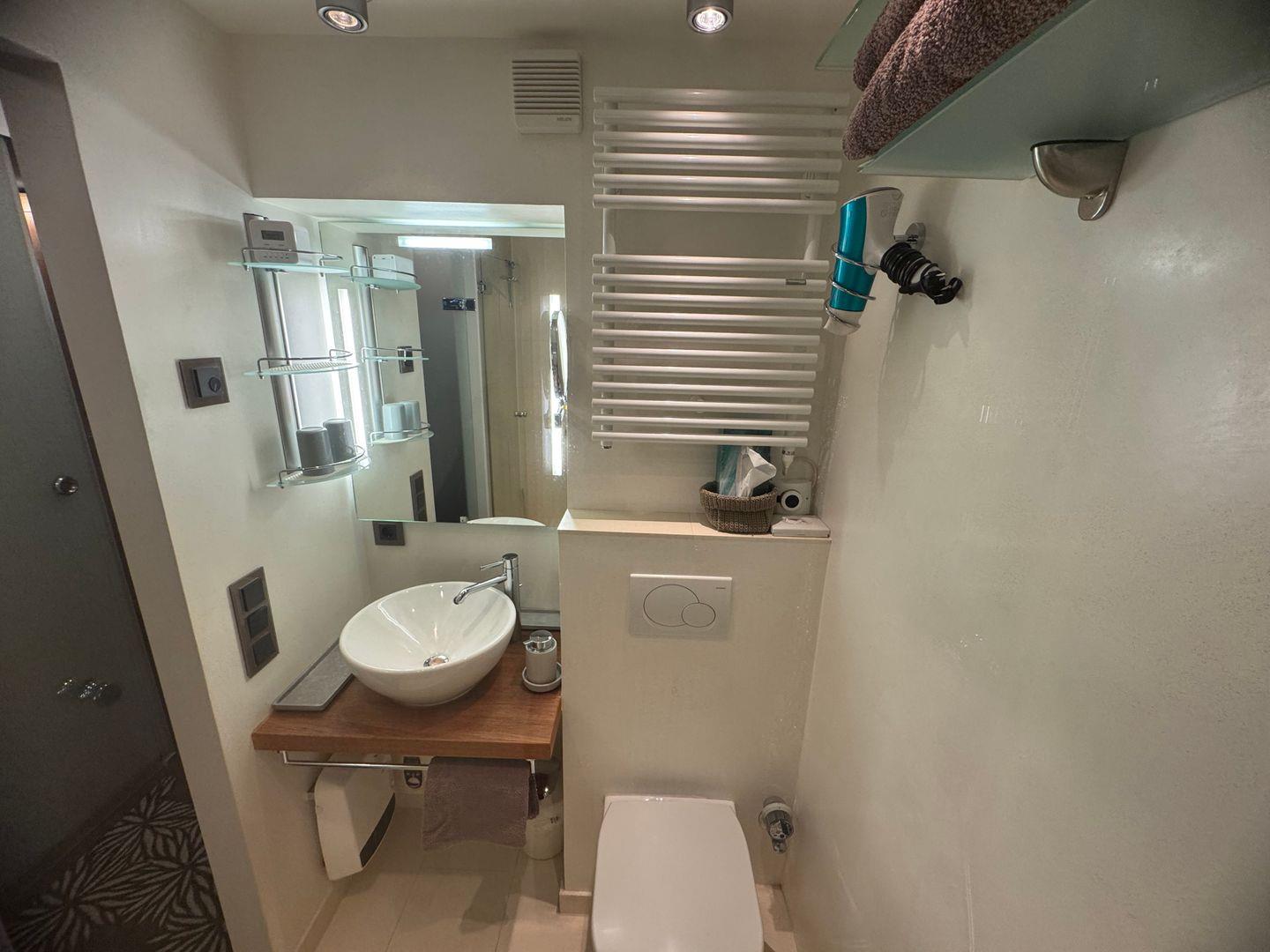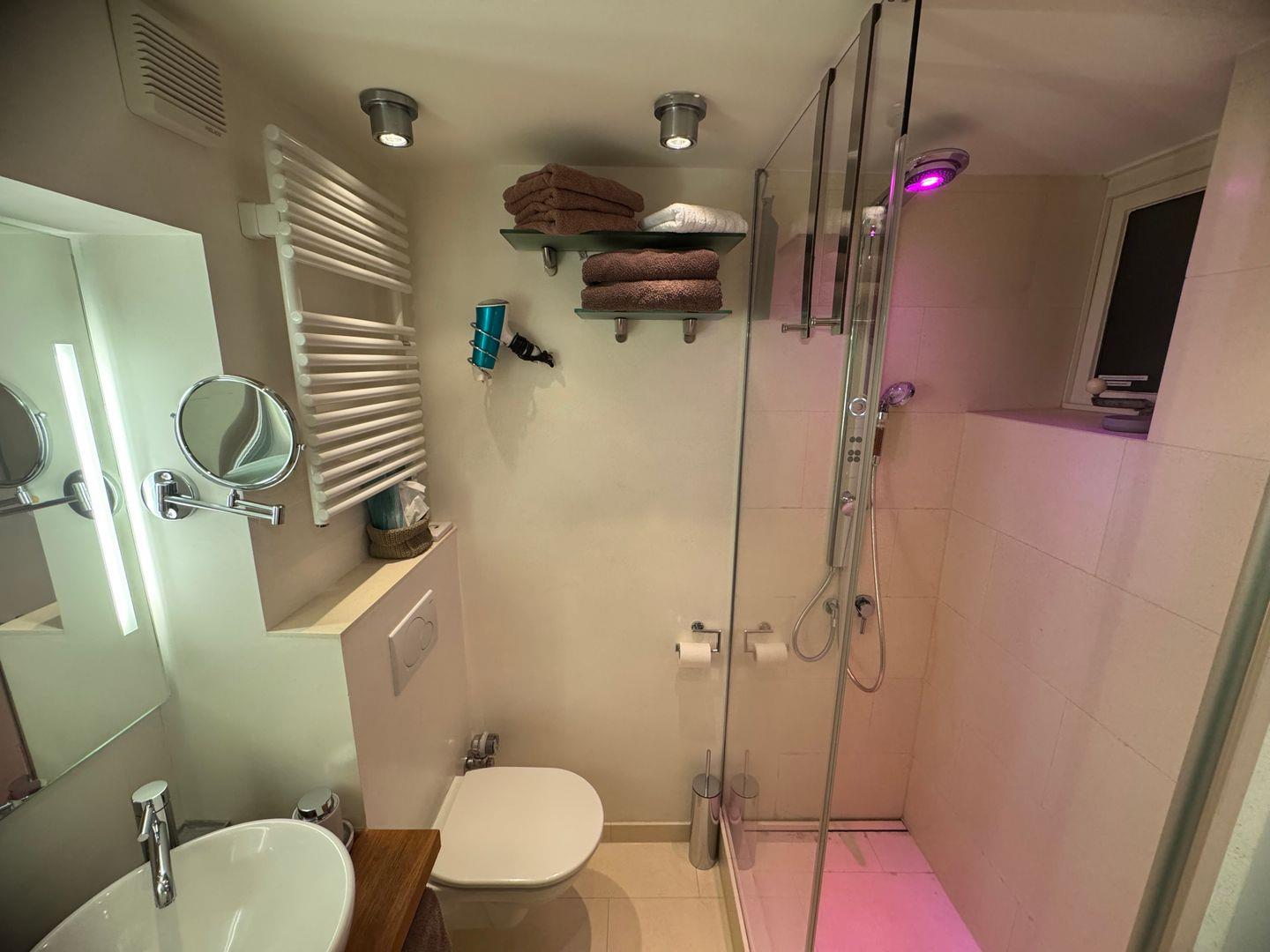 Hier können Sie nach einem erlebnisreichen Tag am Strand oder dem Erkunden der Insel bei geöffnetem Fenster mit Meeresrauschen entspannen. Das moderne Badezimmer ist mit große Dusche (mit Farbenspiel), Waschbecken und WC sowie einem Haartrockner, Radio und Kosmetikspiegel ausgestattet und bietet den perfekten Rückzugsort als Ihre persönliche, kleine Wellness-Oase.