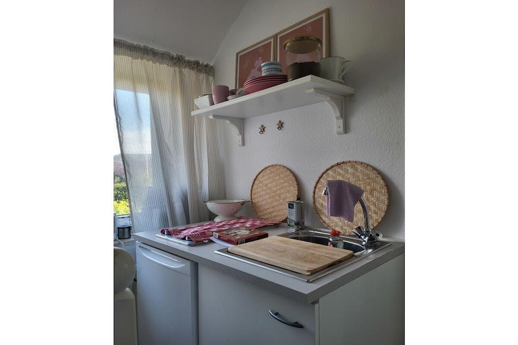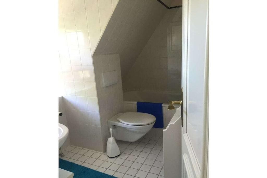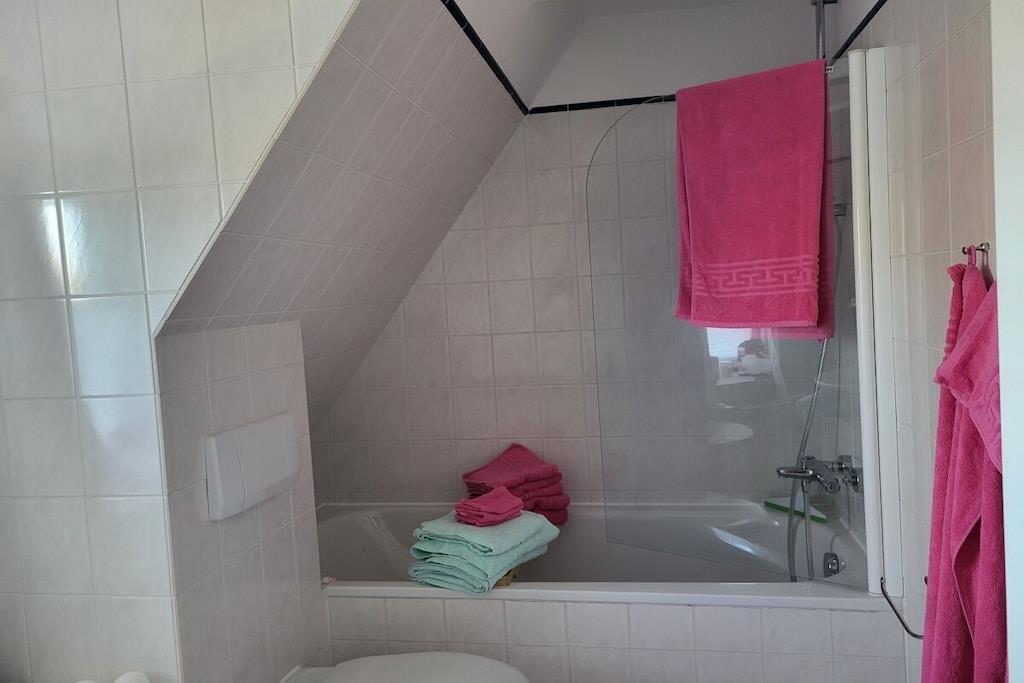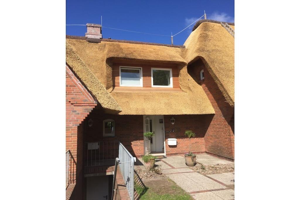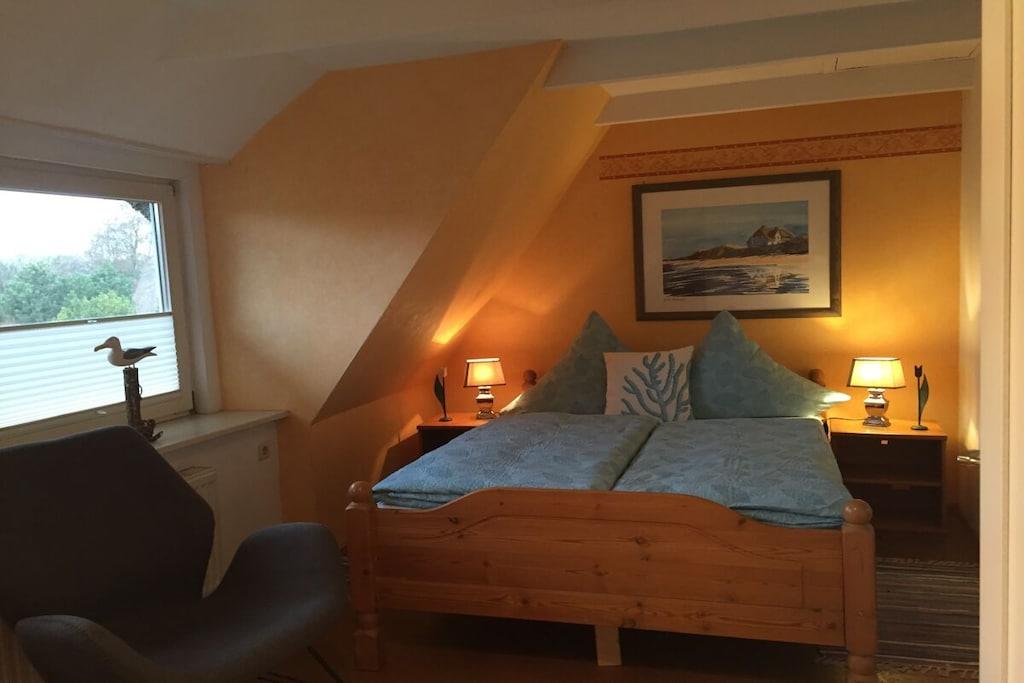 Dobbeltværelset ligger på øverste etage i den stråtækte ferielejlighed Tina. Det store, lyse værelse er indrettet med garderobe, dobbeltseng, lille bord, tekøkken og TV. Et stort lyst badeværelse ligger lige ved siden af værelset. Du når overetagen med separat adgang via en stor... En parkeringsplads er placeret lige udenfor hoveddøren. Ideelt beliggende, stille og alligevel meget centralt, med alle supermarkeder inden for gåafstand. Store enge er i umiddelbar nærhed. Adskillige hundevenlige strande ligger kun 5 minutter væk i bil.