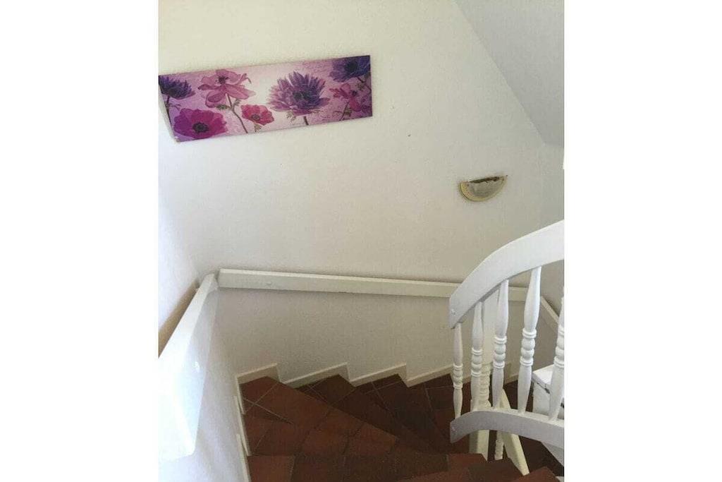 På 1. etage: (soveværelse(, , dobbeltseng, Fjernsyn), badeværelse(badekar, bruser, håndvask, toilet)) , , , Internetadgang, Internetadgang, varme, have(Græsplæne, solstole), parkering, cykler til rådighed