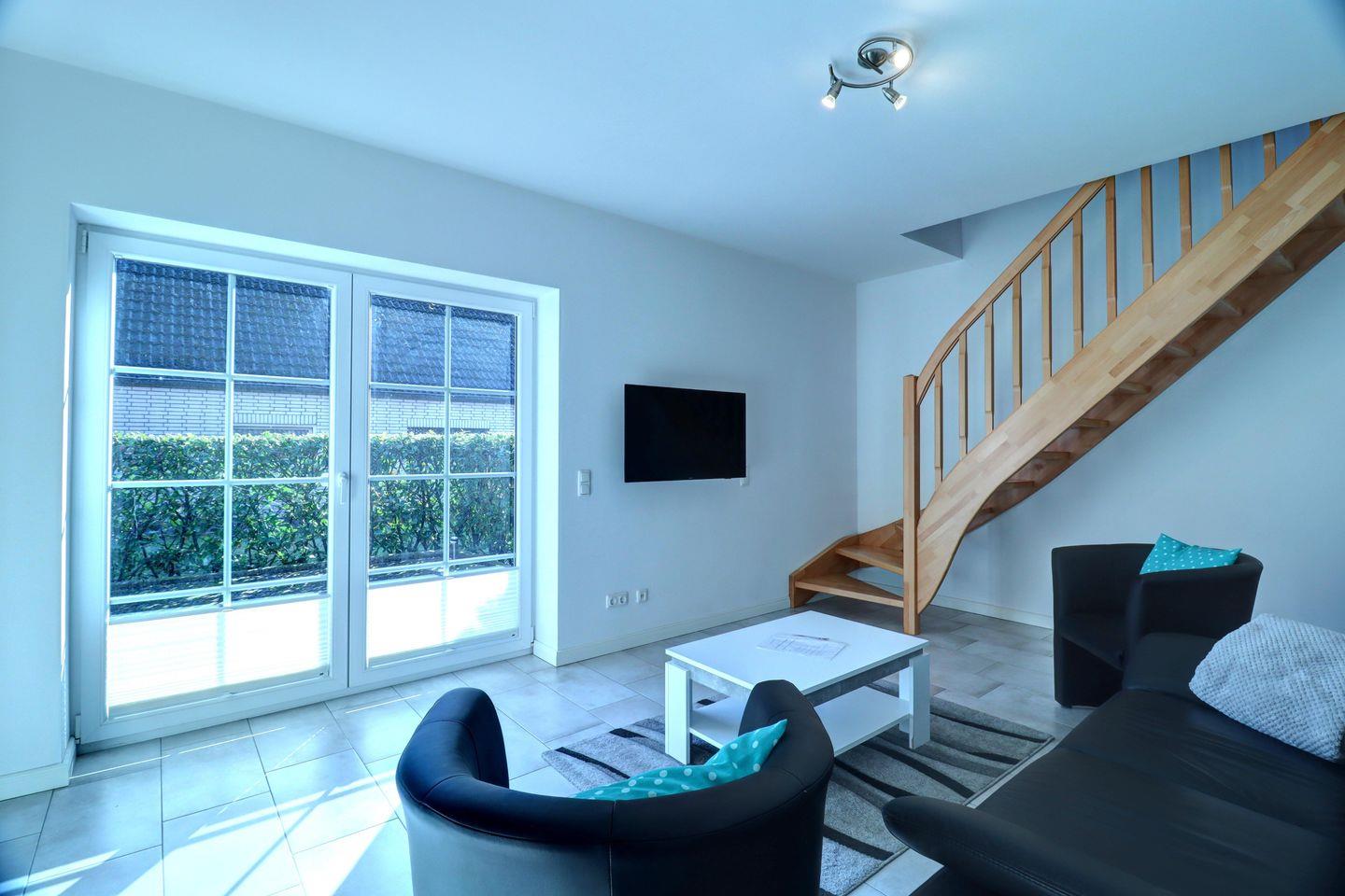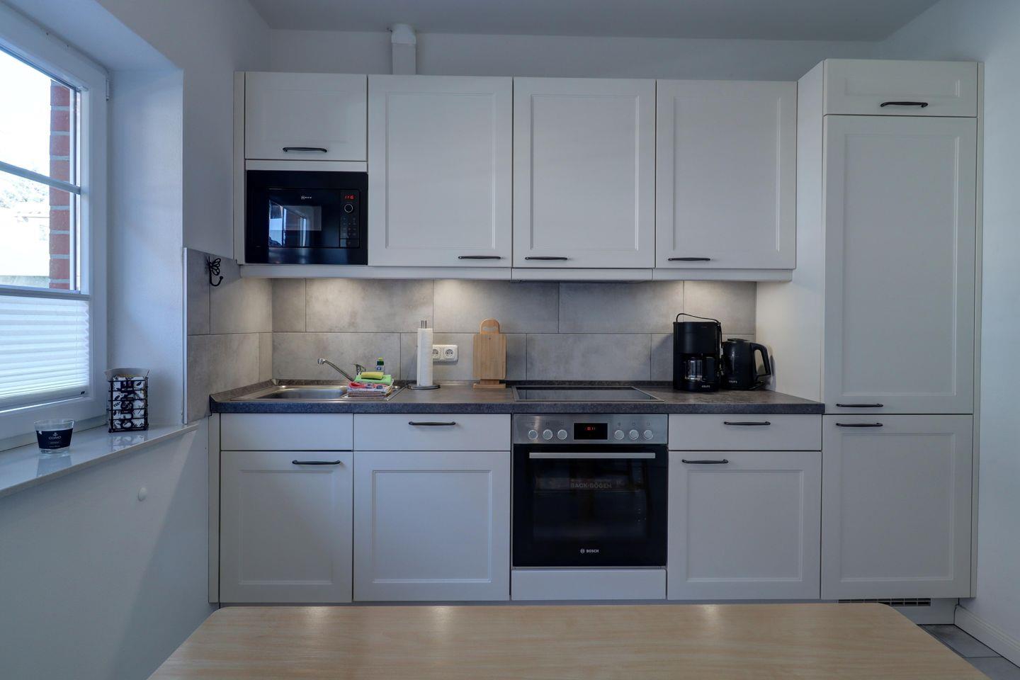 Der Wohnbereich ist offen gestaltet und mit Sofa, Sofaecke, TV und Esstisch ausgestattet. Die Küche ist zum Wohnzimmer hin geöffnet und verfügt über Herd, Backofen, Kühlschrank, Mikrowelle, Spülmaschine und Kaffeemaschine. Damit sind die Voraussetzungen für eine komfortable Selbstversorgung während Ihres Aufenthalts gegeben. Die Fußbodenheizung sorgt für ein angenehmes Wohngefühl.