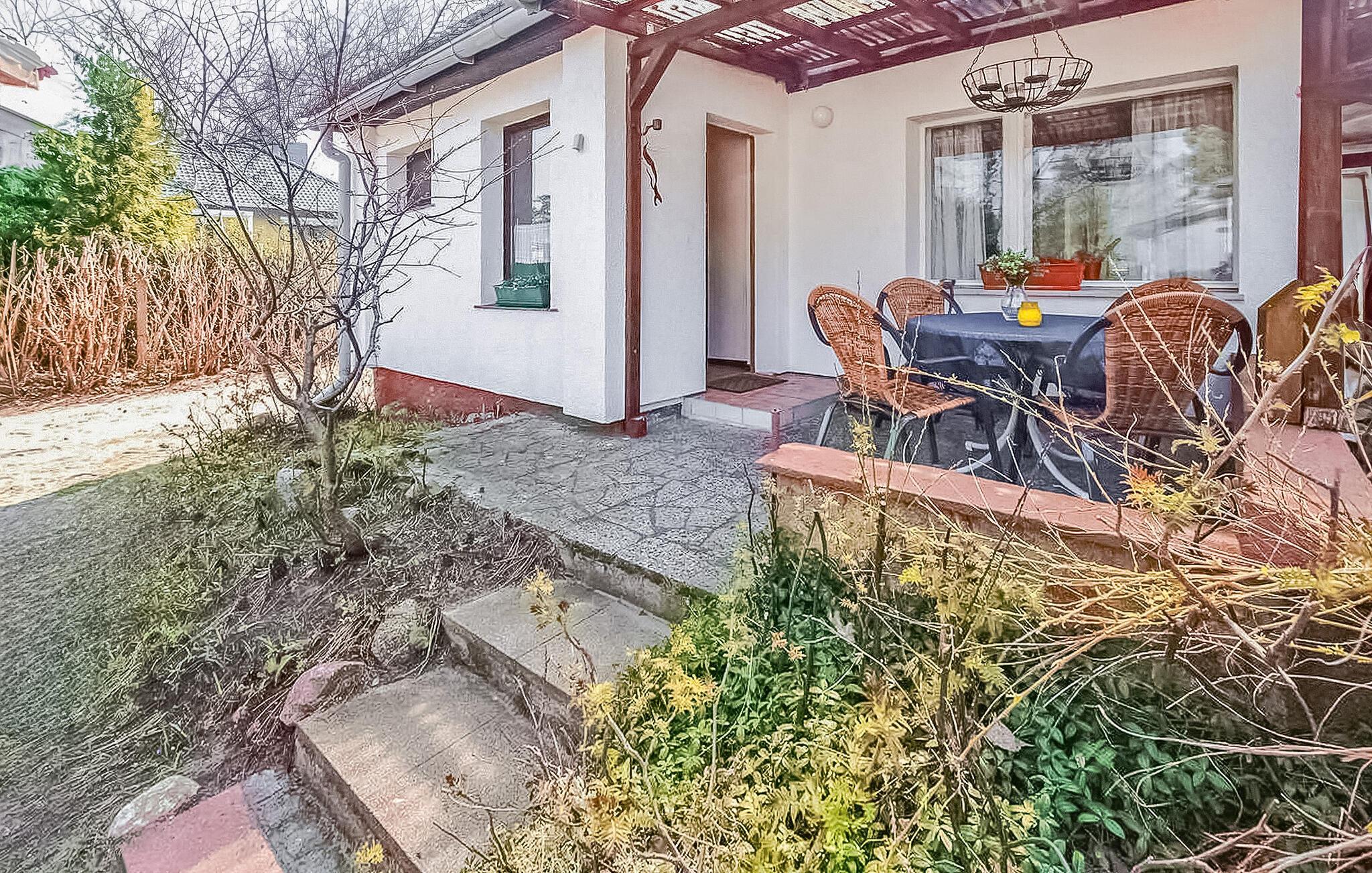 De otte feriehuse ligger på en 2500 kvm natur-/vandejendom direkte ved Szczecin-lagunen. Hvert sommerhus er individuelt og separat. En sti fører fra ejendommen direkte til stranden (ca. 50 m). Alle feriehuse har en møbleret terrasse eller udendørs opholdsområde med grill og parkeringsplads direkte ved bungalowen. En robåd, en tømmerflåde og en overdækket terrasse lige ved vandet med grill, rygeplads og bålplads står gratis til rådighed til fælles brug. Guidede motorbådsture er mulige efter aftale. Den samlede pris inkluderer: slutrengøring, sengelinned, håndklæder, vand og energiforbrug. Betales på stedet: turistskat. Kæledyr er ikke tilladt i denne ejendom. Dette feriehus er udstyret med en stue (hjørnesofa, spisebord og pejs), efterfulgt af 1 soveværelse med dobbeltseng, endnu et soveværelse med en lille dobbeltseng, spisekøkken, bad/toilet, elvarme. Bellin, et distrikt i havnebyen Ueckermünde, er et lille feriested i et skovområde direkte ved Szczecin-lagunen. Butikker, restauranter og to strande er i byen. Der er cirka 5 km til Ueckermünde med dens zoologiske have og havn. Herfra er udflugter med passagerskib til Polen og øen Usedom mulige.