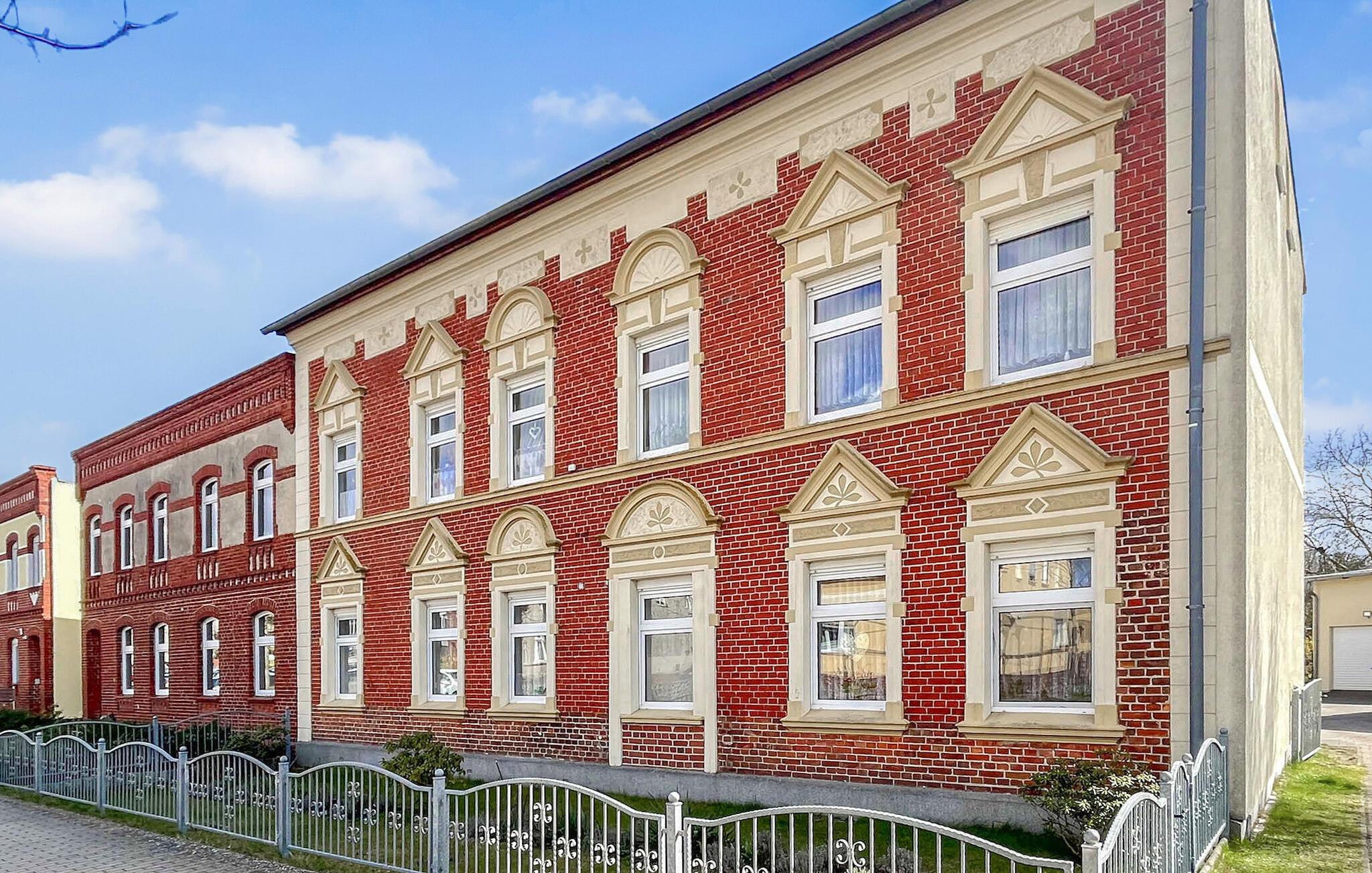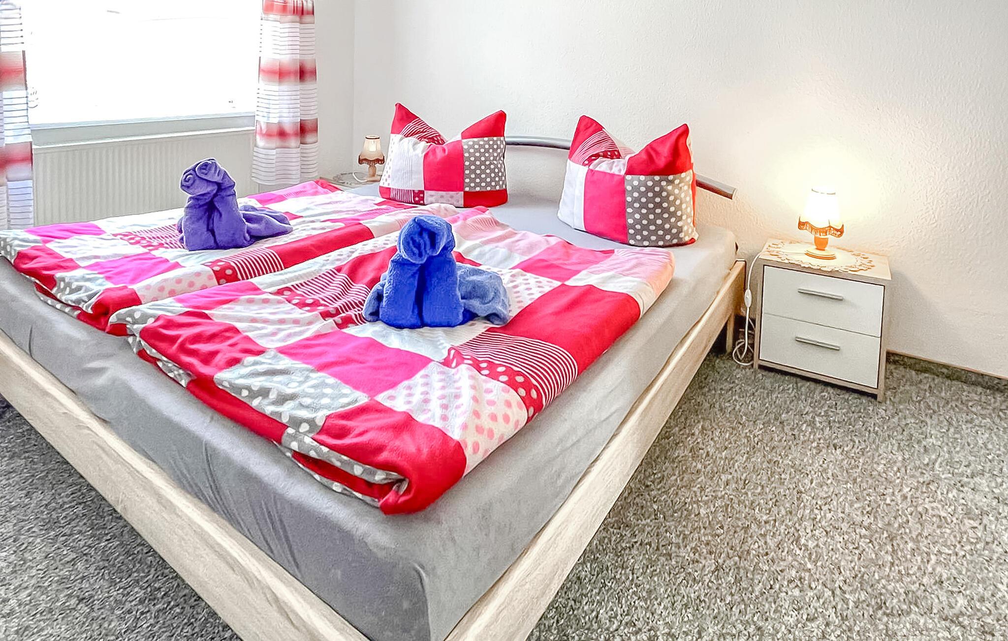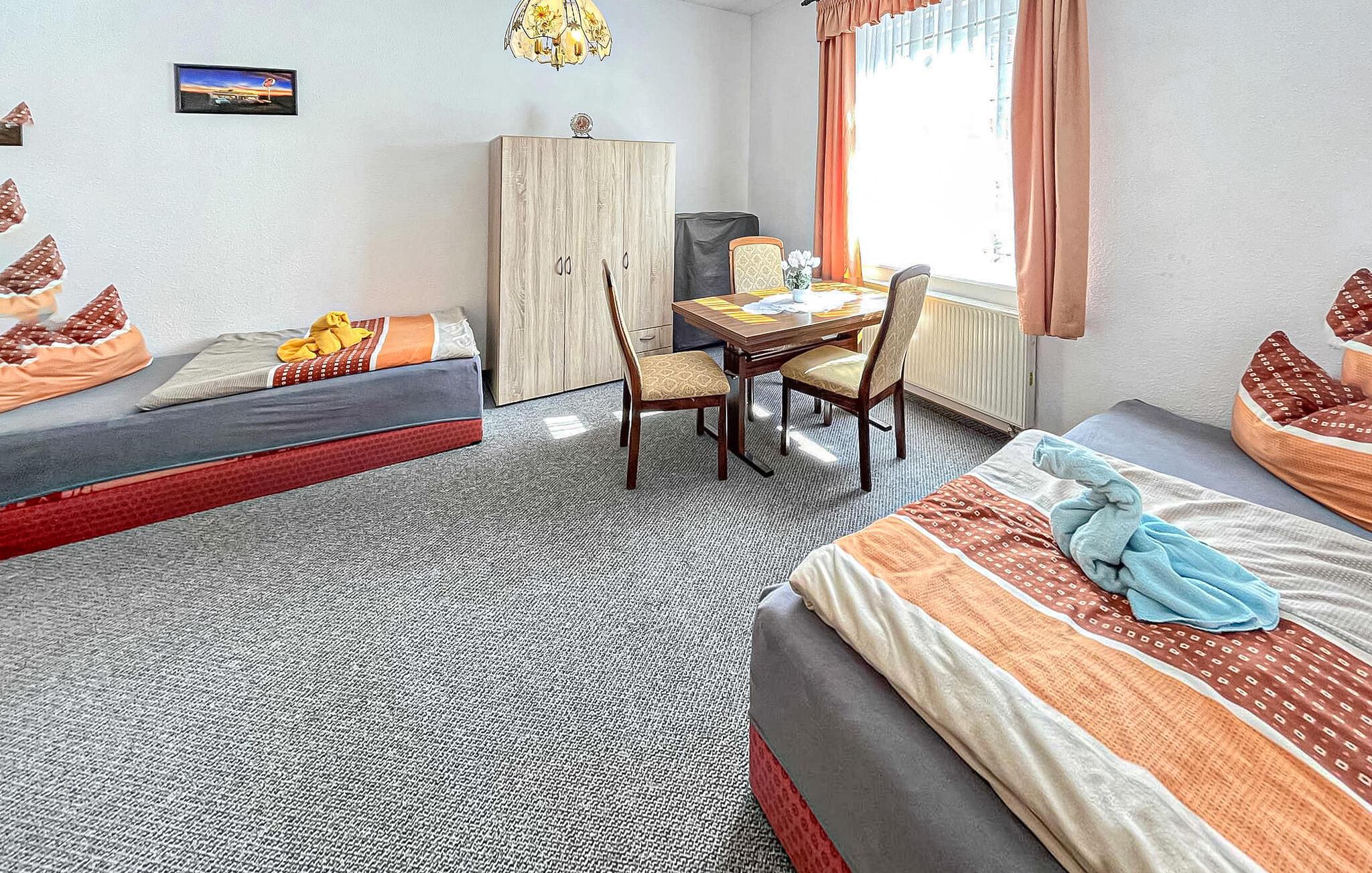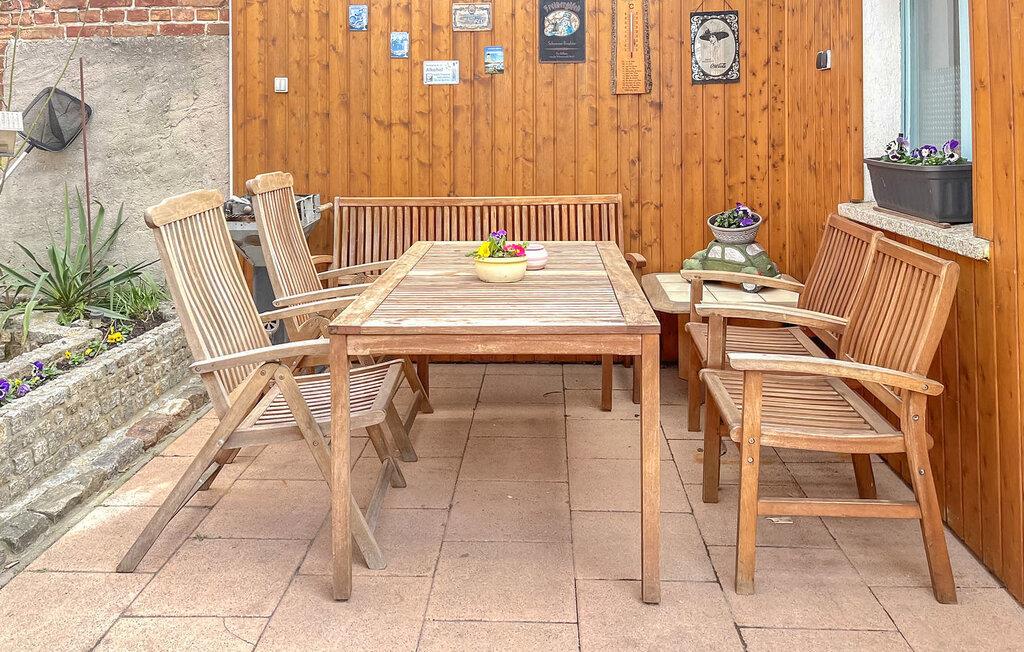 Ferielejligheden ligger i stueetagen i et privat hus lige ved siden af Ueckermünder Zoo. Ejeren bor på øverste etage. Den restaurerede gamle bydel med havnen ligger cirka 1 km væk, den udendørs swimmingpool på Szczecin-lagunen er cirka 4,5 km væk. Faciliteter med stue (polstret opholdsområde med sovefunktion, satellit-tv, radio), to soveværelser (dobbeltseng eller 2 polstrede liggestole, gæsteseng, der kan tilføjes), stort køkken med komplet tekøkken (elkomfur med ovn, opvaskemaskine, køleskab , spiseplads , diverse køkkenmaskiner), badeværelse med kar og toilet, centralvarme. Der er også gratis WiFi, et overdækket udendørs opholdsområde, en kulgrill, en parkeringsplads på ejendommen, en barneseng og høj stol, hvis det kræves, og et cykelrum. Den samlede pris inkluderer slutrengøring, sengelinned, håndklæder, vand og energiforbrug. Betales på stedet: turistskat. En lille hund op til en højde på 40 cm er tilladt. Badebyen Ueckermünde, den østligste tyske havneby ved Stettiner-lagunen, har omkring 12.000 indbyggere. I de senere år har det udviklet sig til en stærkt anbefalet ferieadresse. Der er blandt andet en gammel by, der er værd at se med cafeer, restauranter og indkøbsmuligheder, en lystbådehavn på Uecker med bådudlejning og passagerbådsture til Polen og øen Usedom, en smuk zoologisk have og en velholdt strand med en spa-park og promenade ved Szczecin-lagunen med restauranter, udlejning af strandstole og minigolf. Takket være det veludviklede netværk af cykel- og vandrestier kan de smukke, skovklædte omgivelser nemt udforskes selv uden bil. Lystfiskere vil finde de bedste forhold, især ved Uecker-floden.