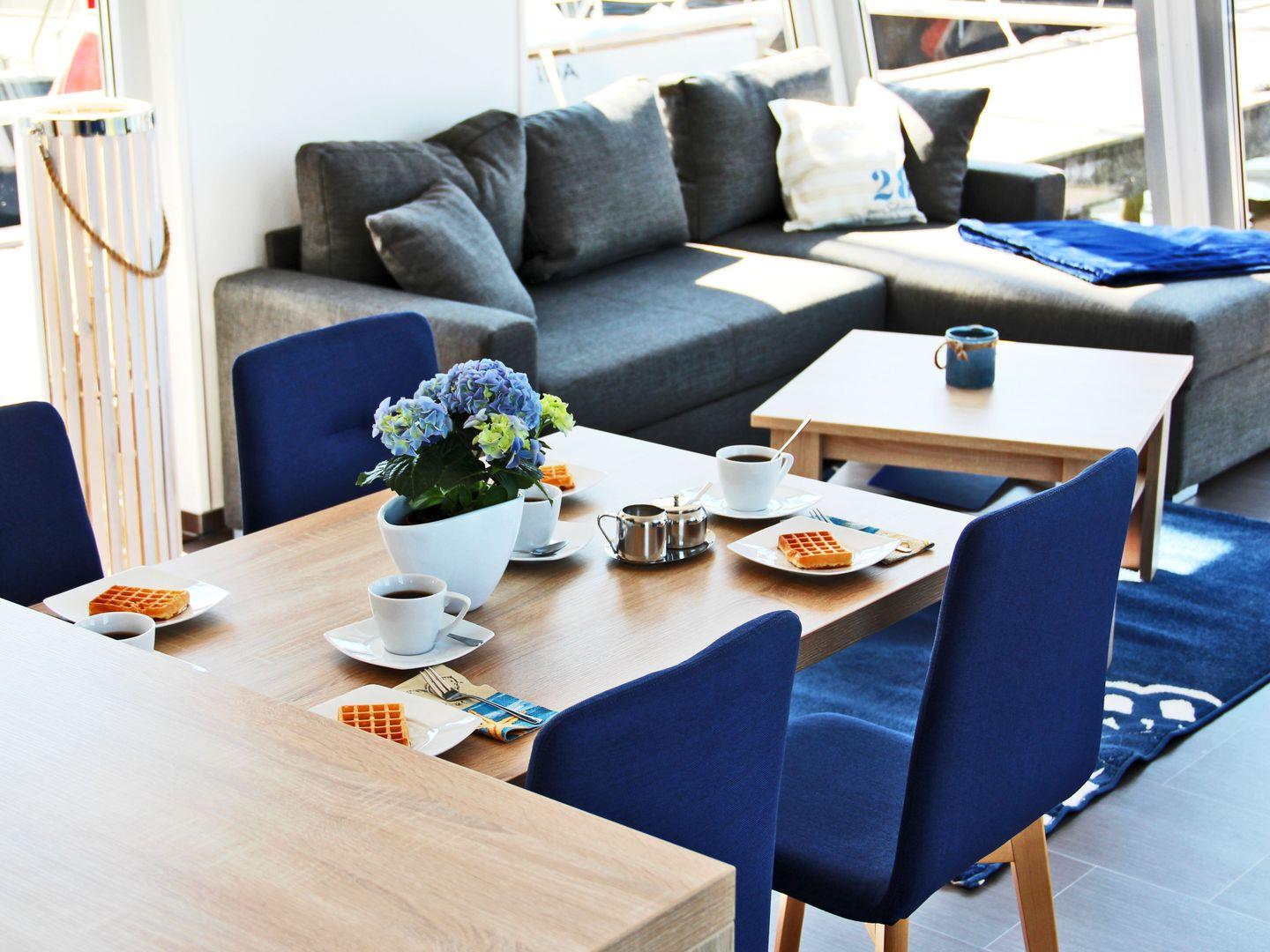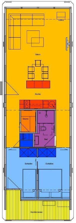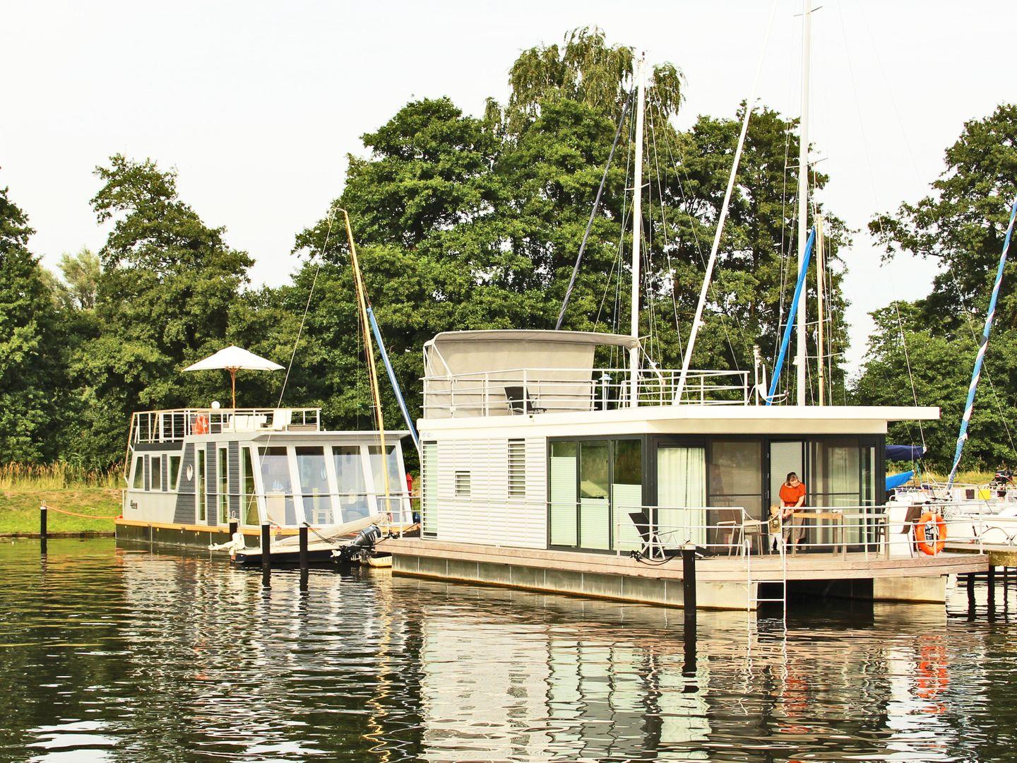 Wohnfläche ca. 55 qm, zusätzlich möblierte Dachterrasse, Länge Hausboot ca. 14,90 m; Breite ca. 4,80 m