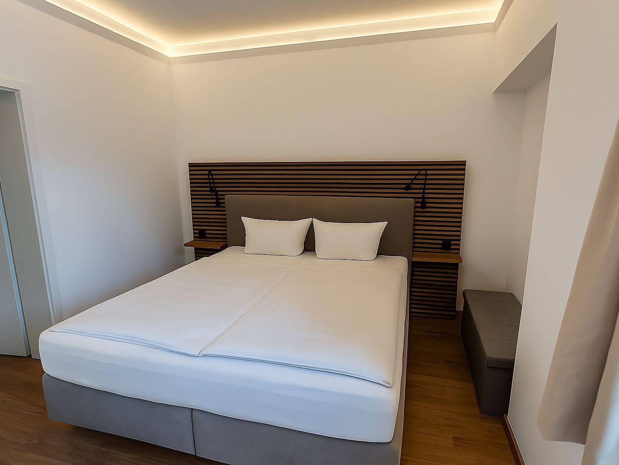 Schlafzimmer - Ruhe & Erholung: bequemes Boxspringbett mit Ambiente-Licht & Hintergrundbeleuchtung, Leselampen, Kommode & Kleiderständer, Verdunkelungsvorhänge & Thermo-Plissees für erholsamen Schlaf, Schallschutzfenster für angenehme Ruhe. Kinderbett auf Anfrage.