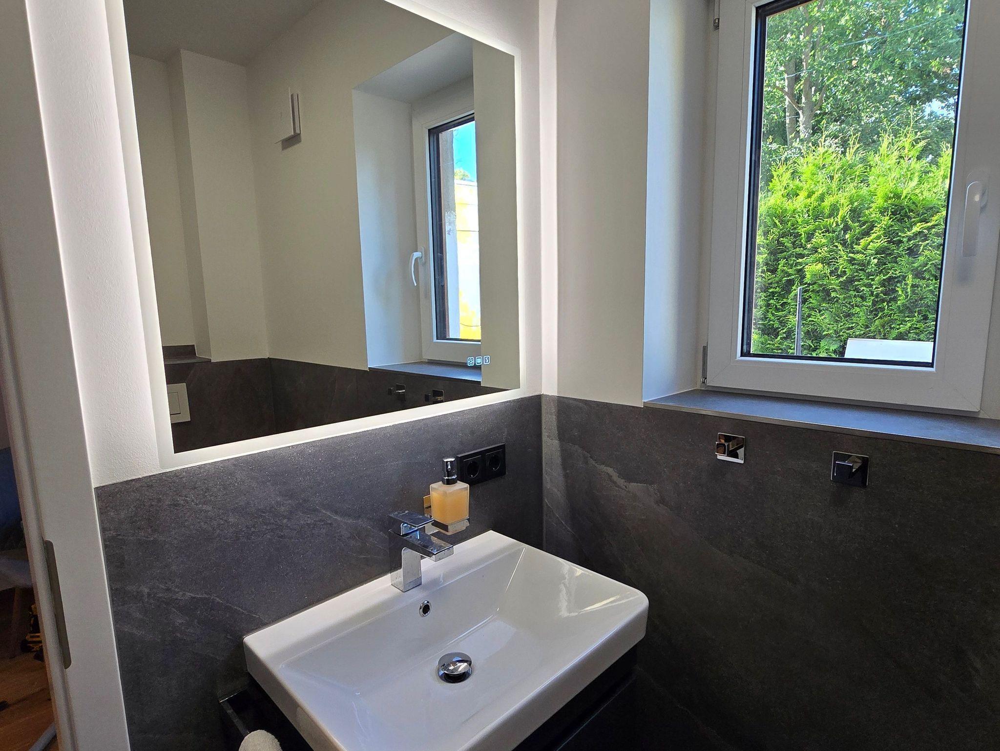 Badezimmer - Wellness für jeden Tag: ebenerdige Dusche mit großformatigen Fliesen und Massageduschkopf, Multifunktionsspiegel mit Bluetooth-Lautsprecher, Spiegelheizung & Beleuchtung, moderne Fußbodenheizung, automatische Abluftanlage, stilvoller Handtuchhalter & Seifenspender