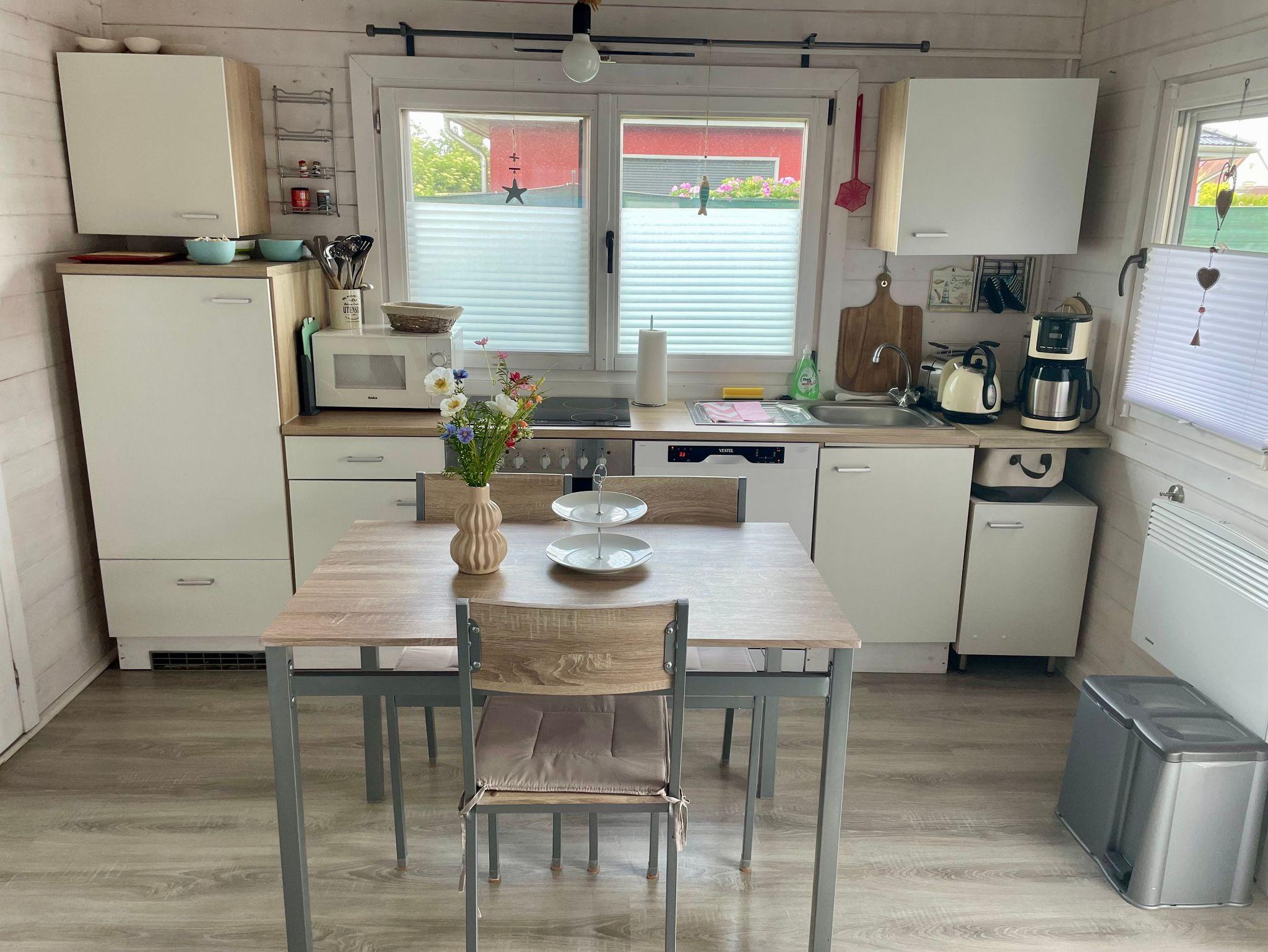 Unser Haffglück wurde im Frühjahr 2019 von uns fertig gestellt, erhielt 2025 einen neuen Außenanstrich und bietet für zwei Personen ausreichend Platz und Komfort zum Wohlfühlen. Es steht im hinteren Bereich auf einem eingezäunten Grundstück, wo Sie auf Gartenliegen entspannen, am Grill (Holzkohle) Essen zubereiten oder auf der Terrasse den Abend gemütlich ausklingen lassen können. Der Wohnraum ist mit einer offenen gut ausgestatteten Küche kombiniert. Das Schlafzimmer verfügt über ein Doppelbett 1,40 x 2,00 m (eine große Matratze) und einem Kleiderschrank. Unser Haus ist überwiegend mit Fliegenrollos ausgestattet.