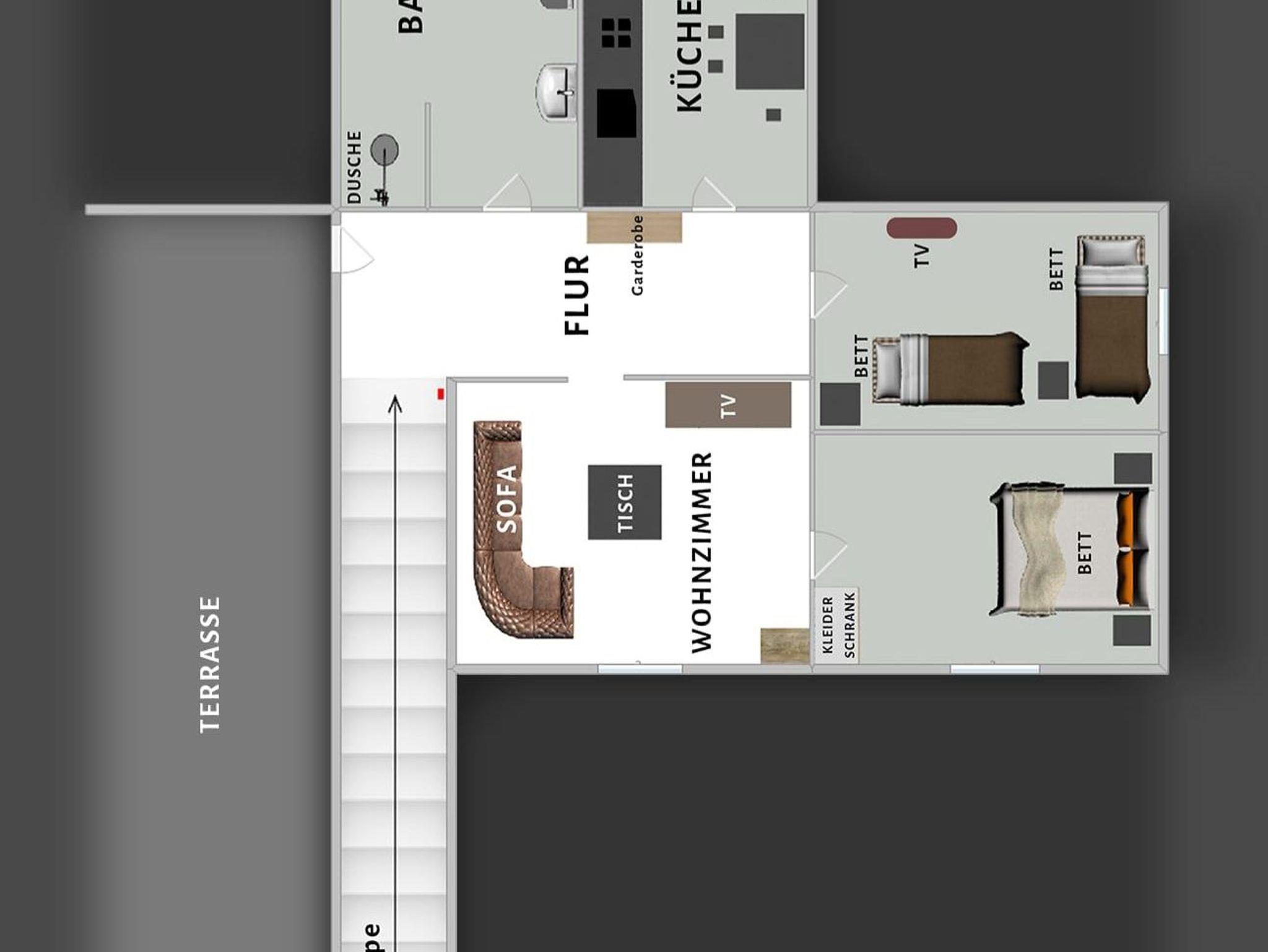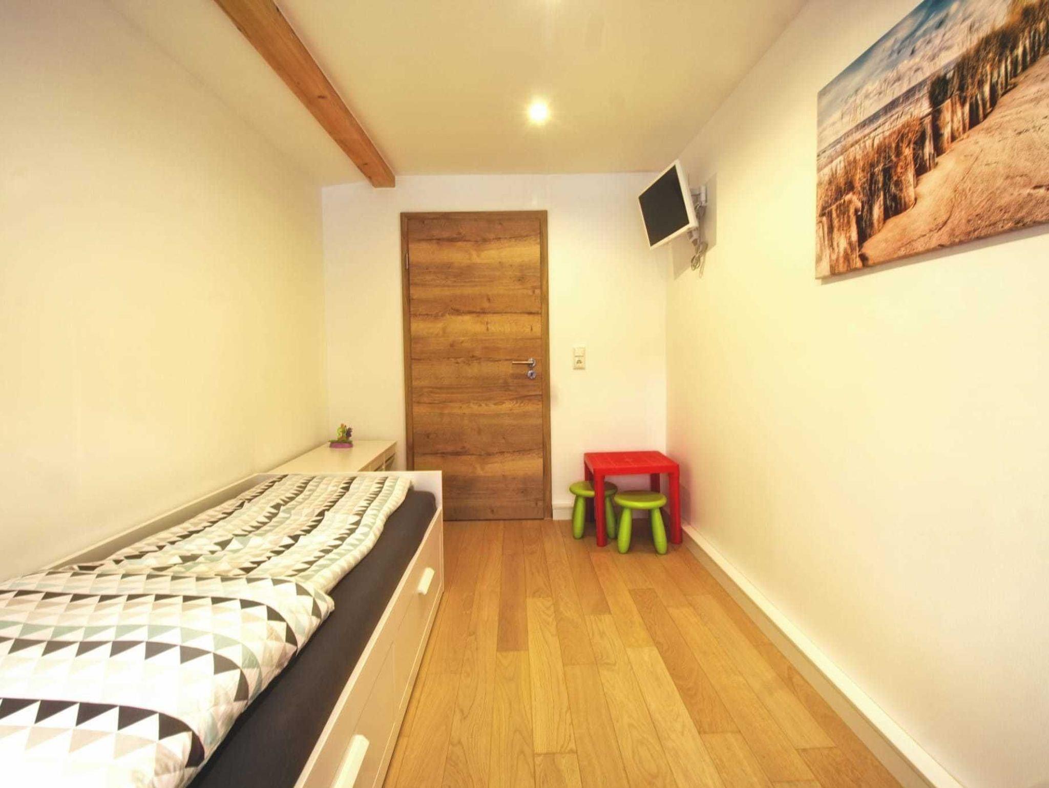(Doppelbett), einem zweiten Schlafzimmer (zwei Betten, Flachbildschirm), das man auch als Kinderzimmer nutzen kann, einer sehr geräumigen, voll ausgstatteten Küche (mit Sitzgelegenheiten), dem großen Bad (mit Kingsize-Dusche) und einem großen Flur (mit Garderobe, etc.). Auf Absprache ist auch Aufbettung möglich. Die Betten im Kinderzimmer und die Couch im Wohnzimmer lassen sich ausziehen. Wir möchten darauf hinweisen, dass die Wohnräume über eine Treppe zu erreichen sind.