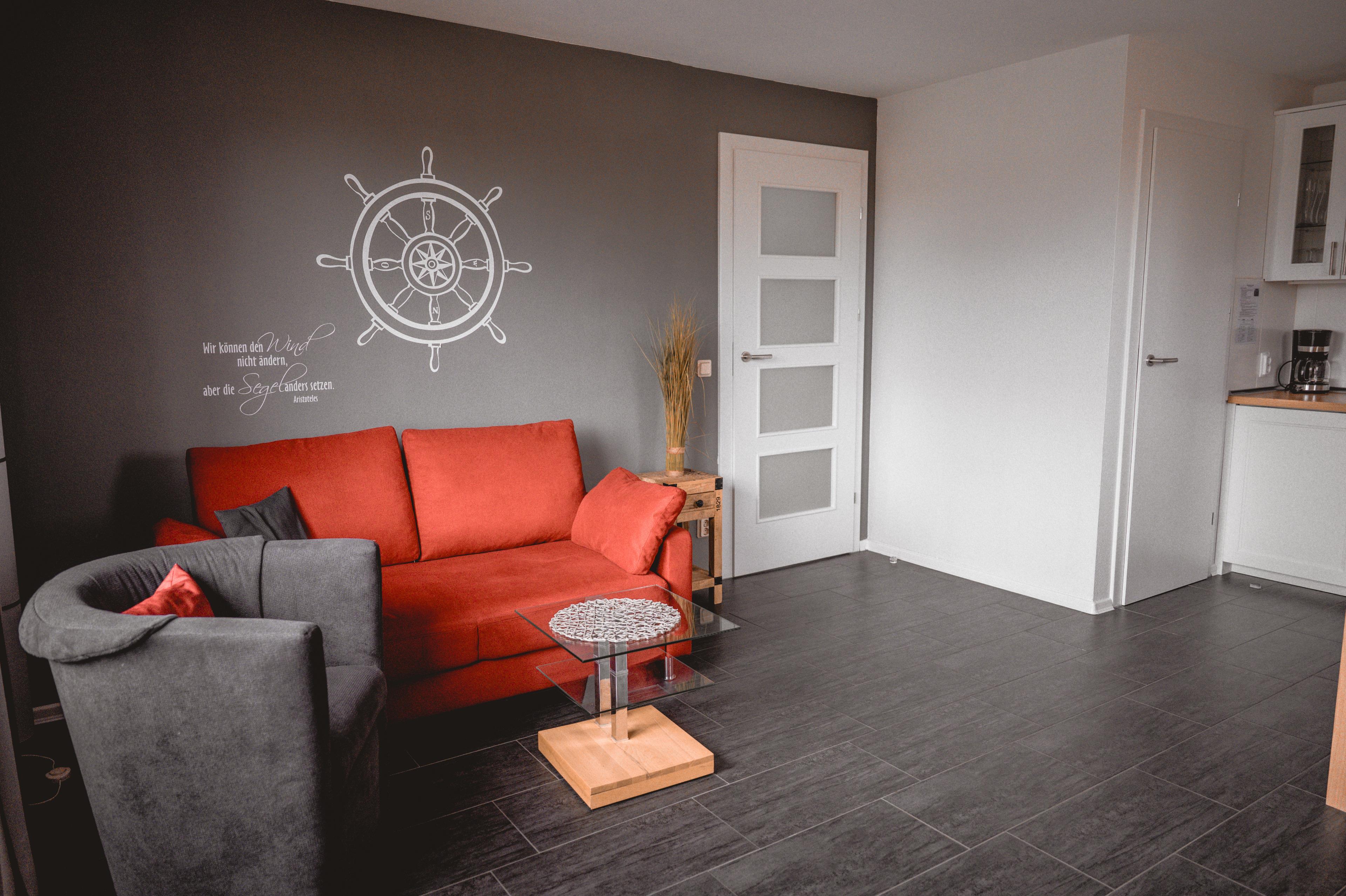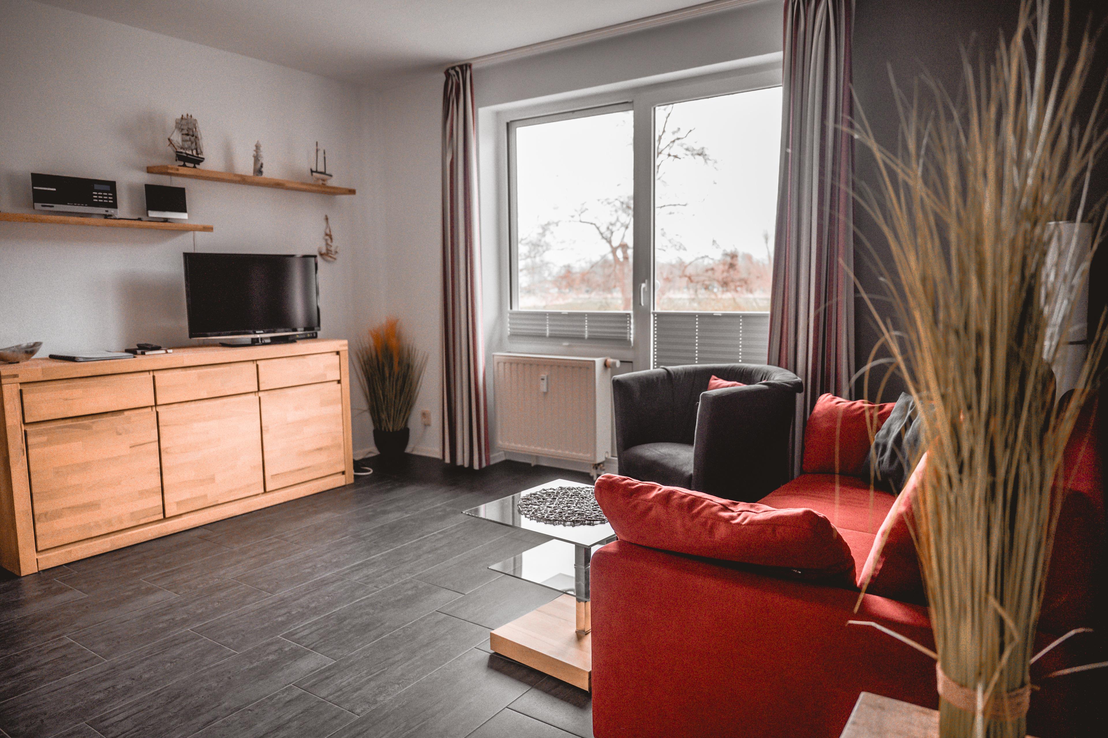 Ihr lichtdurchflutete Wohnzimmer verfügt über ein Sideboard aus Naturholz, ein ausziehbares Schlafsofa mit einem Schlafplatz für zwei Personen, einem Sessel und einen mittels Rollen leicht verschiebbaren Couchtisch. Ihre Ferienwohnung hat einen Kabelanschluss. Multimedial steht Ihnen hier ein Flachbildfernseher zur Verfügung. Auch einige Gesellschaftsspiele warten hier schon auf Sie.