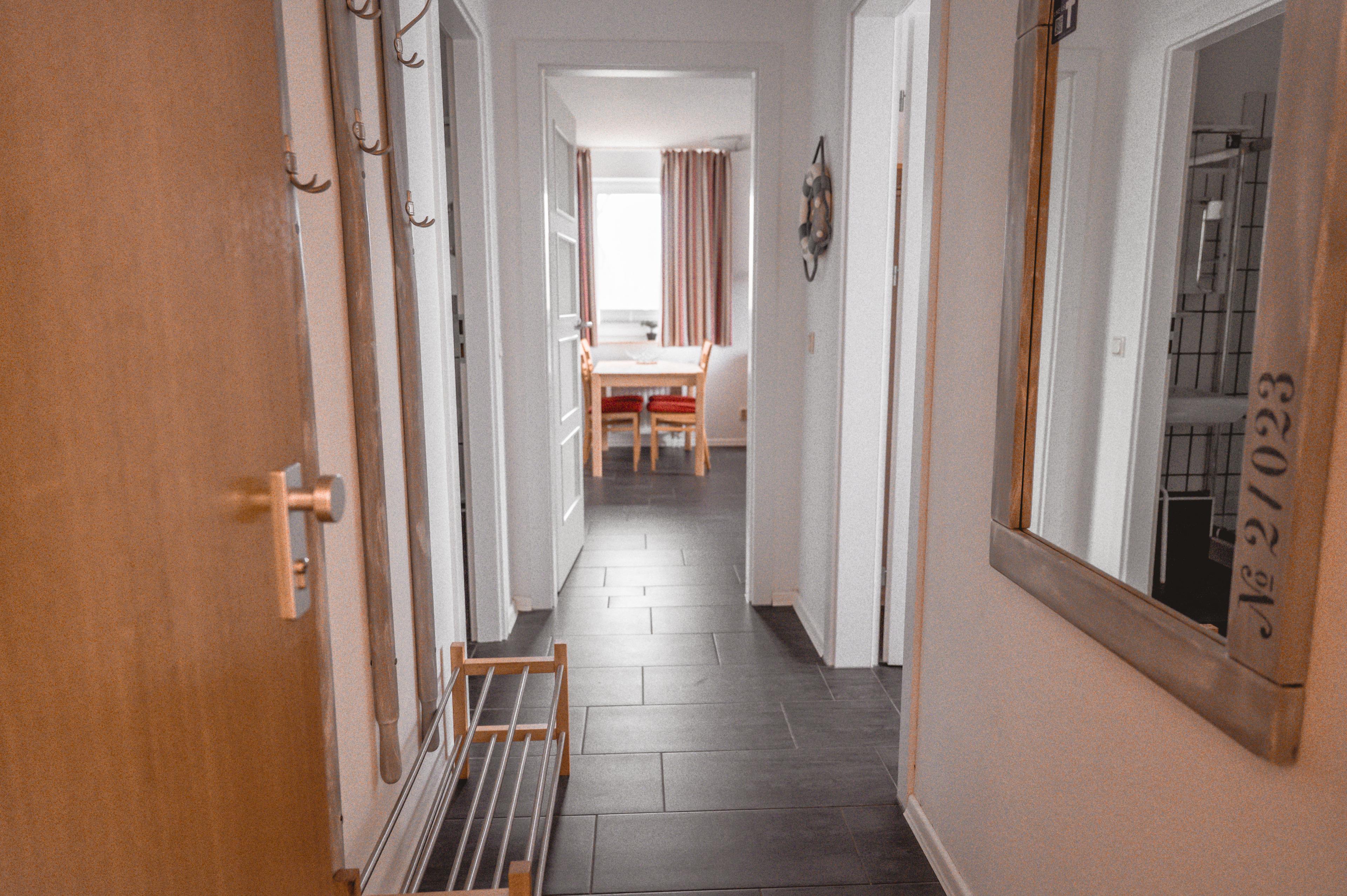 Ihre Küchenzeile ist zum Wohnzimmer hin offen, was den Raum großzügiger erscheinen lässt. In Ihrem offenen Wohn- und Essbereich steht Ihnen ein Esstisch mit vier Stühlen zur Verfügung. Die Küchenzeile ist sehr gut und hochwertig ausgestattet. Bestandteile sind unter anderem ein Ceran-Kochfeld, ein Geschirrspüler, ein Backofen, eine Mikrowelle, eine Kaffeemaschine sowie ein Kühlschrank mit Gefrierfach. Ihr Badezimmer hat eine Dusche mit Duschkabine, einen Spiegelschrank und einen Fön, natürlich haben Sie auch hier weitere Ablageflächen. Vom Flur, wo Sie eine Garderobe, eine Schuhablage und einen Wandspiegel vorfinden, gehen alle Räume ab. Zusätzlich hält die Ferienwohnung Steuerbord noch eine kleine Abstellkammer für Sie bereit. Die Ferienwohnung Steuerbord liegt im ersten Obergeschoss des Hauses Regatta im Eingang 1. In unmittelbarer Nähe dieses Appartements befinden sich weiter Ferienappartements unserer Gesellschaft. Eine gemeinsame Anmietung ist hier sehr gut möglich.