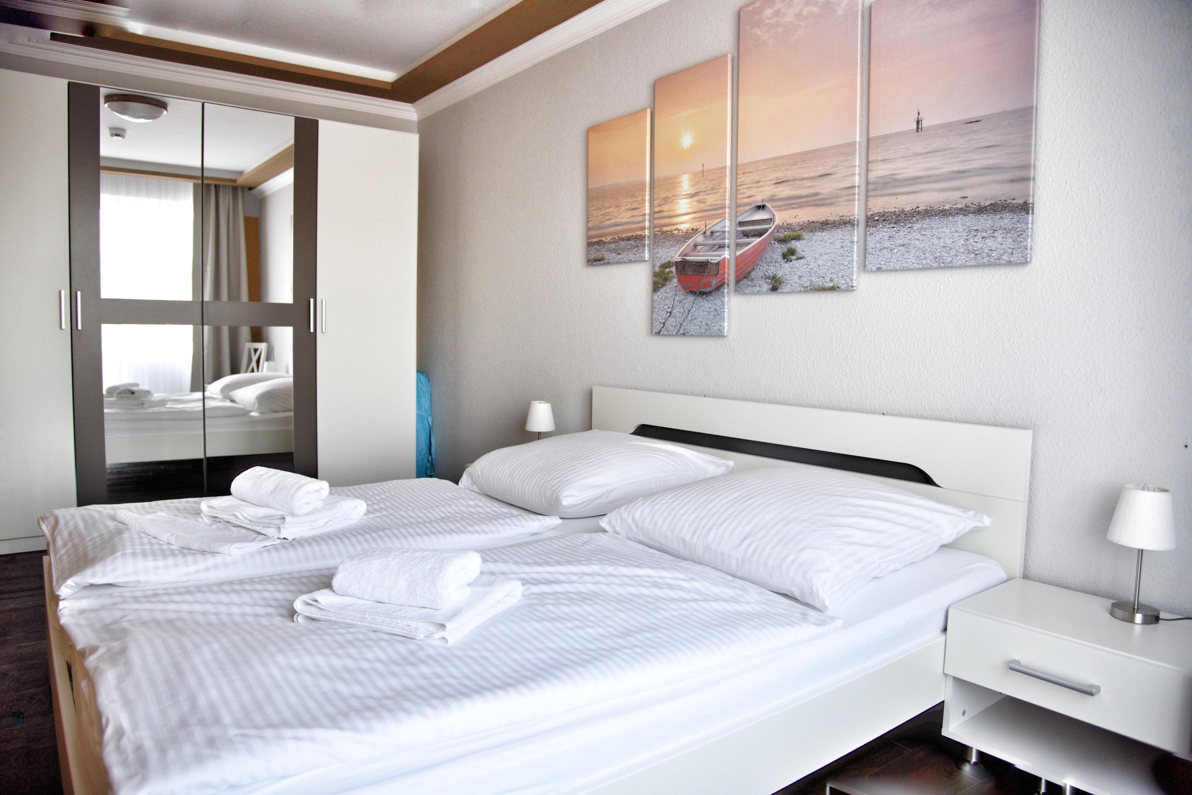 Ihr lichtdurchflutetes Wohnzimmer verfügt über einen Esstisch mit vier Stühlen und ein ausziehbares Schlafsofa mit einem Schlafplatz für zwei Personen. Sollten die Tage doch einmal weniger sonnig ausfallen, versüßt Ihnen die indirekte LED-Beleuchtung den Aufenthalt in der Wohnung. Die Wohnküche ist zum Wohnzimmer hin teiloffen, was den Raum noch großzügiger erscheinen lässt. Multimedial steht Ihnen hier ein großer, in die Wand eingelassener Flachbildfernseher zur Verfügung. Ihre Ferienwohnung verfügt über einen Kabelanschluss. Auch einige Gesellschaftsspiele dürfen hier im Bestand nicht fehlen. In Ihrem Schlafzimmer befindet sich ein Doppelbett mit höhenverstellbaren Lattenrosten. Nachtische und Leselampen möchten hier von Ihnen genutzt werden. Der große Schrank wird Ihnen gute Dienste leisten. Ihre Küchenzeile ist voll ausgestattet. Bestandteile sind unter anderem ein Cerankochfeld, eine Kaffeemaschine, viel Geschirr, eine Mikrowelle, eine Backofen sowie eine Kühl- und Gefrierkombination. Kulinarisch sind hier also keine Grenzen gesetzt. In Ihrem Badezimmer finden Sie eine ebenerdige Dusche mit Duschkabine und Ablageflächen vor. Ihr Flur beherbergt eine Garderobe und einen großen Spiegel für Sie. . Das Appartement Flip liegt im Erdgeschoss des Hauses Wikinger, im Eingang 4. In unmittelbarer Nähe dieses Appartements befinden sich weitere Ferienwohnungen unserer Gesellschaft. Eine gemeinsame Anmietung ist hier sehr gut möglich.