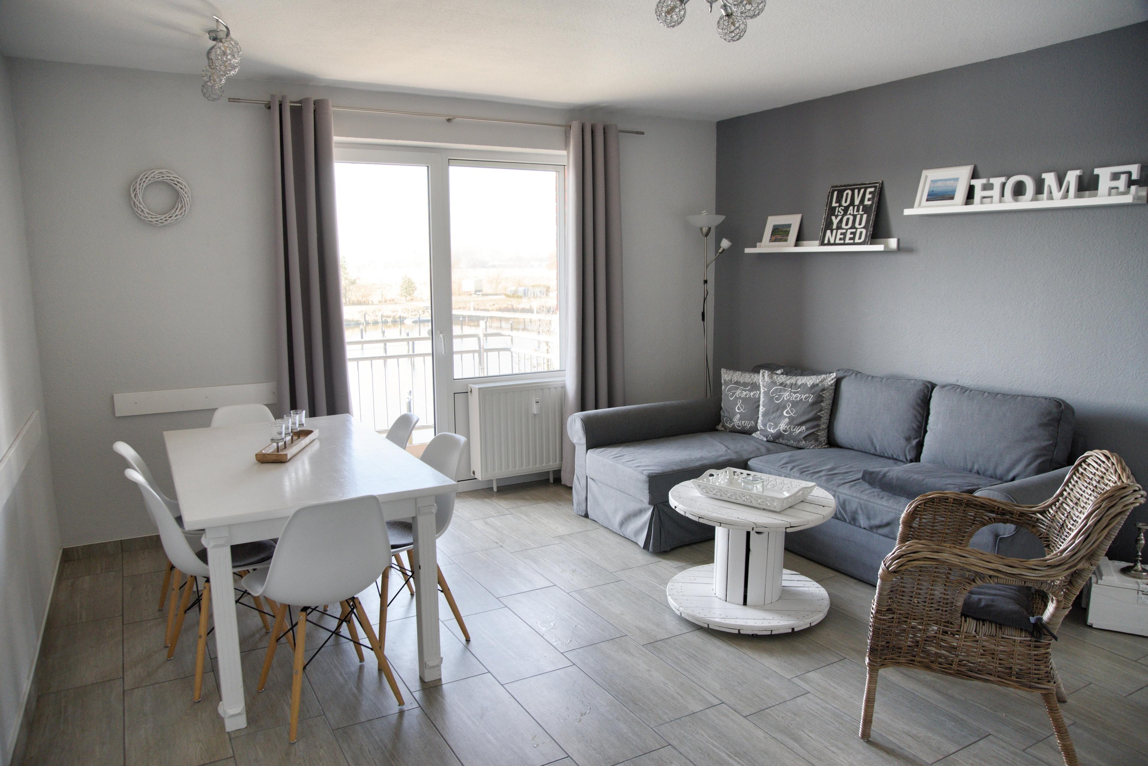 Bei der Ferienwohnung Rah handelt es sich um eine hochwertig eingerichtete, maritim geprägte Nichtraucherwohnung, die sich auf 61 Quadratmeter erstreckt. Aus jedem Fenster und auch von den beiden südlich ausgerichteten Balkonen aus blicken Sie direkt auf die Hafenanlagen der Marina. Auf den beiden Balkonen stehen Ihnen Gartenstühle, ein Tisch und ein Sonnenschirm zur Verfügung. In den beiden Schlafzimmern und auch im Wohnzimmer sind die Fenster bodentief. So können Sie vom Bett aus die Boote im Hafenbecken fahren sehen.