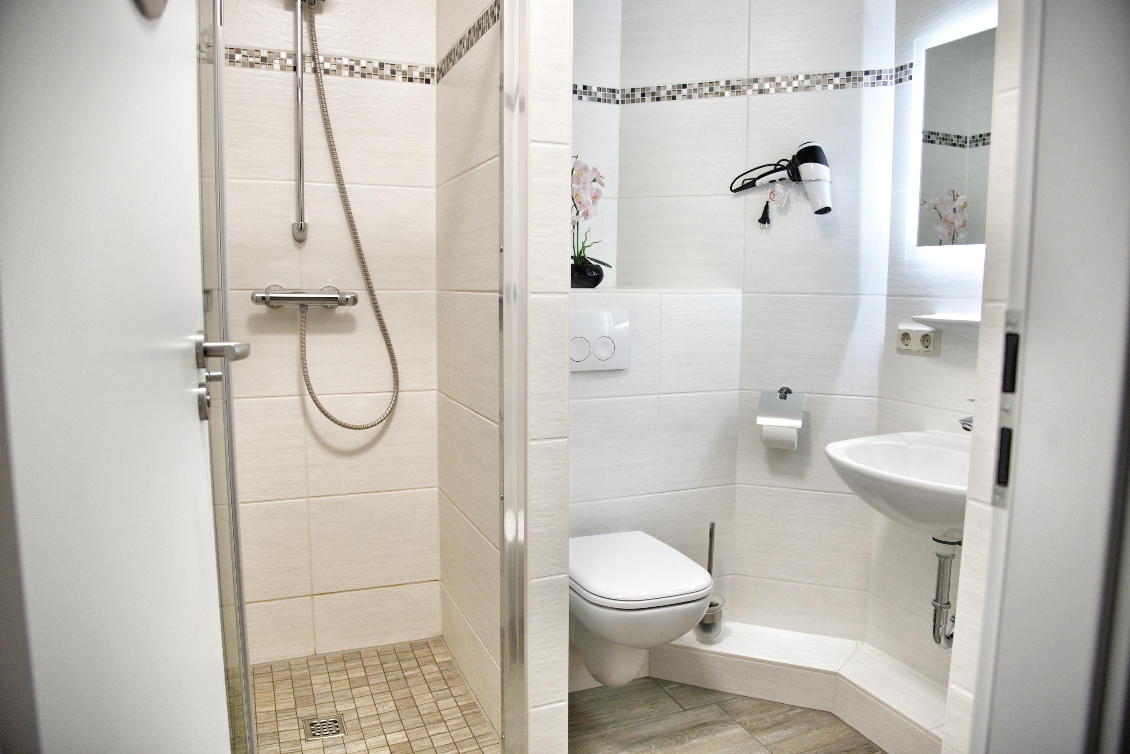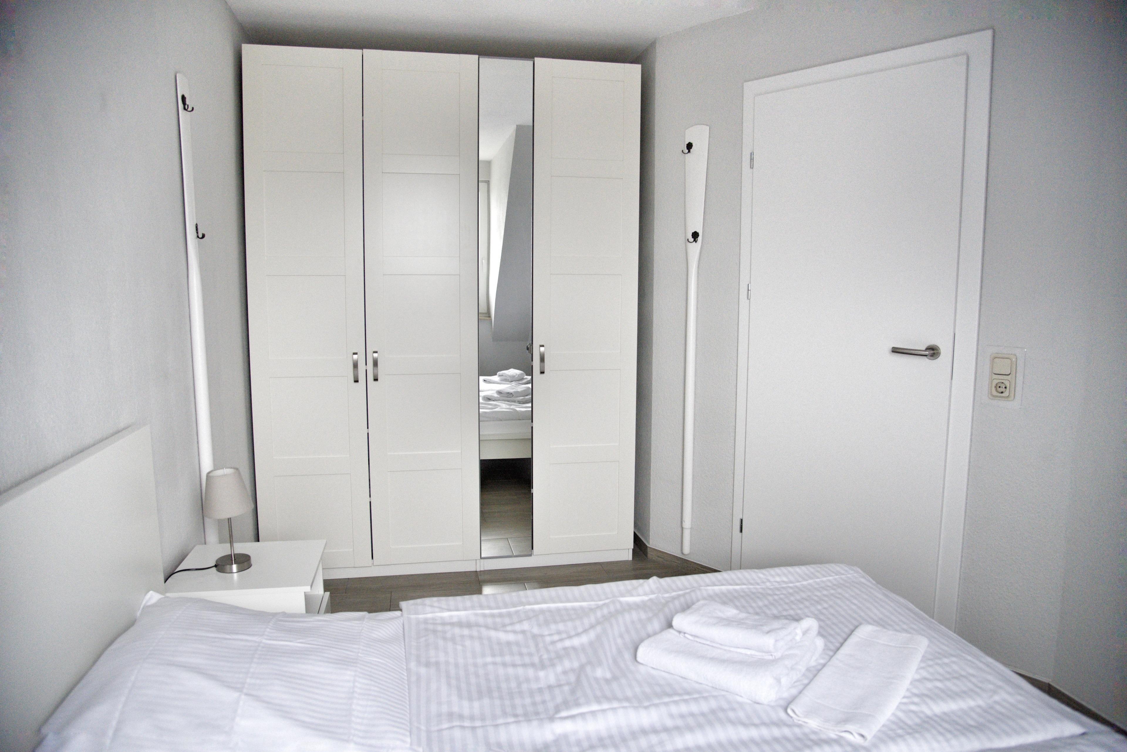 Das lichtdurchflutete Wohnzimmer verfügt über einen Esstisch mit vier Stühlen, ein ausziehbares Schlafsofa mit einem Schlafplatz für zwei Personen und einem Sessel. Die neu eingerichtete Wohnküche ist zum Wohnzimmer hin offen, was den Raum noch weitläufiger erscheinen lässt. Multimedial stehen Ihnen hier ein Flachbildfernseher zur Verfügung. Die Ferienwohnung hat einen Kabelanschluss. Auch einige Gesellschaftsspiele dürfen natürlich nicht im Bestand fehlen. Im Schlafzimmer finden Sie ein komfortables Doppelbett mit höhenverstellbaren Lattenrosten sowie einem großzügig bemessenen Kleiderschrank mit vielfältigen Ablagemöglichkeiten vor. Ihr Kofferinhalt findet hier allen Platz. Die Küchenzeile ist voll ausgestattet. Bestandteile sind unter anderem ein Cerankochfeld, eine Kaffeemaschine, ein Backofen, viel Geschirr, ein Geschirrspüler sowie ein Kühlschrank mit kleinem Gefrierfach. Verwöhnen Sie sich und Ihre Lieben mit und in dieser superpraktischen Küche. Das Badezimmer hat eine Dusche mit Duschkabine und natürlich haben Sie auch hier viele Ablageflächen. Im Flur finden Sie eine Flurgarderobe und eine Abseite vor. Die Flurgarderobe und der große Spiegel werden den Dienst in Ihrem Sinne erfüllen. Das Appartement Fleet liegt im zweiten Obergeschoß des Hauses Wikinger, im Eingang 3. In unmittelbarer Nähe dieses Appartements befinden sich weitere Ferienappartements unserer Gesellschaft. Eine gemeinsame Anmietung ist hier sehr gut möglich.
