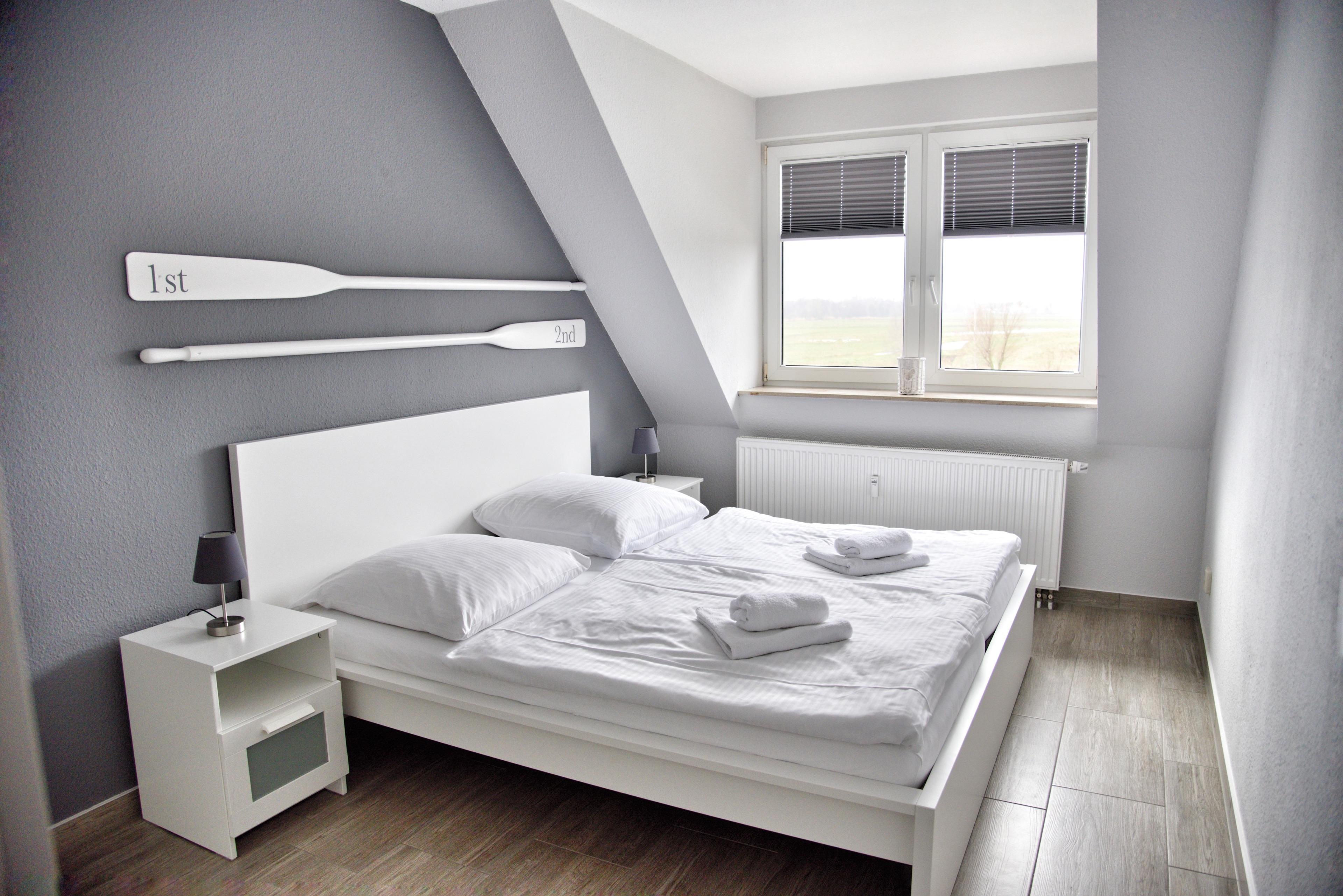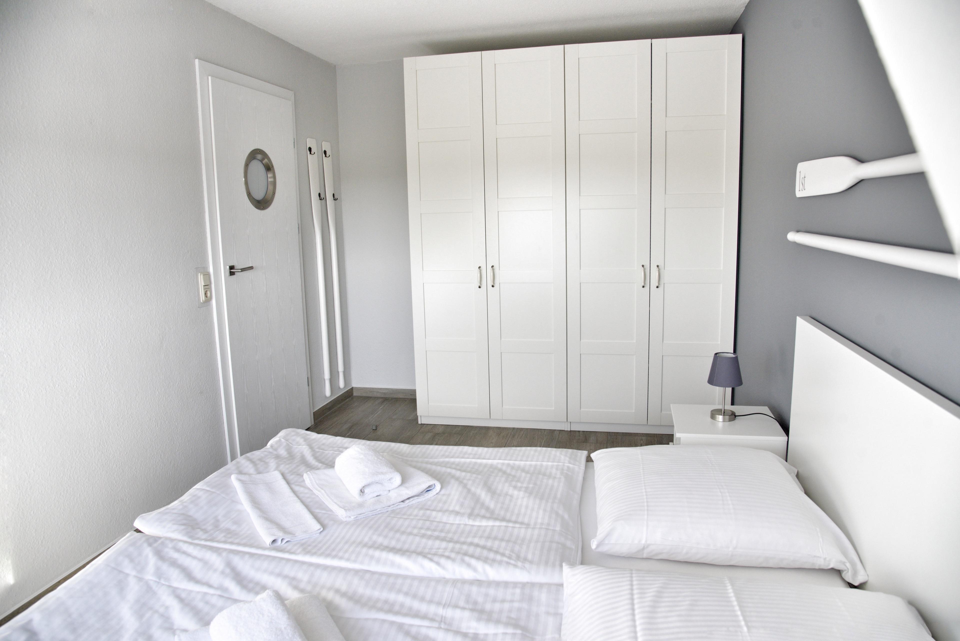 Das Wohnzimmer verfügt über einen großen Esstisch mit zwei Sitzbänken, ein ausziehbares Schlafsofa mit einem Schlafplatz für zwei Personen und einen Sessel. Multimedial stehen Ihnen ein Flachbildfernseher zur Verfügung. Ihre Ferienwohnung hat einen Kabelanschluss. Auch einige Gesellschaftsspiele warten hier schon auf Sie. Die beiden Schlafzimmer sind identisch groß und annähernd gleich geschnitten. In beiden Schlafzimmern stehen Ihnen ein Doppelbett, Nachttische und jeweils zwei große Kleiderschränke zur Verfügung. Ihre große Küche ist für Sie voll ausgestattet. Bestandteile sind unter anderem ein Kochfeld, ein Backofen, eine Kaffeemaschine, eine Mikrowelle, viel Geschirr, eine Kühlschrank mit kleinem Gefrierfach sowie weiteres Equipment für Ihren kulinarischen Einfallsreichtum. Das Badezimmer hält eine Dusche mit Duschkabine, Ablageflächen und einen Fön für Sie bereit. All Ihre Utensilien finden hier ausreichend Platz.