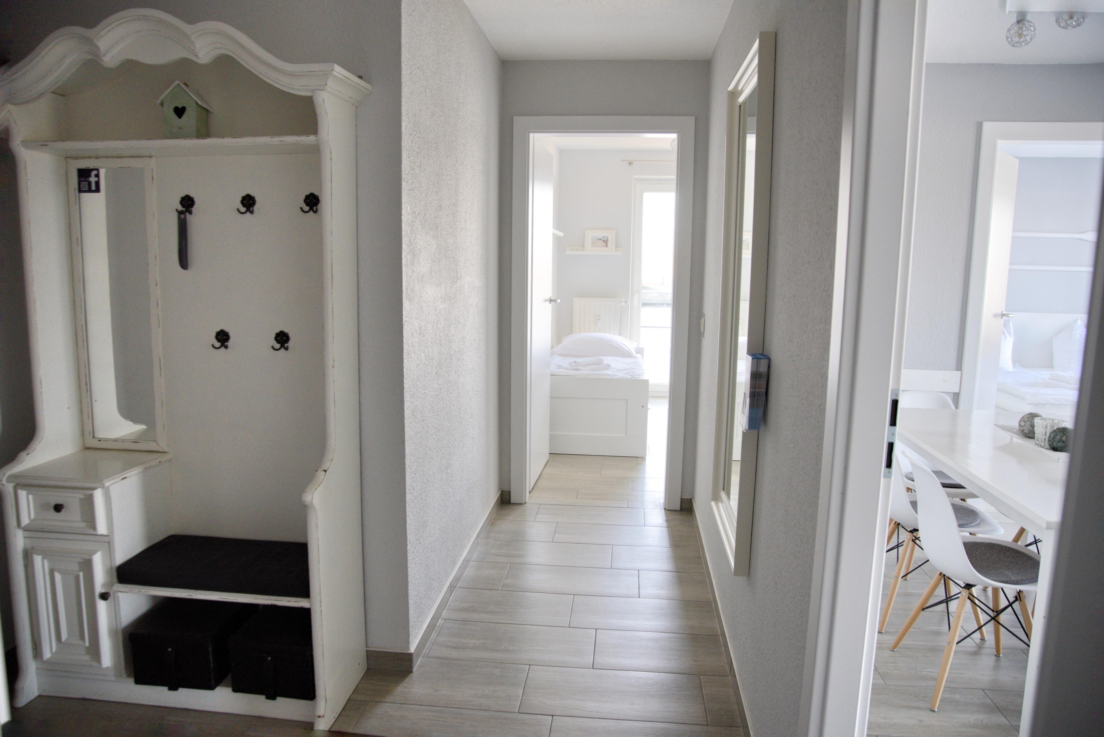 Ihr Wohnzimmer verfügt über einen Esstisch mit sechs Stühlen, ein ausziehbares Klappsofa mit einem Schlafplatz für zwei Personen und einen Sessel. Multimedial steht Ihnen ein Flachbildfernseher zur Verfügung. Ihre Ferienwohnung hat einen Kabelanschluss. Auch einige Gesellschaftsspiele warten hier schon auf Sie. In Ihrem großen Schlafzimmer befindet sich ein Doppelbett mit höhenverstellbaren Lattenrosten. Nachtische, Leselampen und Garderoben möchten hier von Ihnen genutzt werden. Der große Schrank wird Ihnen gute Dienste leisten. Im kleinen Schlafzimmer sind zwei Einzelbetten für Sie vorhanden. Auch hier befinden sich weitere Ablagen und ein Kleiderschrank. Ihre große Sterneküche ist für Sie voll ausgestattet. Bestandteile sind unter anderem ein Cerankochfeld mit Backofen, Kaffeemaschine, Mikrowelle, viel Geschirr, ein Geschirrspüler, eine große Kühl- und Gefrierkombination und weiteres Equipment. Ein besonderes Highlight ist hier der kleine Bistrotisch am Fenster. Dort können Sie bei einer Tasse Kaffee den Möwen und Fischreihern im Hafenbecken zuschauen. Das Badezimmer hält eine Badewanne mit Duschecke für Sie vor. Ablageflächen und einen Fön warten hier schon auf Sie. All Ihre Mitbringsel finden hier ausreichend Platz. Der Flur ist mit einer Garderobe, einem Spiegel und Abstellmöglichkeiten für Reinigungsgeräte ausgestattet. Das Appartement Anker liegt im Erdgeschoß des Hauses Störtebeker, im Eingang 1. In unmittelbarer Nähe dieses Appartements befinden sich weitere Ferienappartements unserer Gesellschaft. Eine gemeinsame Anmietung ist hier sehr gut möglich.