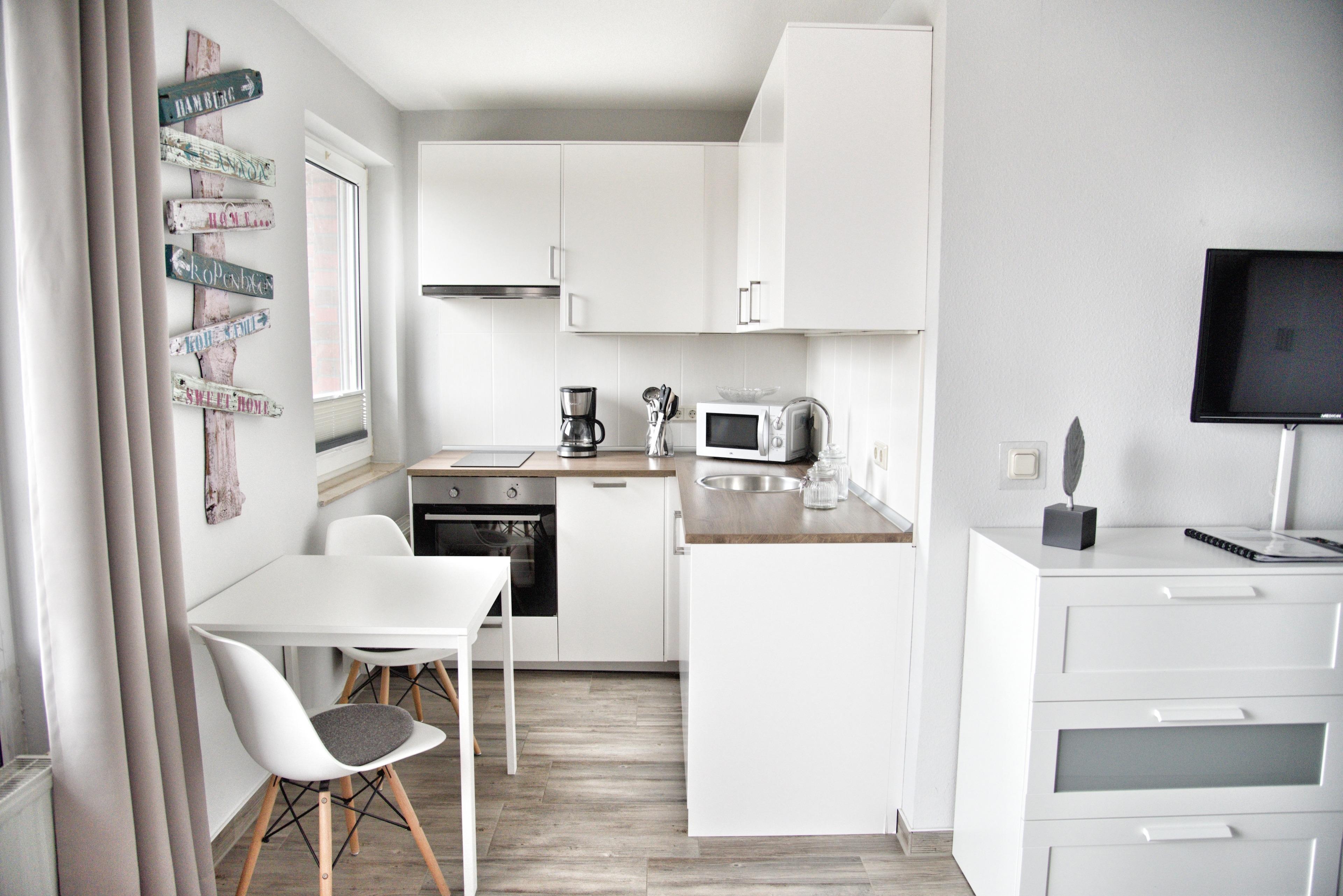 Im offenen Wohn- und Essbereich steht Ihnen ein Esstisch mit drei Stühlen zur Verfügung. Die Küchenzeile ist für ein Appartement gut ausgestattet. Bestandteile sind unter anderem ein Kochfeld, eine Kaffeemaschine, eine Mikrowelle sowie ein Kühlschrank. Multimedial stehen Ihnen hier ein Flachbildfernseher mit Kabelanschluss zur Verfügung. Auch einige Gesellschaftsspiele dürfen nicht im Bestand fehlen. Beidseitig Ihres Bettes finden Sie einen Nachttisch mit einer Leselampe vor. Auch steht Ihnen ein großer Kleiderschrank zur Verfügung. Das Badezimmer hat eine Dusche und natürlich haben Sie auch hier Ablageflächen. Der Flur beherbergt eine Flurgarderobe und einen Spiegel. Das Appartement Nemo liegt im ersten Obergeschoss des Hauses Seestern, im Eingang 2. In unmittelbarer Nähe dieses Appartements befinden sich weiter Ferienappartements unserer Gesellschaft. Eine gemeinsame Anmietung ist hier sehr gut möglich.