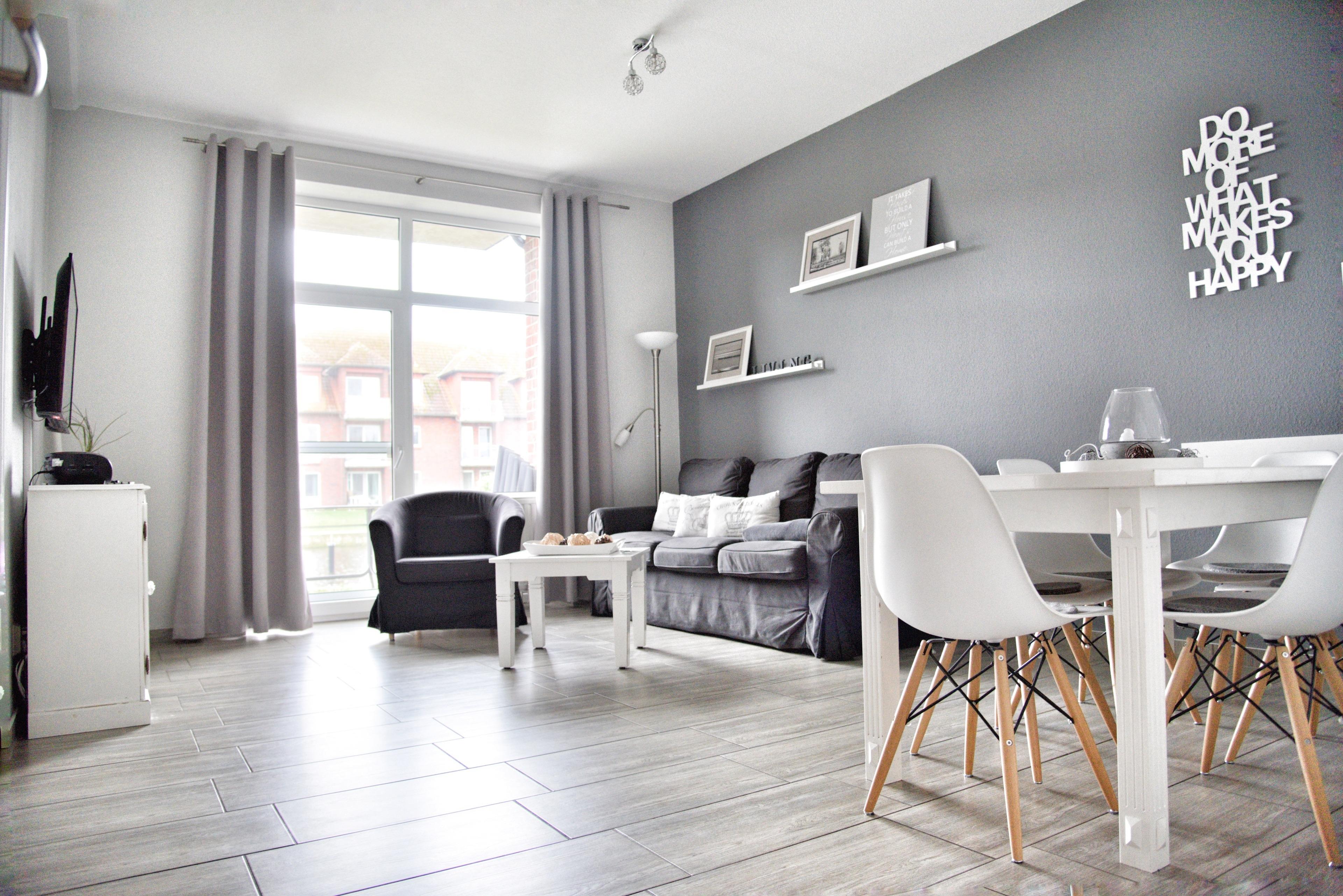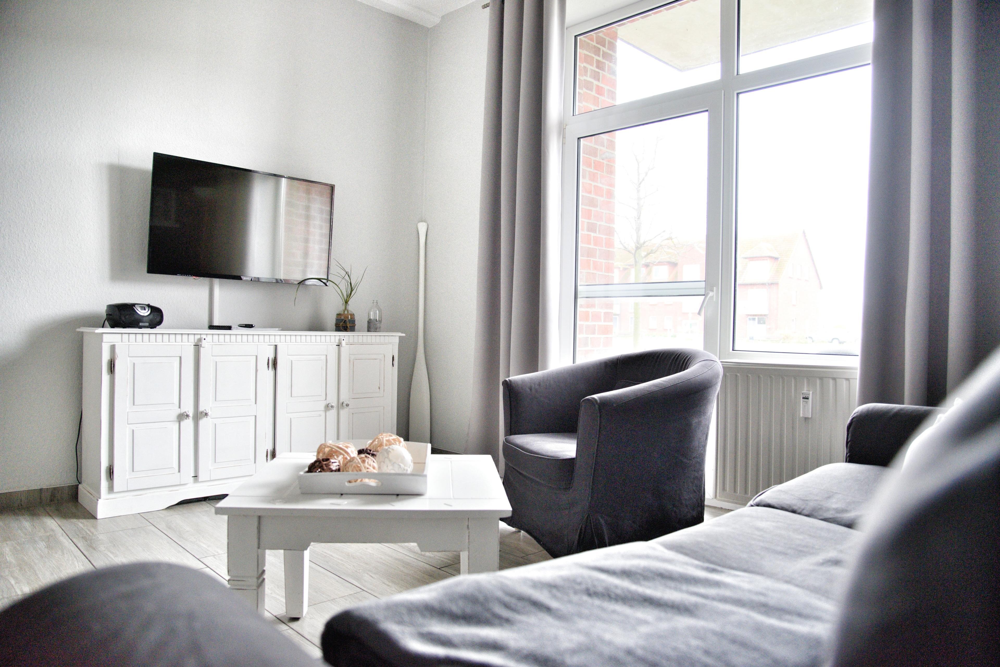 Ihr Wohnzimmer verfügt über einen Esstisch mit sechs Stühlen, ein ausziehbares Klappsofa mit einem Schlafplatz für zwei Personen und einen Sessel. Multimedial steht Ihnen ein großer Flachbildfernseher zur Verfügung. Ihre Ferienwohnung hat einen Kabelanschluss. Auch einige Gesellschaftsspiele warten hier schon auf Sie.