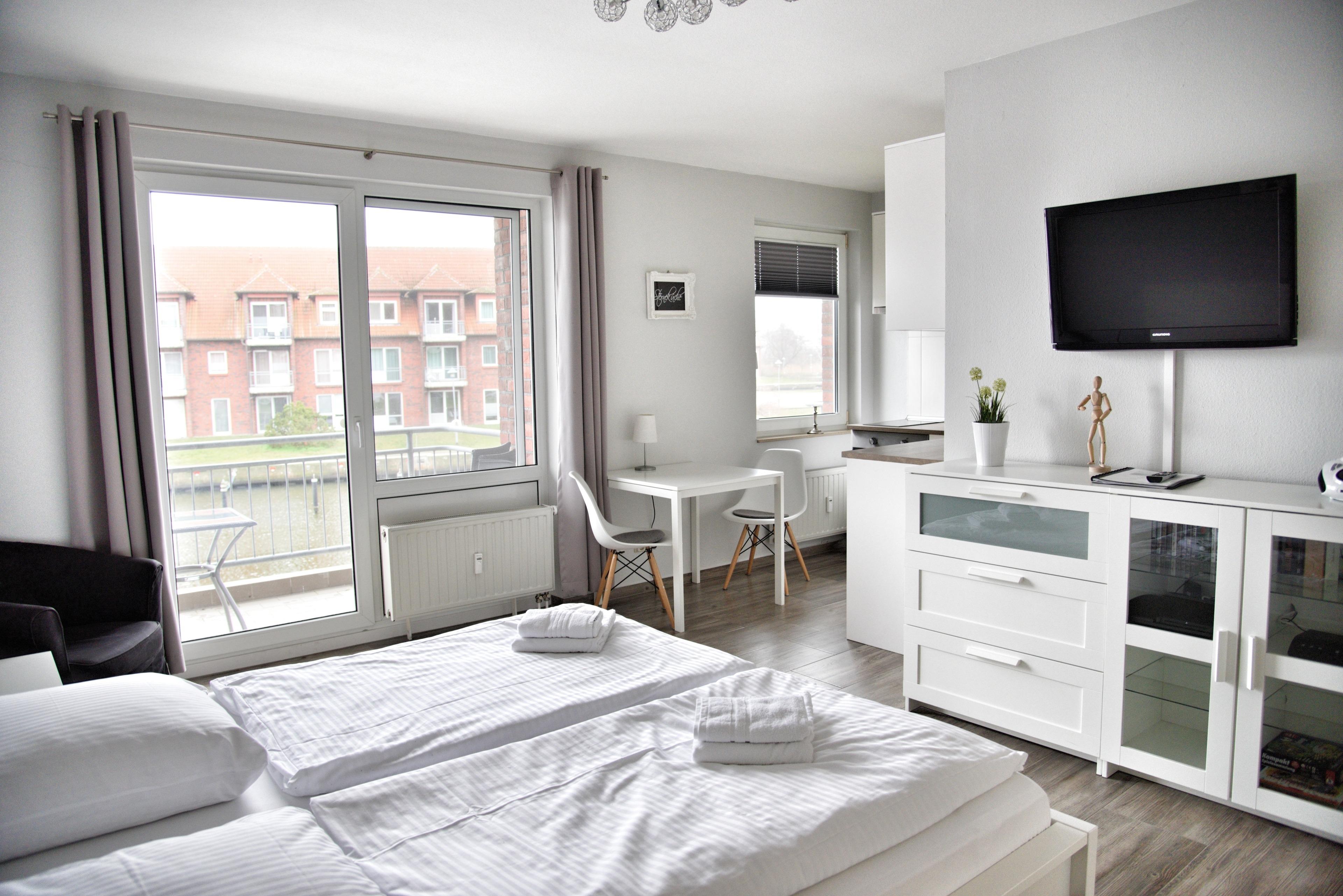 Das Appartement Warp erstreckt sich auf 29 Quadratmetern. Es unterteilt sich in einen großen Wohn- und Schlafbereich, eine Küchenecke, einen Flur sowie ein Bad. Vom Balkon aus haben Sie einen schönen Blick auf die Hafeneinfahrt der Lagunenstadt und die Uecker. Ihr Balkon ist mit zwei Balkonstühlen für Sie ausgestattet.