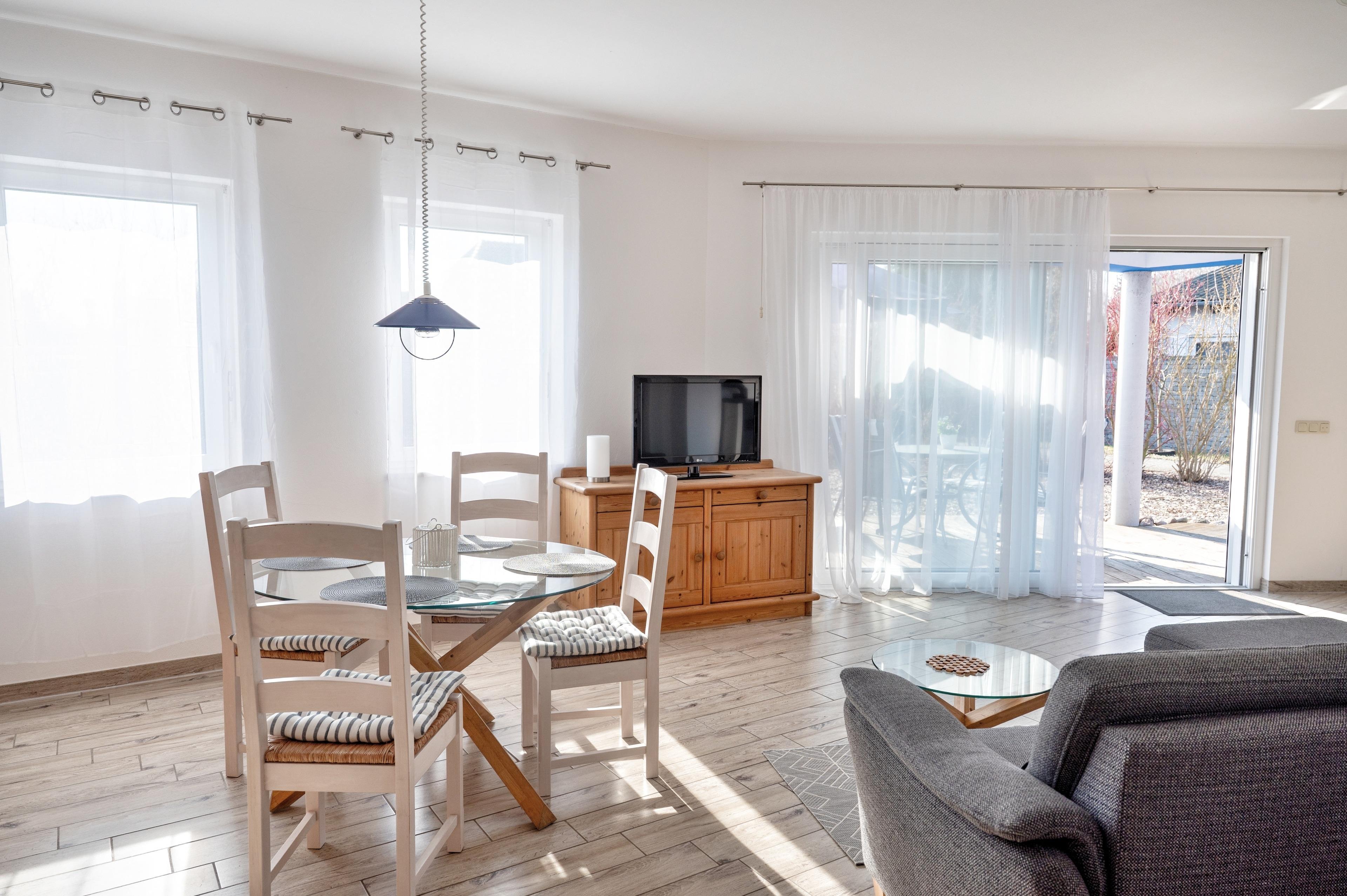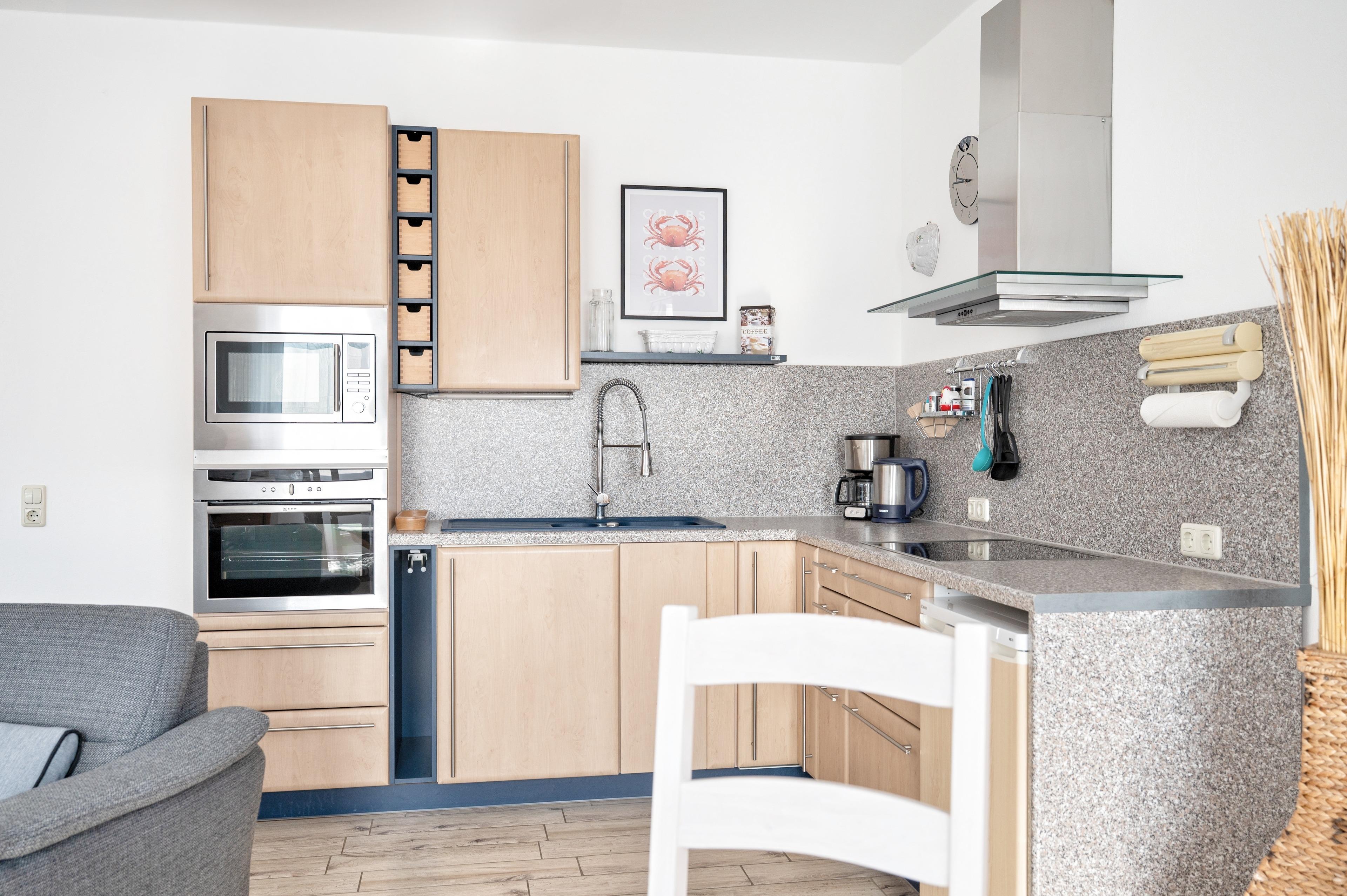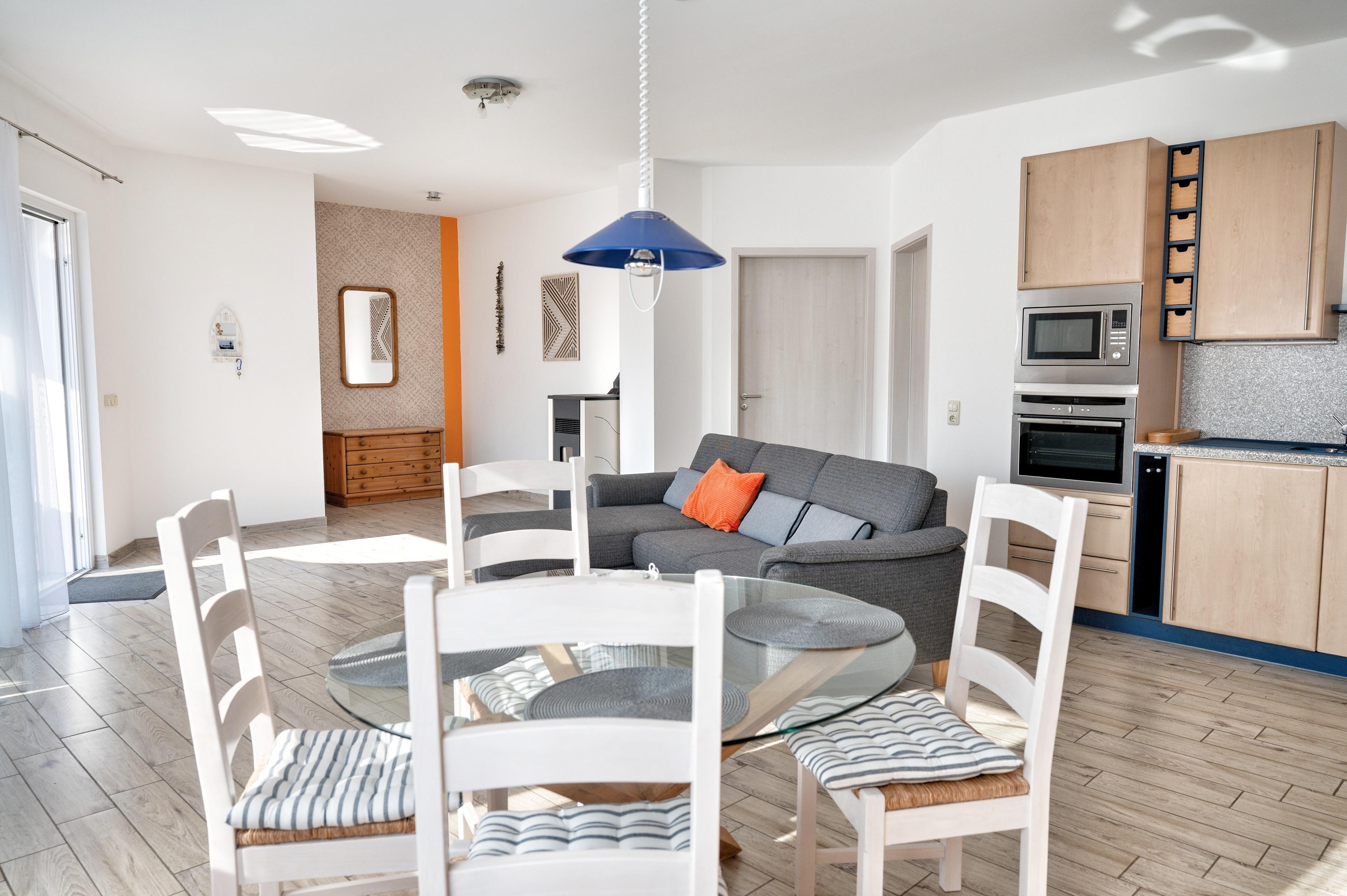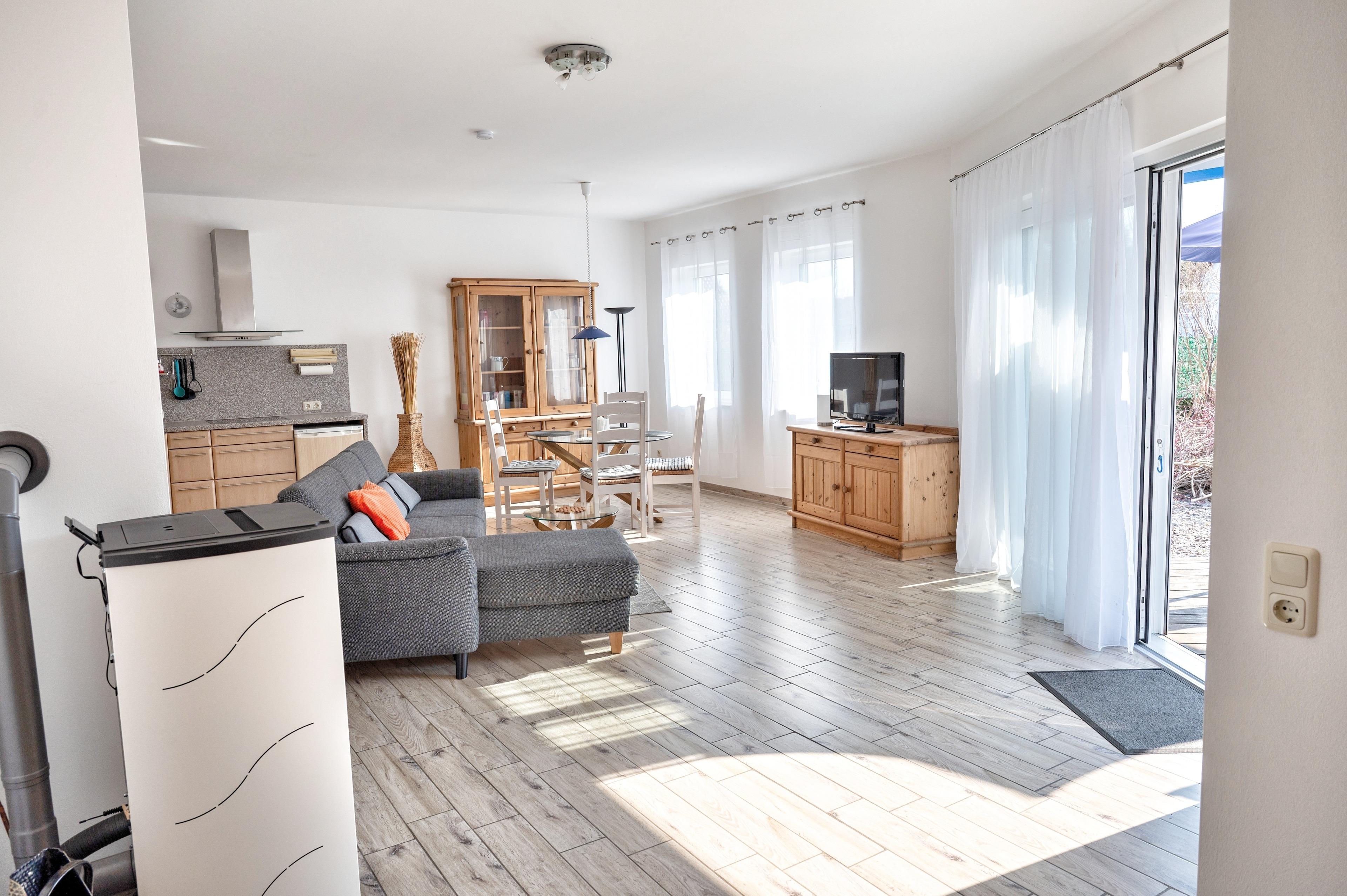 Ihr gemütliches Wohnzimmer ist mit einer Couch mit Schlaffunktion ausgestattet. Multimedial stehen Ihnen hier ein Flachbildfernseher und WLAN zur Verfügung. Auch einige Gesellschaftsspiele können hier von Ihnen genutzt werden. Ebenfalls ist in Ihrem Wohnzimmer eine Essecke mit vier Stühlen und einem großen Esstisch vorhanden. Die zum Wohnzimmer hin offene Küche lässt den Raum noch größer wirken. Ihre Küche ist mit Cerankochfeld, Backofen, Geschirrspüler und Kühlschrank ausgestattet. Für die Zubereitung Ihrer Mahlzeiten wird es Ihnen an nichts fehlen.