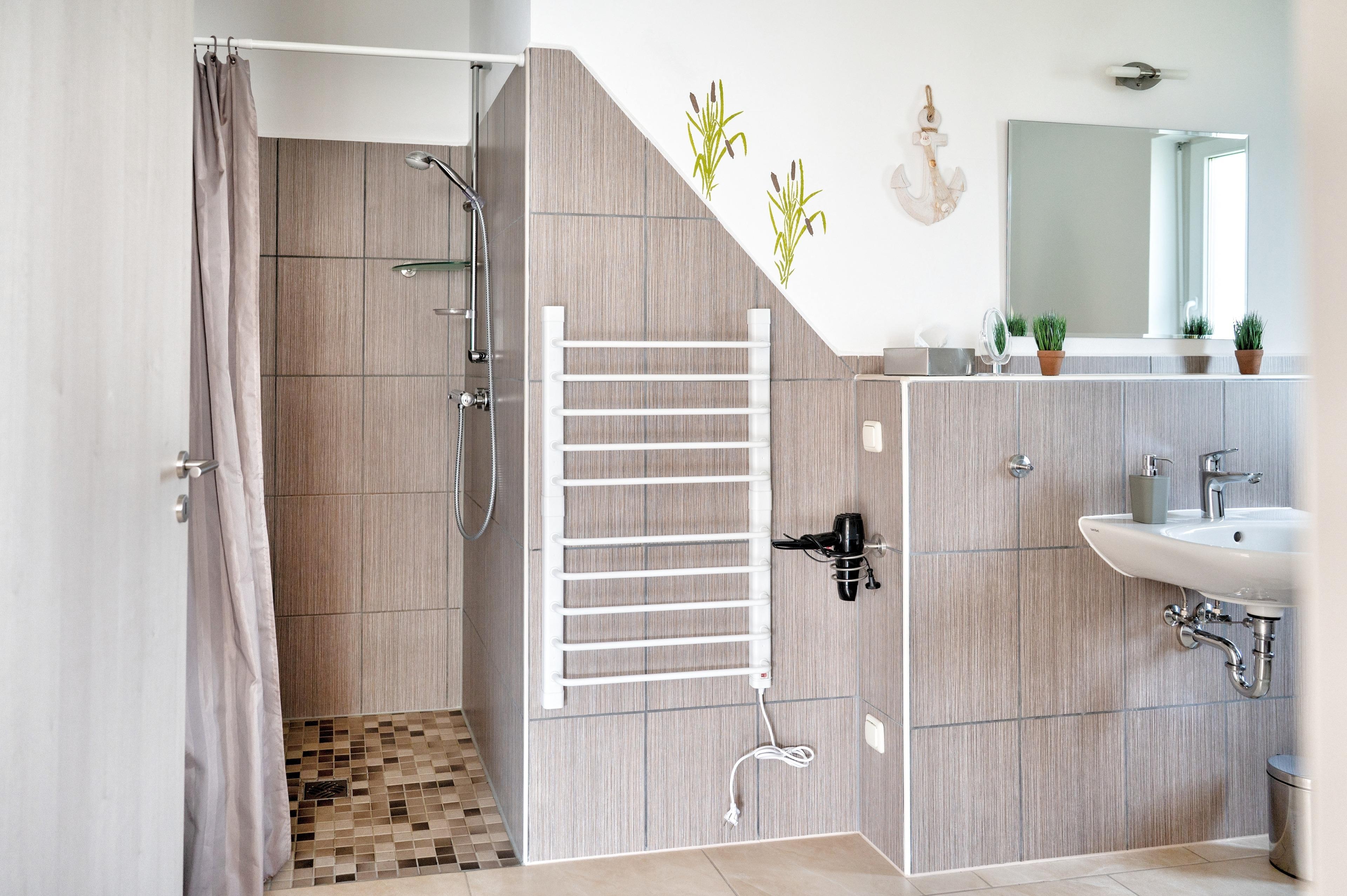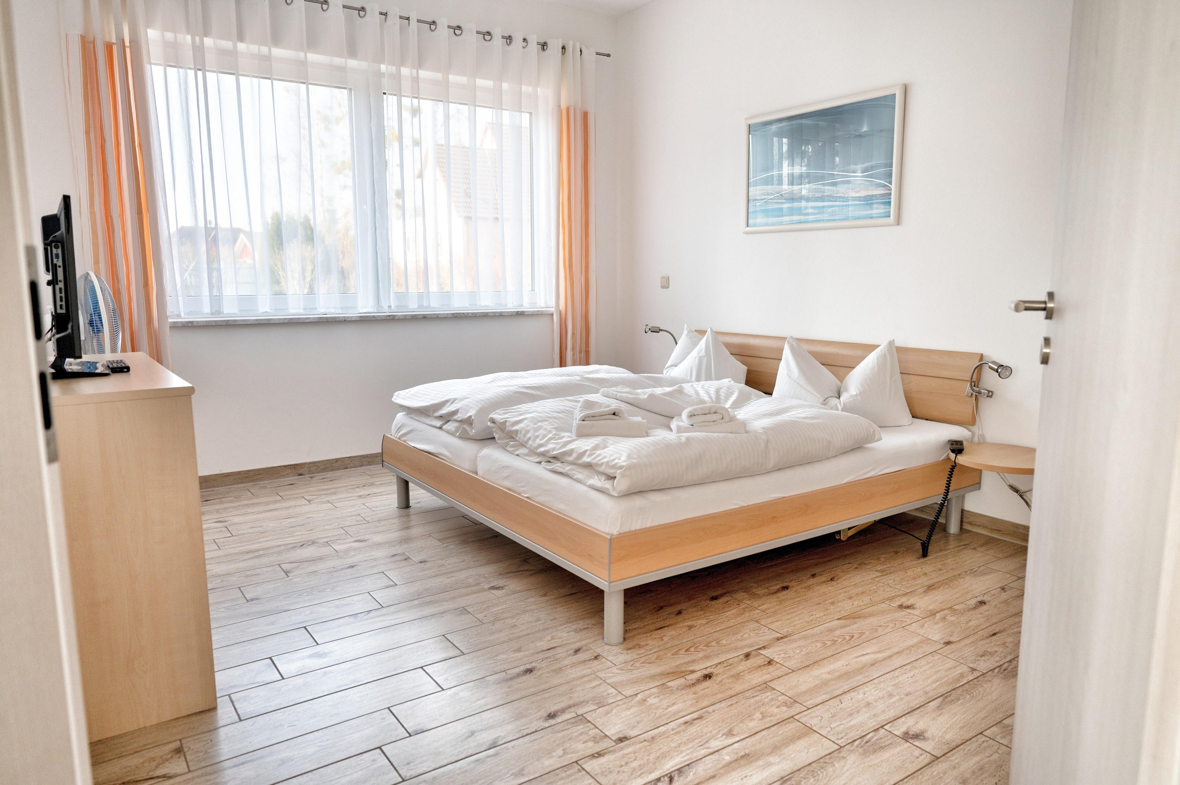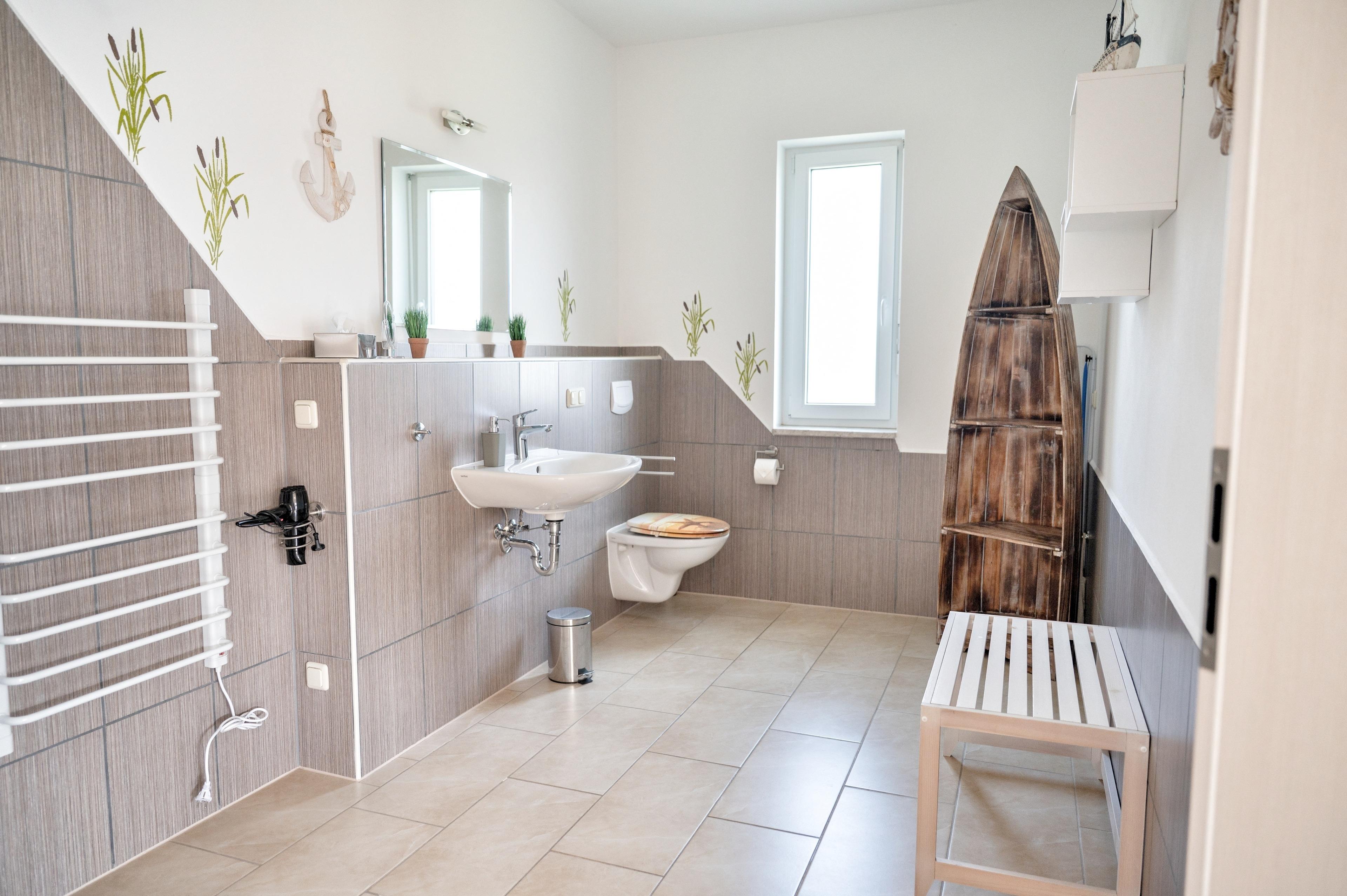 Ihr Schlafzimmer ist mit einem großes Doppelbett mit einer Liegefläche von 180 cm x 200 cm ausgestattet. Des weiteren finden Sie hier für Ihre Nutzung Nachttische und Verstaumöglichkeiten. Das Badezimmer ist mit einer großen Dusche ausgestattet. Ihre mitgebrachten Badezimmerutensilien finden in einem maritimen Regal ihren Platz.