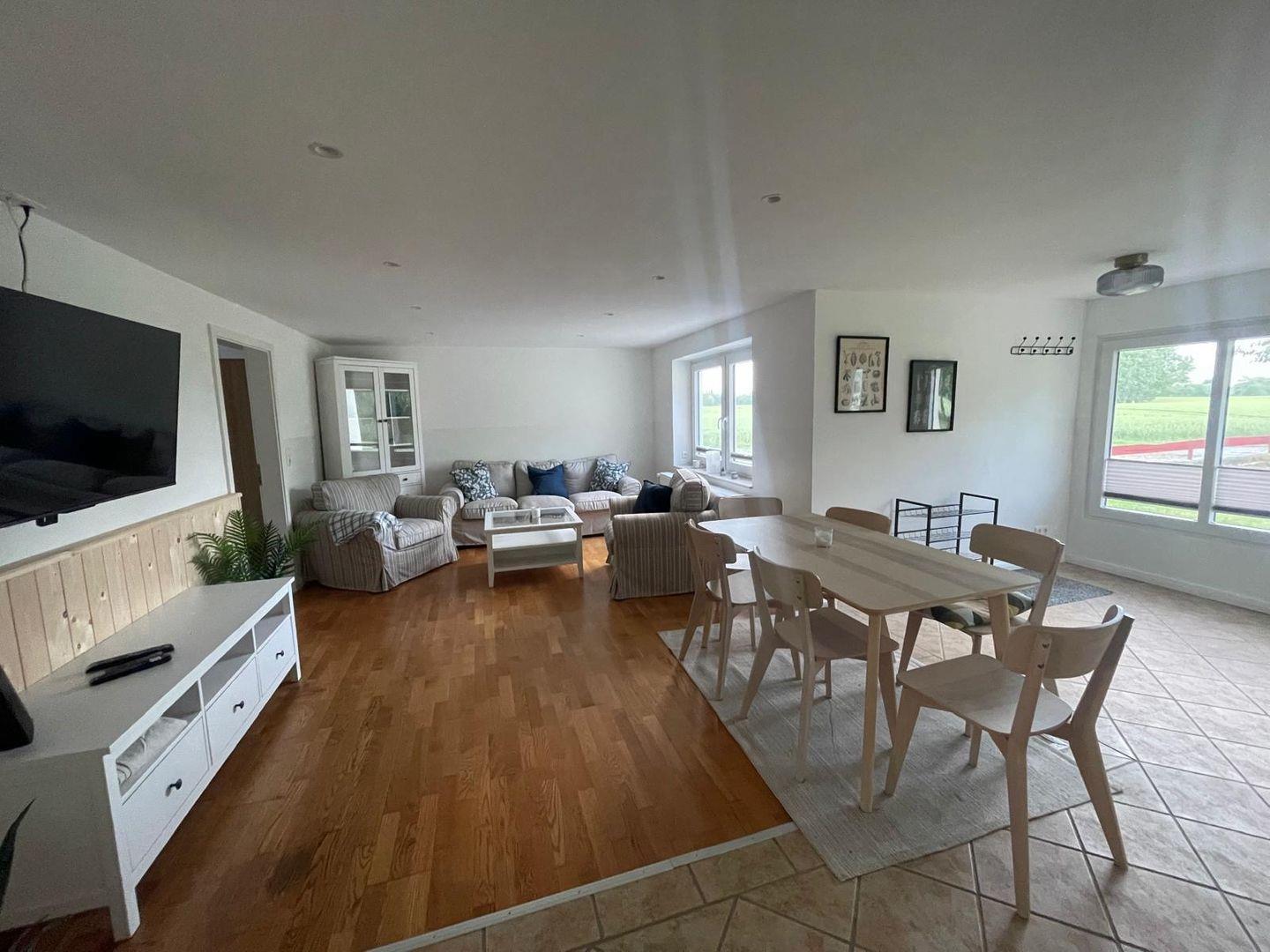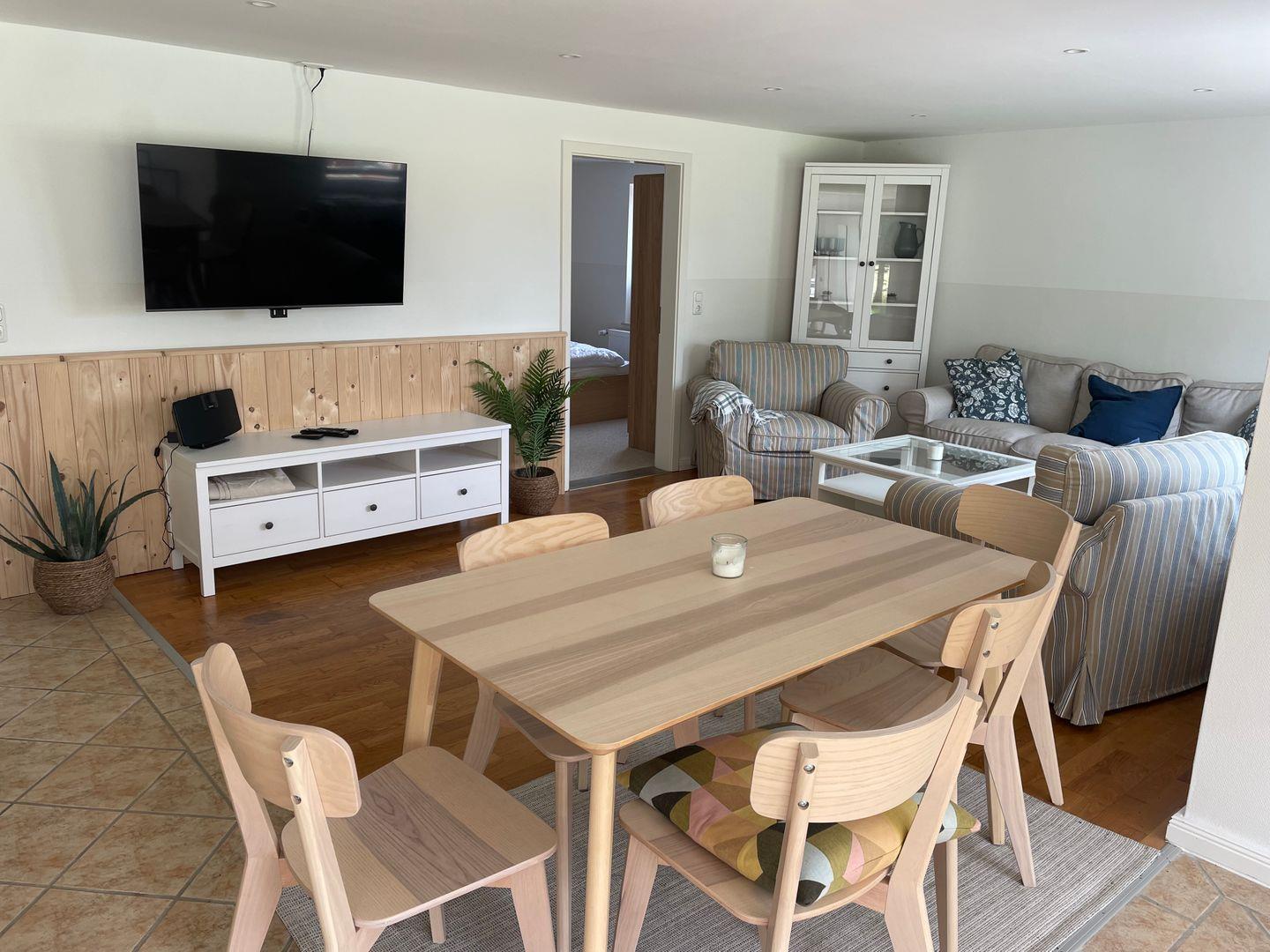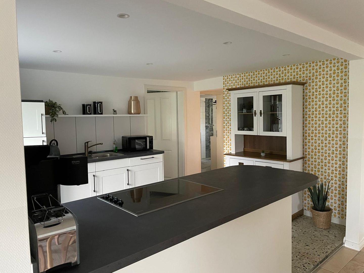 Der offene Wohn- und Essbereich lädt zum Verweilen ein, mit einem Esstisch, einem Sofa, zwei Sesseln, einer Kommode und einer Garderobe. Die angrenzende Küche ist voll ausgestattet mit Mikrowelle, Cerankochfeld, Backofen, Kühlschrank mit Gefrierfach, Spülmaschine, Filterkaffeemaschine, Wasserkocher und Toaster – alles für einen angenehmen Aufenthalt.