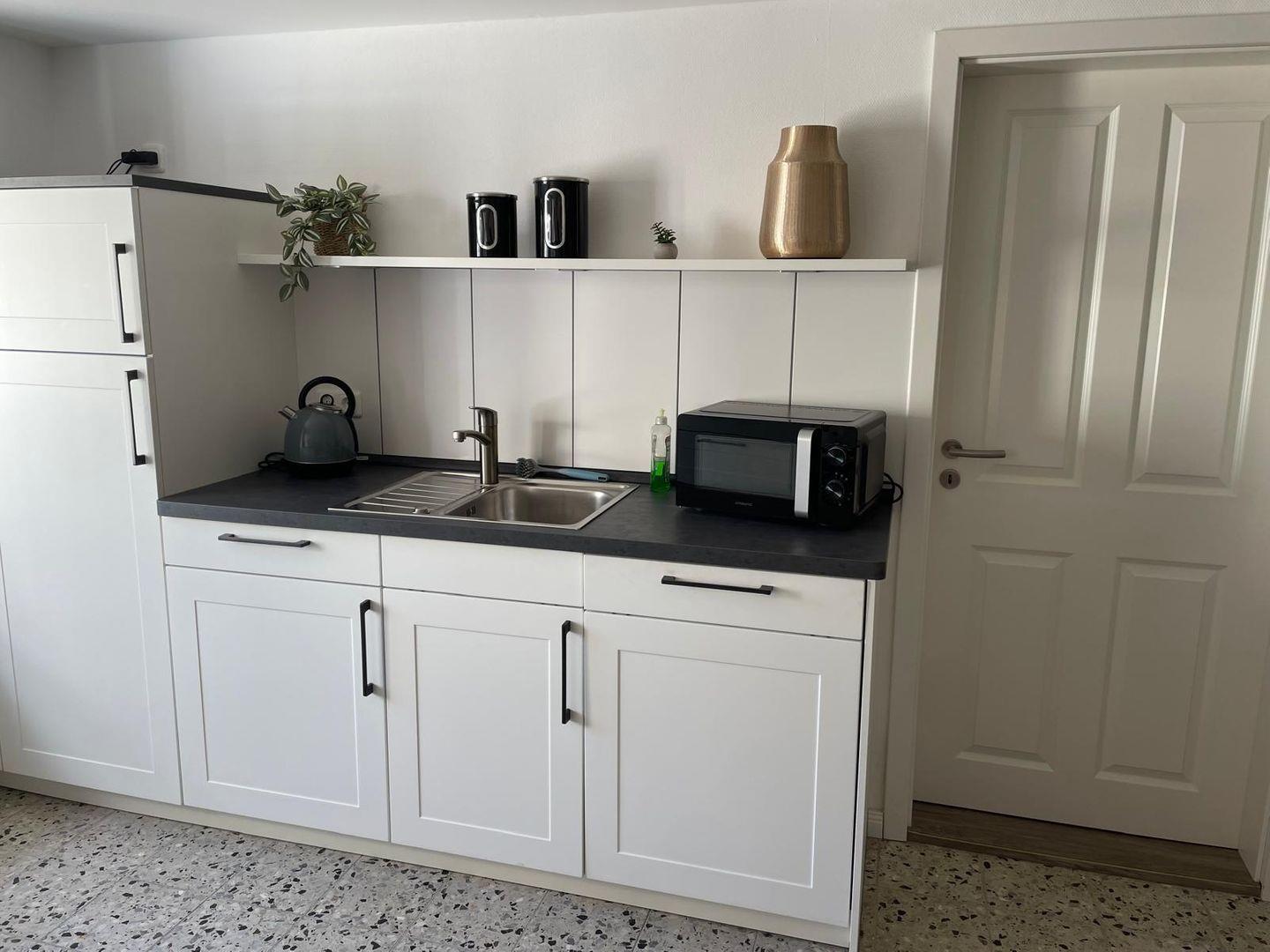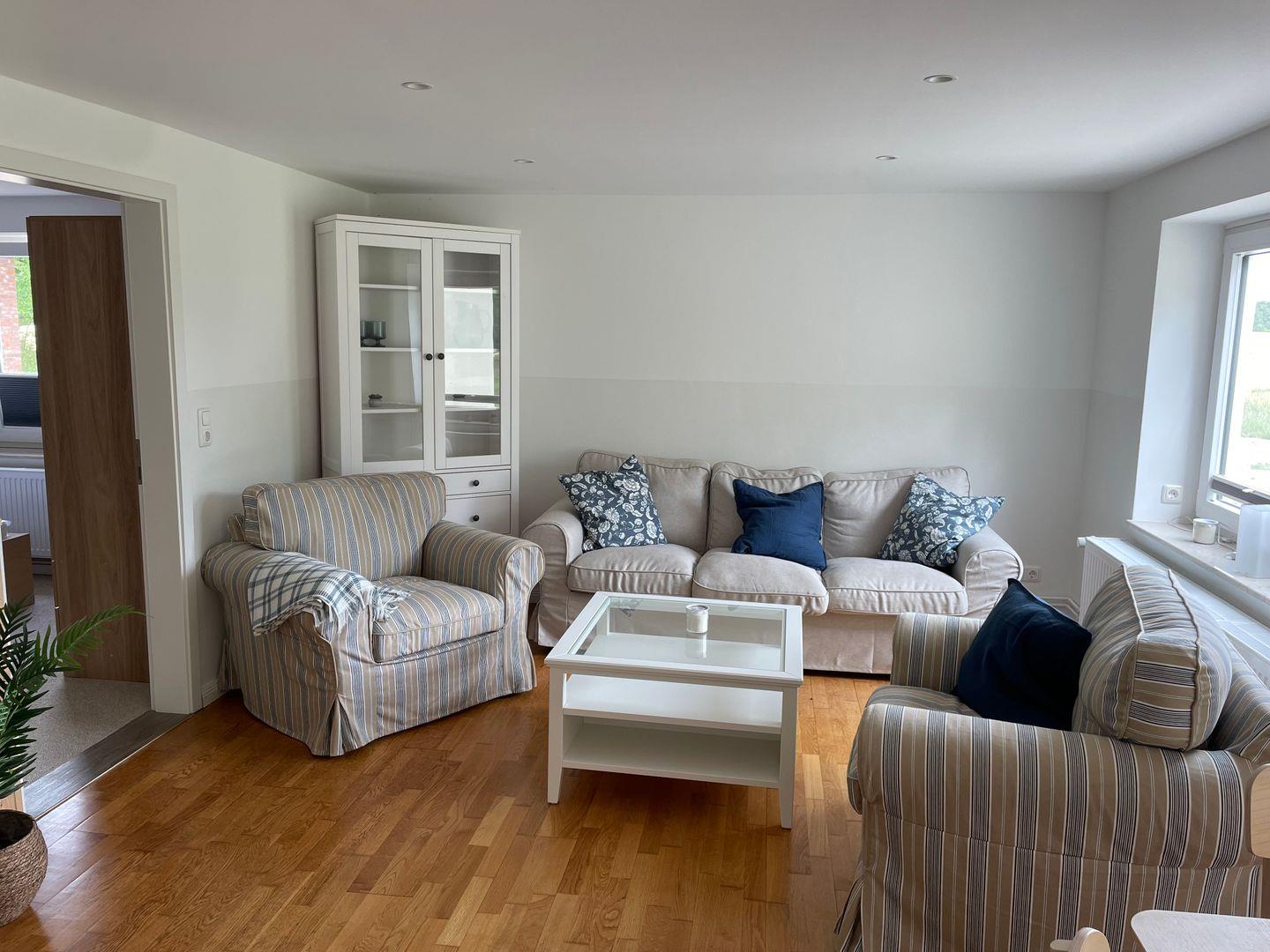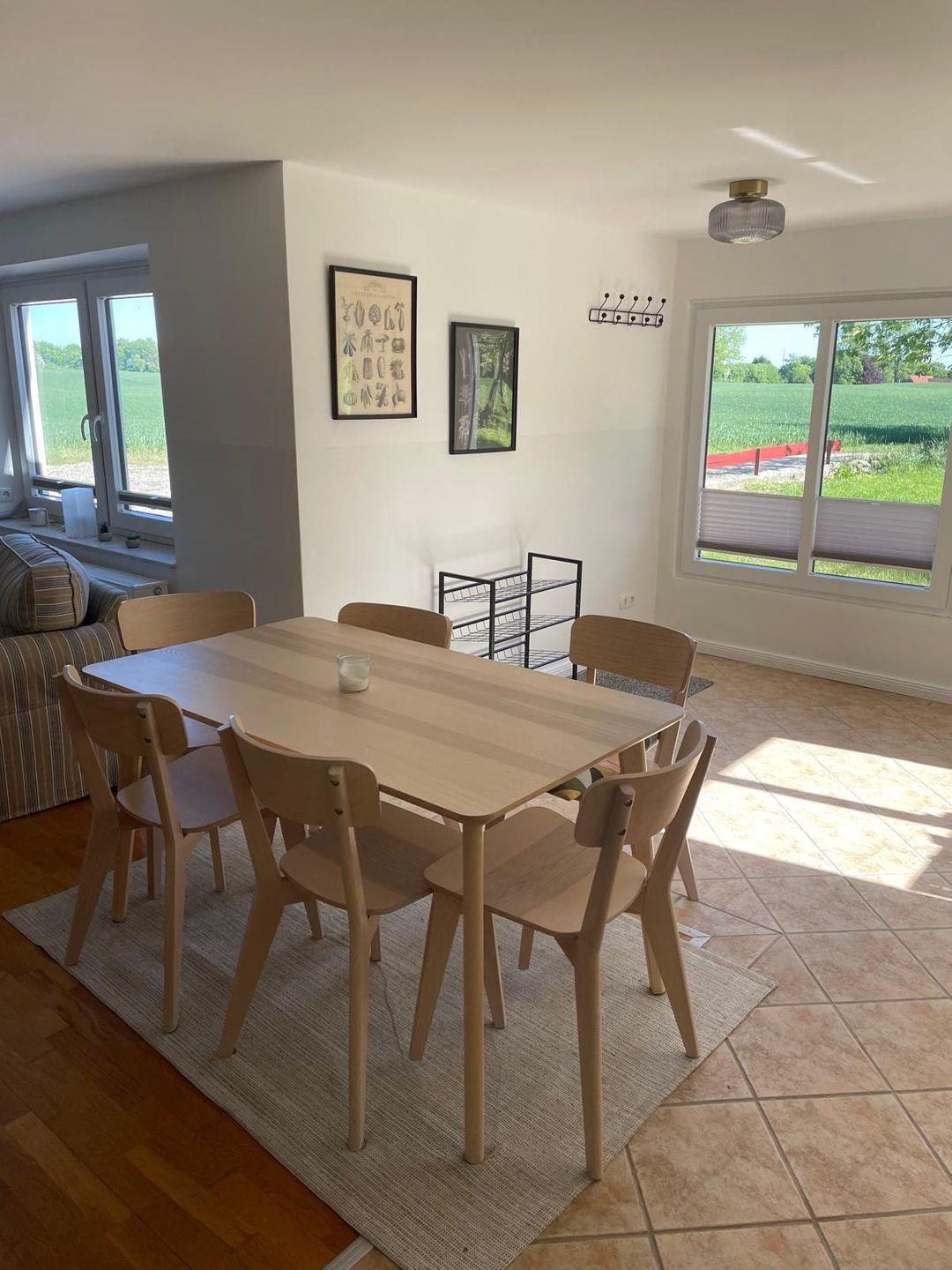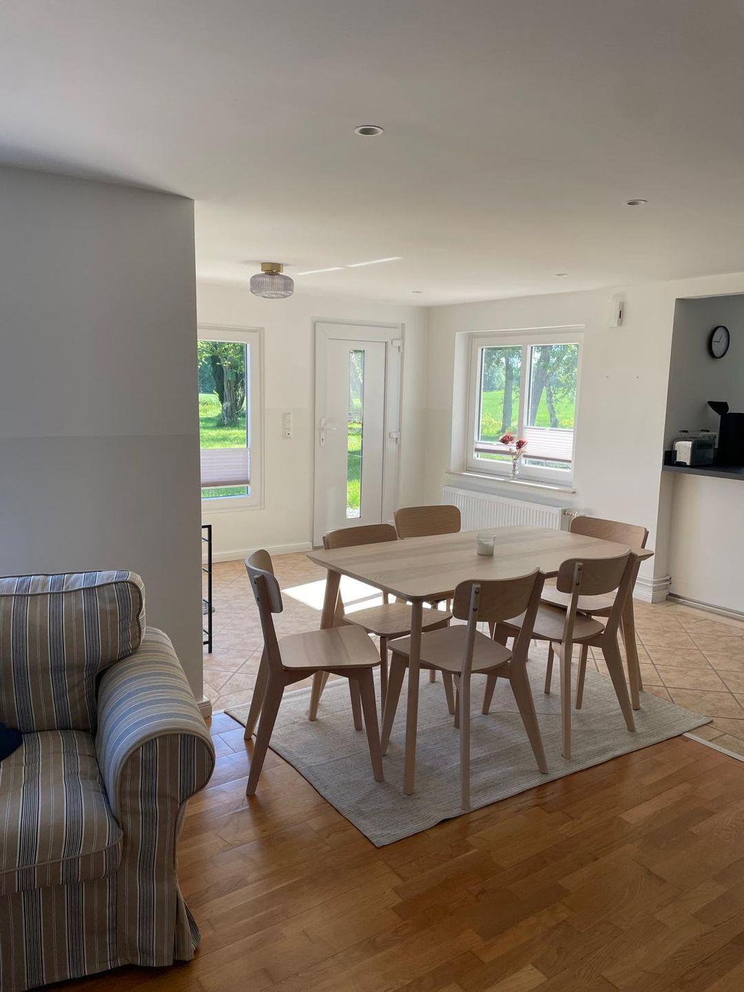 Der offene Wohn- und Essbereich lädt zum Verweilen ein, mit einem Esstisch, einem Sofa, zwei Sesseln, einer Kommode und einer Garderobe. Die angrenzende Küche ist voll ausgestattet mit Mikrowelle, Cerankochfeld, Backofen, Kühlschrank mit Gefrierfach, Spülmaschine, Filterkaffeemaschine, Wasserkocher und Toaster – alles für einen angenehmen Aufenthalt.