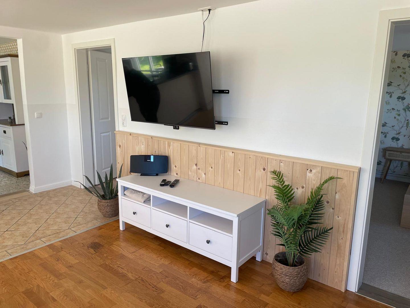 Zur Unterhaltung stehen SAT-TV im Wohnzimmer, Radio, CD-Player und WLAN zur Verfügung. Für Familien mit kleinen Kindern gibt es ein Reisebett, Hochstuhl, Kinderspielzeug und einen Kindertoilettensitz. Weitere Annehmlichkeiten sind ein Waschtrockner zur Eigennutzung, Wäscheständer, Staubsauger sowie eine Terrasse mit Gartenmöbeln. Auf dem Grundstück befindet sich ein Klärteich, dieser ist eingezäunt. Fliegengitter in den Schlafzimmern sorgen für angenehmen Schlaf ohne störende Insekten.