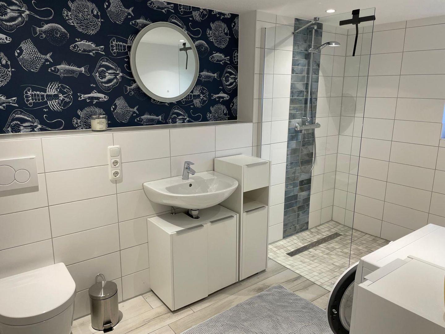 Das Badezimmer verfügt über eine ebenerdige Dusche, WC, Spiegel, Waschbecken sowie ein Fenster und Fußbodenheizung für zusätzlichen Komfort. Die gesamte Unterkunft ist ein Nichtraucherhaus und bietet vier Parkplätze für Ihren PKW. Hunde sind willkommen (maximal drei Tiere).