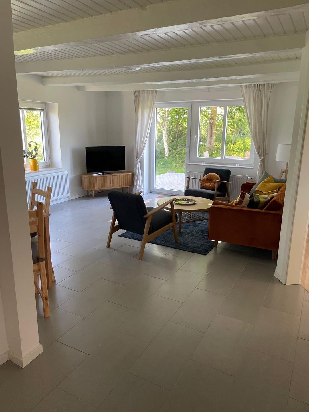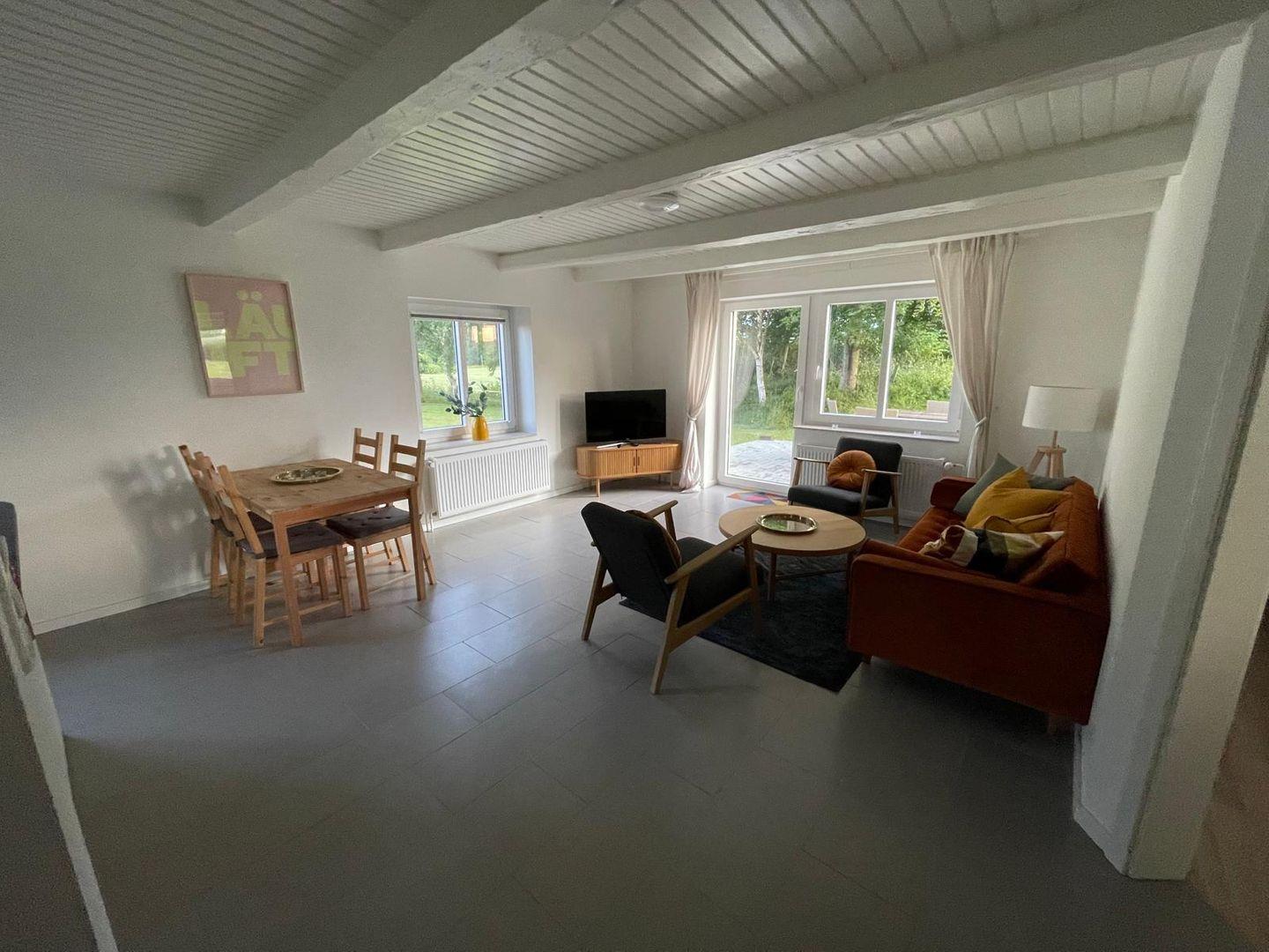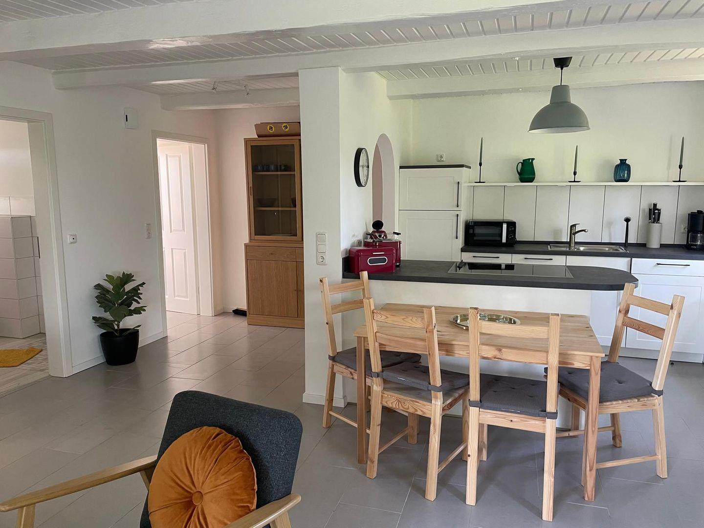 Der offene Wohn-/Essbereich lädt zum Verweilen ein: Ein bequemer Sofa und ein Sessel sorgen für entspannte Stunden, während der Esstisch ausreichend Platz für gemeinsame Mahlzeiten bietet. Die angrenzende offene Küche ist vollständig ausgestattet mit Mikrowelle, Cerankochfeld, Backofen, Kühlschrank mit Gefrierfach, Spülmaschine, Filterkaffeemaschine, Wasserkocher und Toaster – alles, was Sie für die Zubereitung Ihrer Lieblingsgerichte benötigen.