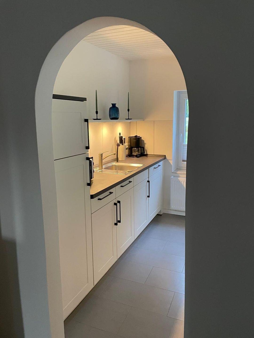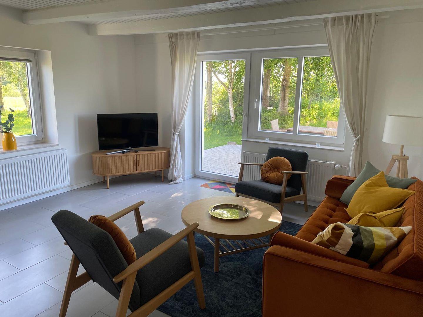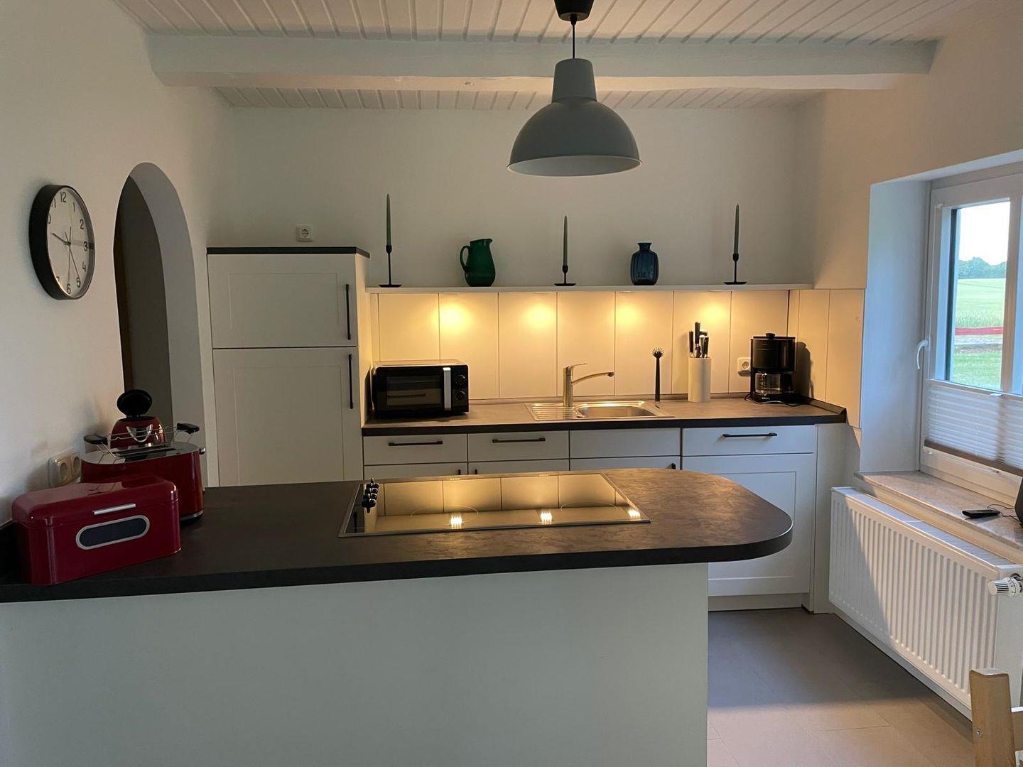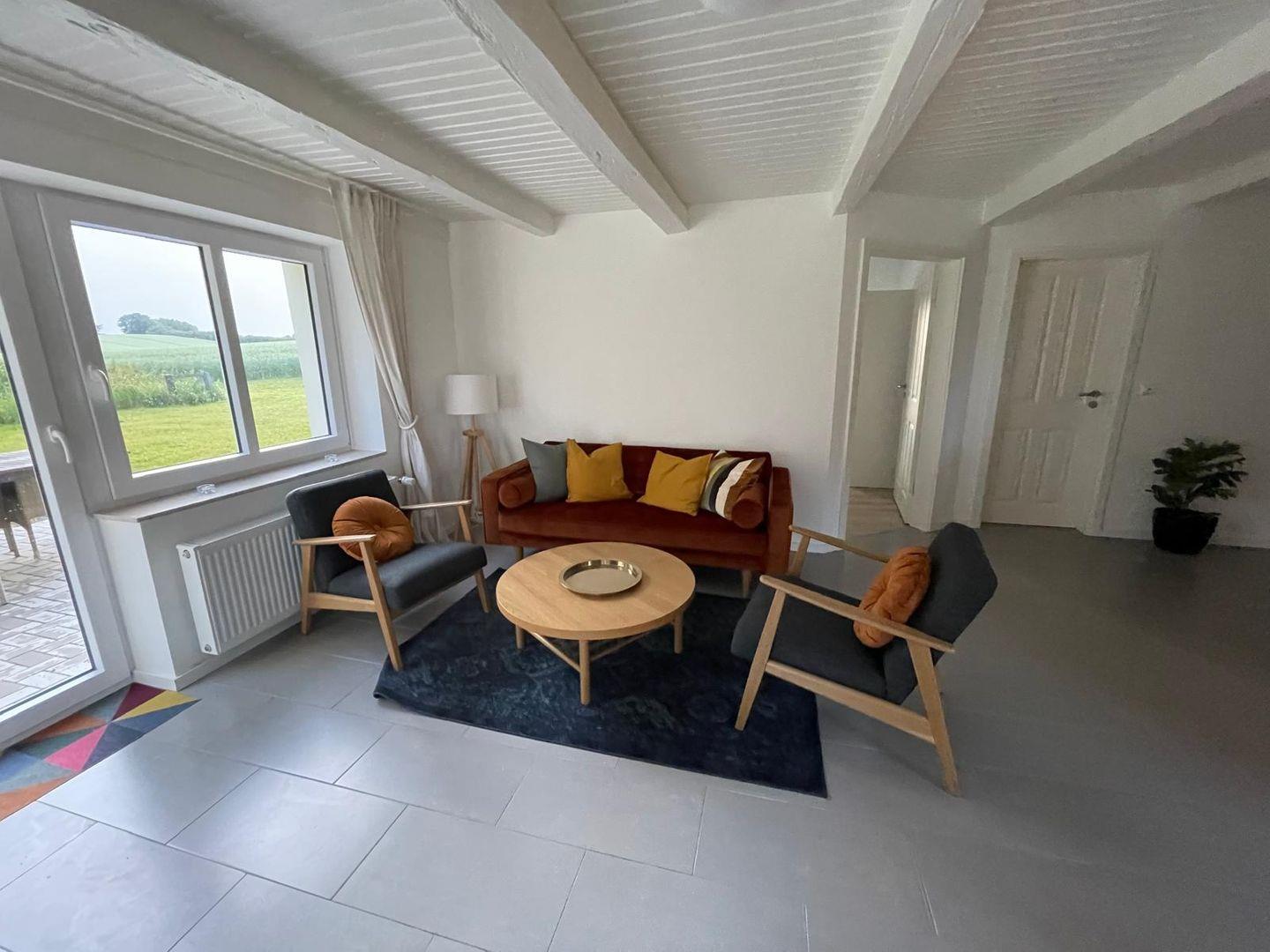 Der offene Wohn-/Essbereich lädt zum Verweilen ein: Ein bequemer Sofa und ein Sessel sorgen für entspannte Stunden, während der Esstisch ausreichend Platz für gemeinsame Mahlzeiten bietet. Die angrenzende offene Küche ist vollständig ausgestattet mit Mikrowelle, Cerankochfeld, Backofen, Kühlschrank mit Gefrierfach, Spülmaschine, Filterkaffeemaschine, Wasserkocher und Toaster – alles, was Sie für die Zubereitung Ihrer Lieblingsgerichte benötigen.