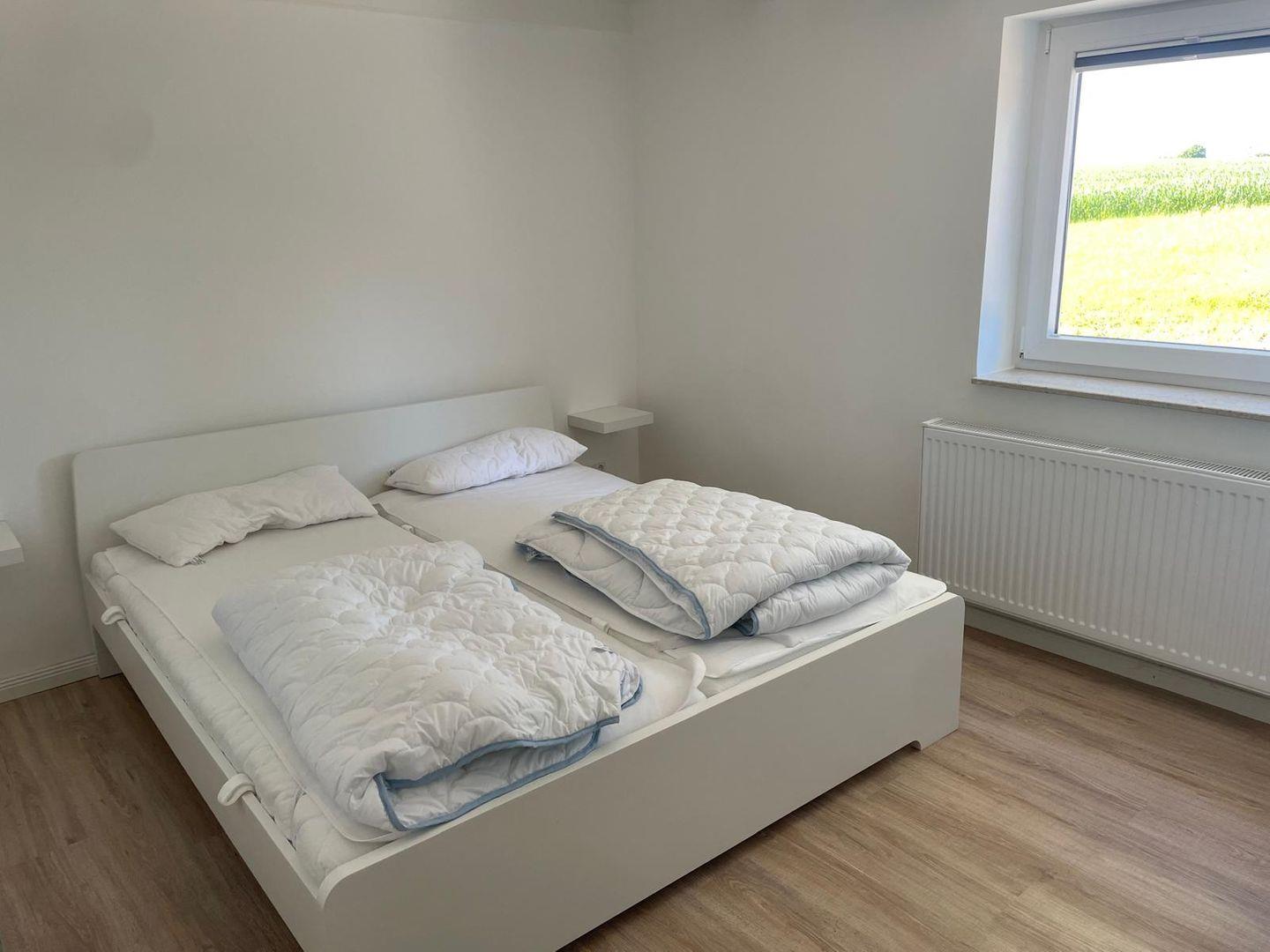 Das Schlafzimmer verfügt über ein komfortables Doppelbett (190x200 cm) mit getrennten Matratzen und einer praktischen Verdunkelungsmöglichkeit, um erholsamen Schlaf zu garantieren. Ein Kleiderschrank bietet Stauraum für Ihre mitgebrachte Kleidung. Das Badezimmer ist modern gestaltet mit einer ebenerdigen Dusche, WC, Waschbecken, Spiegel und einem Fenster für natürliches Licht. Fußbodenheizung im Badezimmer sorgt auch an kühleren Tagen für behagliche Wärme. Fliegengitter an den Fenstern im Schlafzimmer und Badezimmer werden nachgerüstet.
