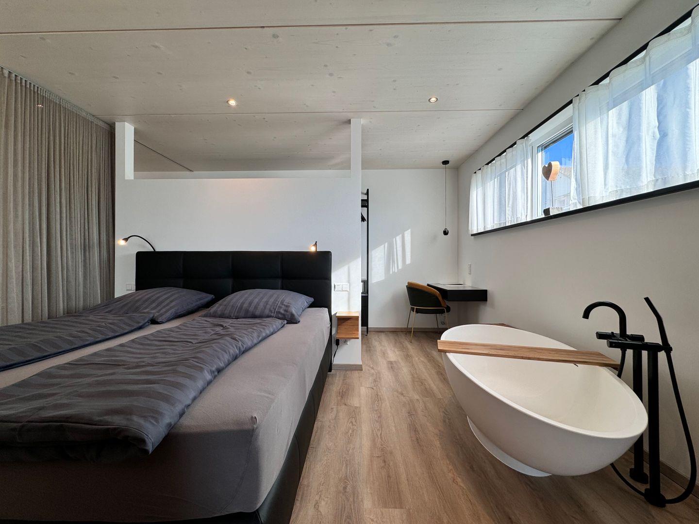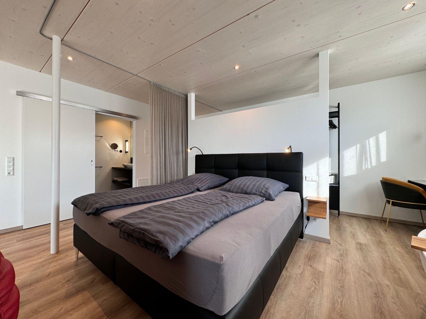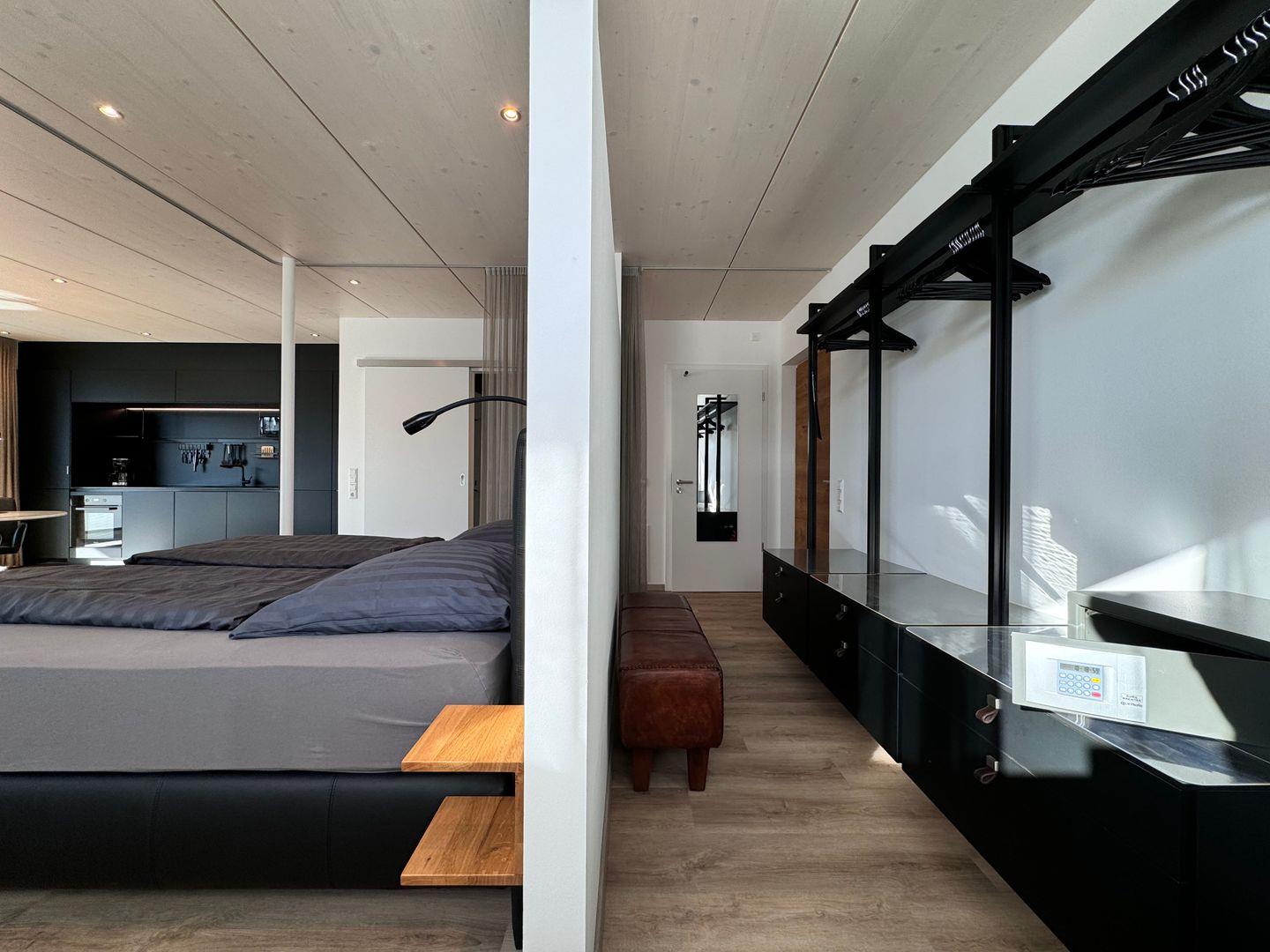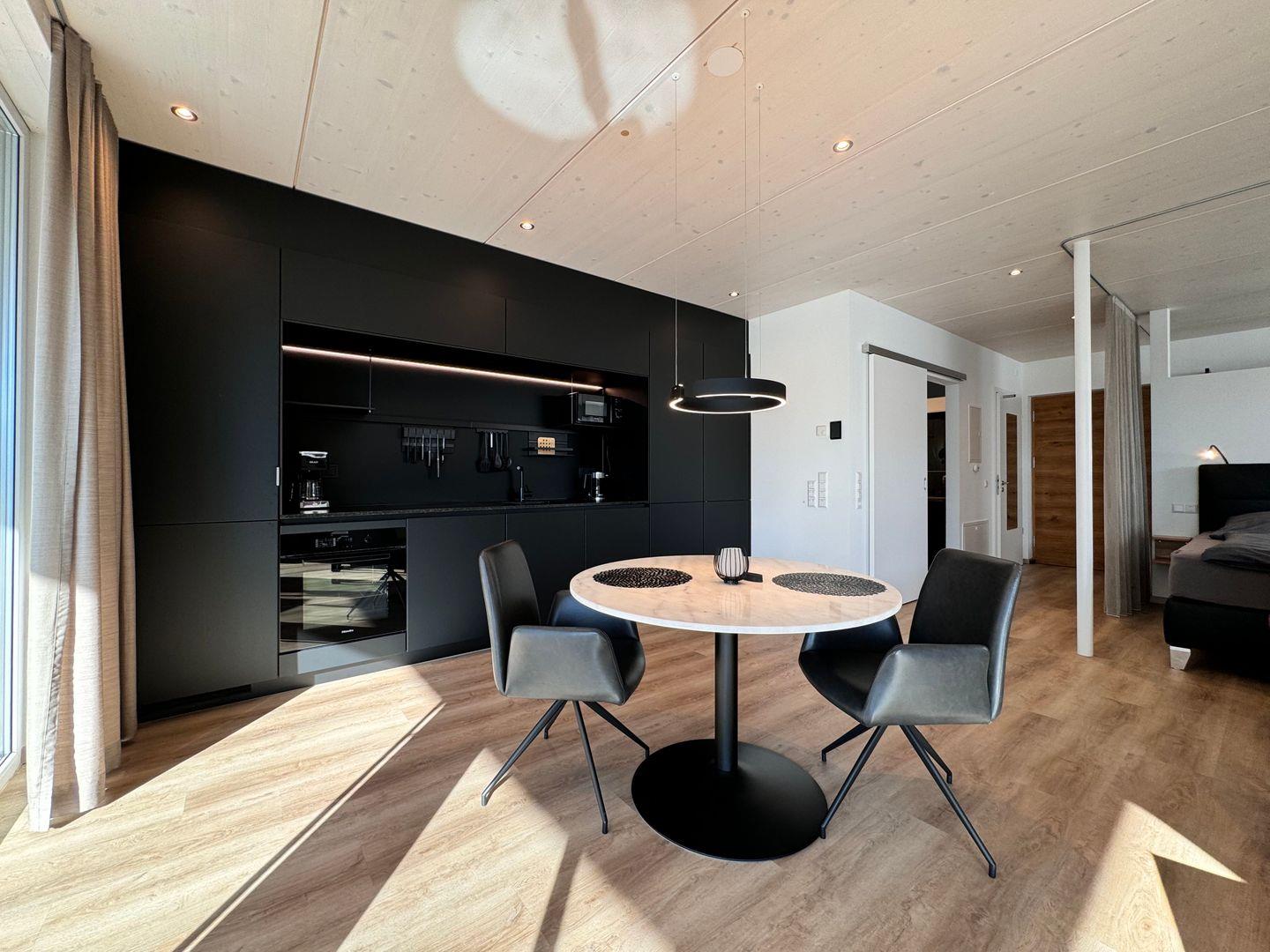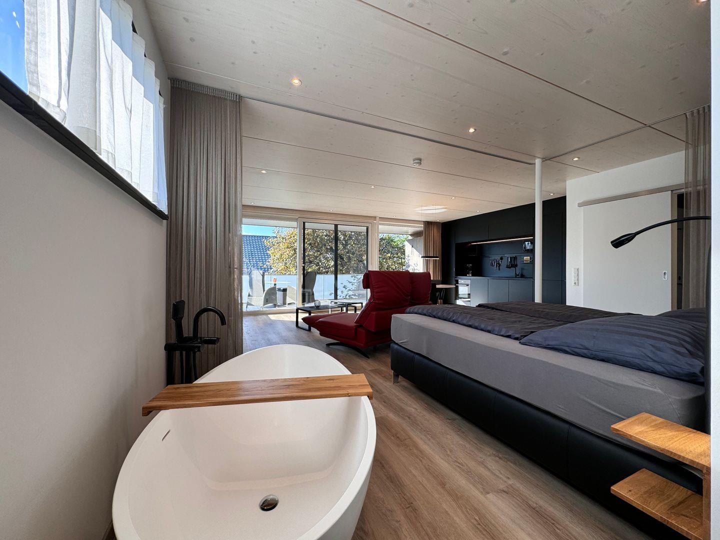 Das offene 1-Zimmer-Appartement überzeugt durch geradliniges schlichtes Design sowie ausgesuchte Möbel und Textilien. Die Ausstattung lässt keine Wünsche offen.