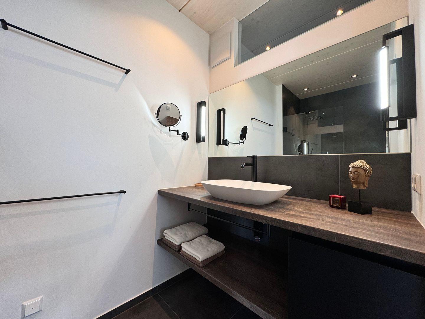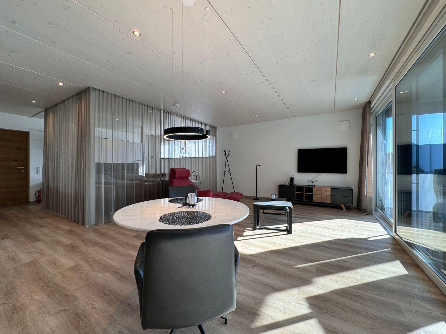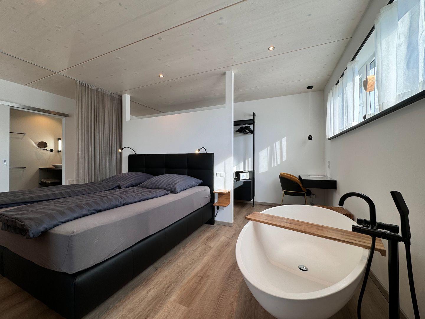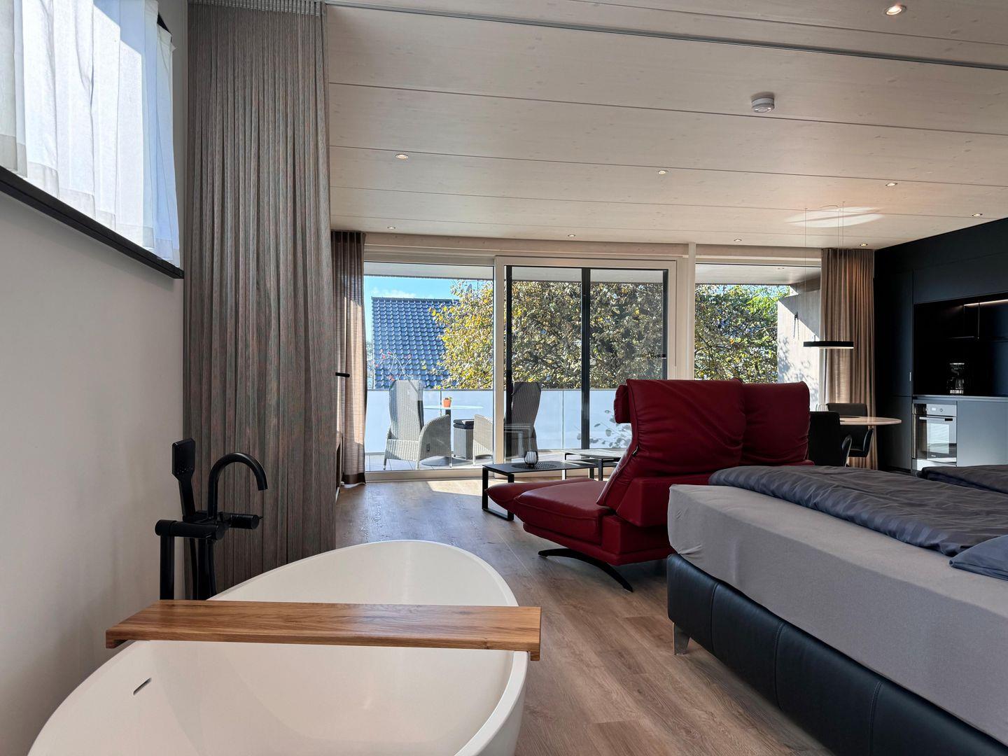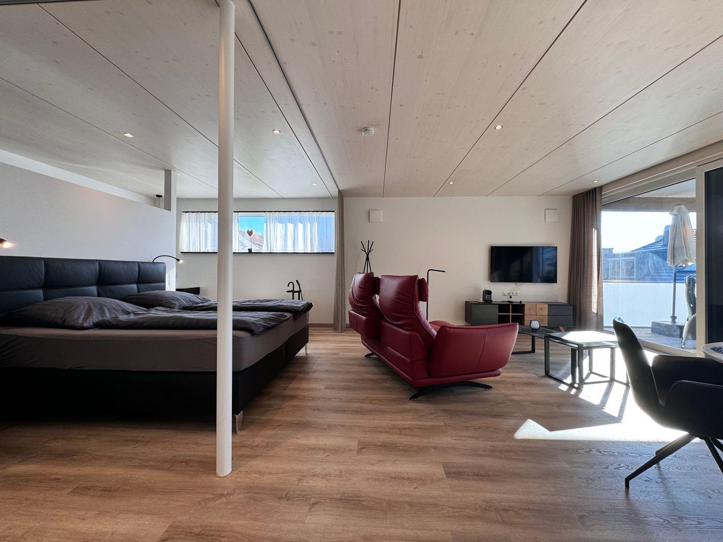 Das offene 1-Zimmer-Appartement überzeugt durch geradliniges schlichtes Design sowie ausgesuchte Möbel und Textilien. Die Ausstattung lässt keine Wünsche offen.