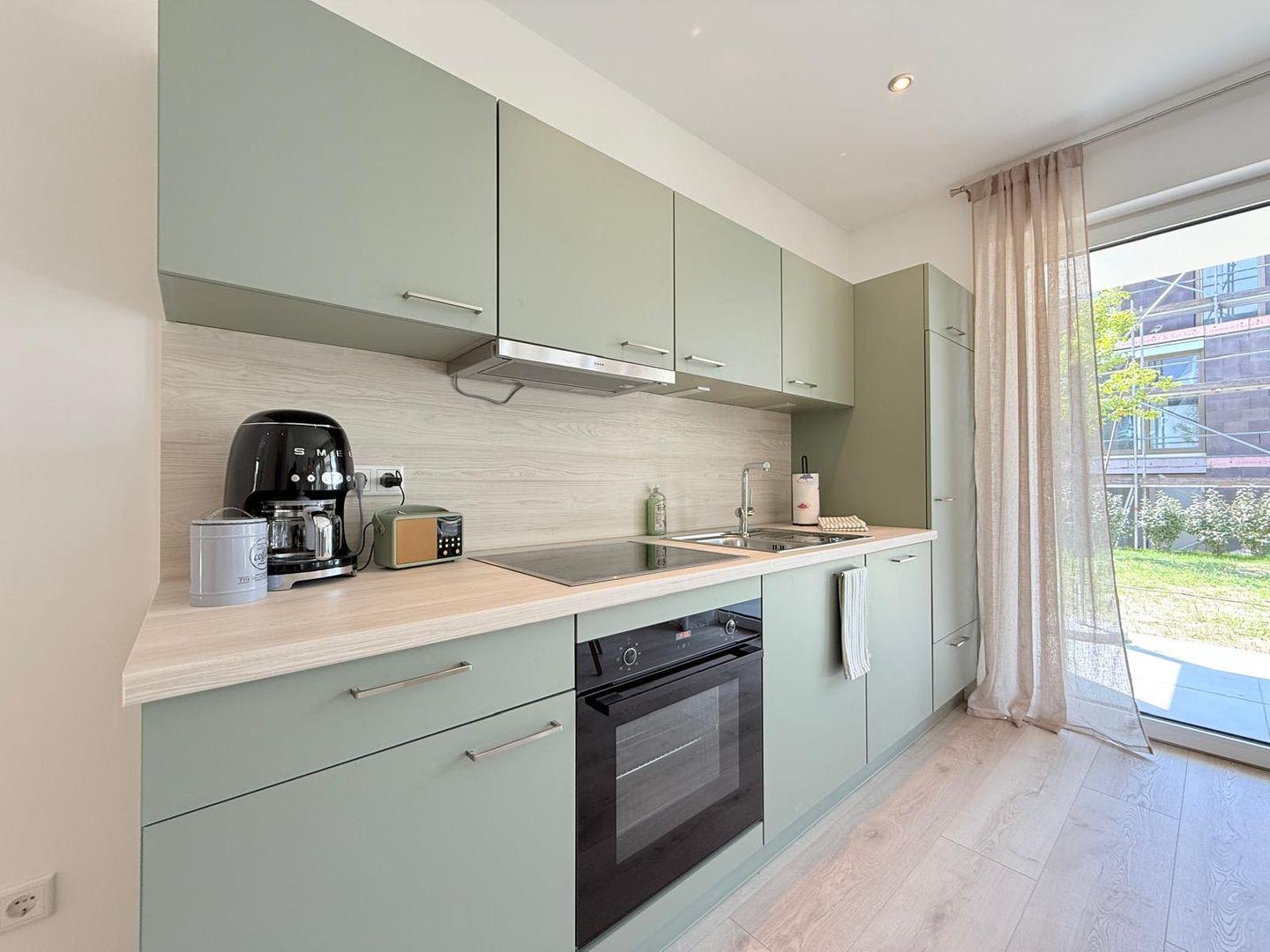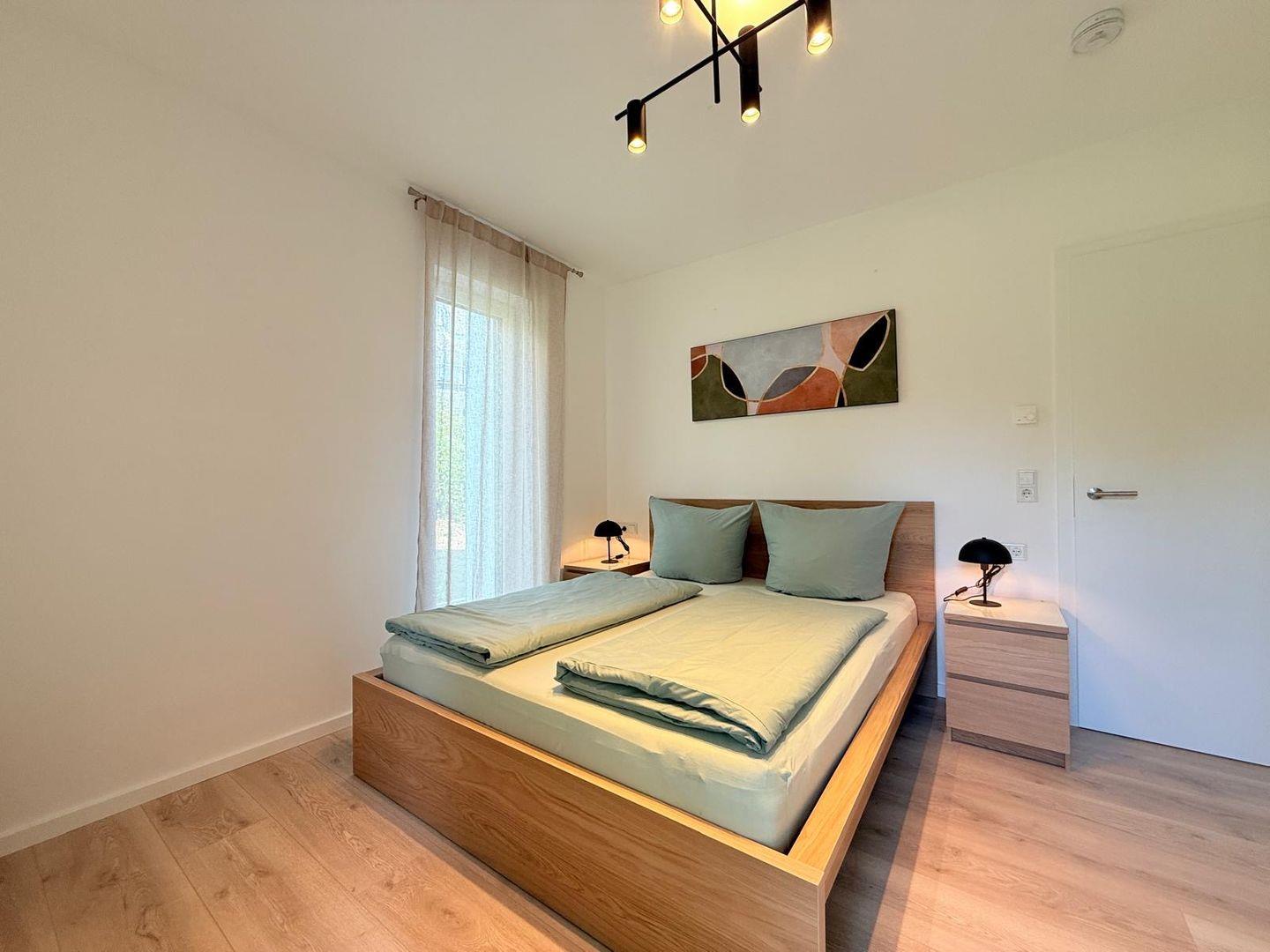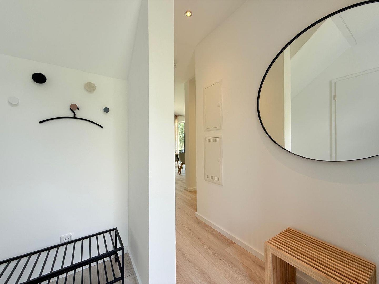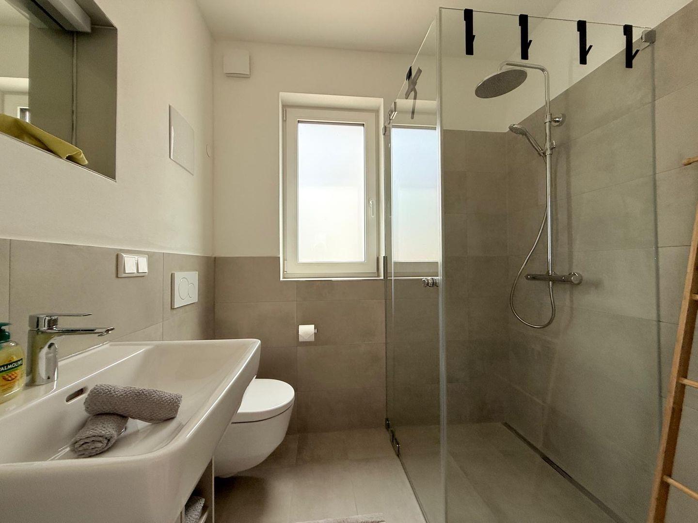 Das Badezimmer ist mit einer bodengleichen Dusche, Haartrockner, Waschbecken, WC und Spiegel ausgestattet. Badetücher, Handtücher, Bettwäsche sowie Reinigungsmittel sind inbegriffen. Waschmaschine und Trockner stehen zur gemeinschaftlichen Nutzung bereit, ein Wäscheständer ist ebenso vorhanden. Für zusätzlichen Komfort sorgt die durchgängig installierte Fußbodenheizung, betrieben über eine effiziente Wärmepumpe. Sichtschutz an allen Fenstern und Rauchmelder gewährleisten Sicherheit und Privatsphäre.