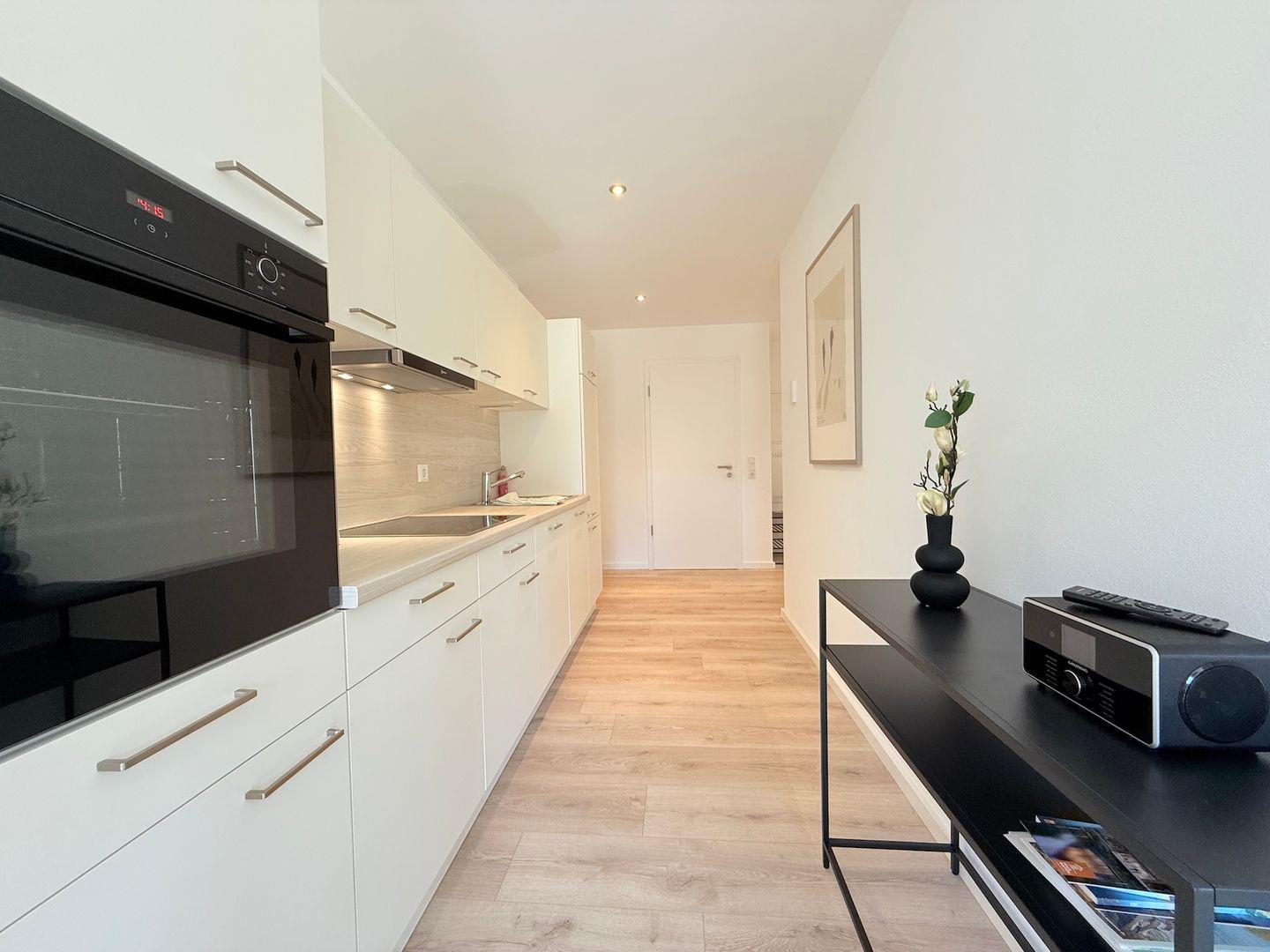 Die Suite besteht aus insgesamt drei Zimmern, darunter zwei separate Schlafzimmer. Sowohl im Wohn- als auch in den Schlafbereichen wurde ein pflegeleichter Vinylboden verlegt, der zur modernen Atmosphäre beiträgt. Der Wohnbereich ist mit einem komfortablen Sofa, Sessel sowie einem großzügigen Essbereich und Esstisch ausgestattet. Ein 44 bis 55 Zoll großer Fernseher mit digitalem Satellitenanschluss, Radio, Gesellschaftsspiele sowie kostenfreies WLAN (ab 25 MBit/s) sorgen für Unterhaltung und Konnektivität. Kaffeemaschine, Toaster, Spülmaschine und viele weitere Küchenutensilien gewährleisten in der offen zum Wohnzimmer gestalteten Küche maximale Funktionalität. Ein Backofen mit Elektroanschluss, ein 4-Platten-Herd, Kühlschrank mit Gefrierfach sowie eine komplette Ausstattung an Geschirr, Besteck und Kochutensilien stehen ebenfalls zur Verfügung.