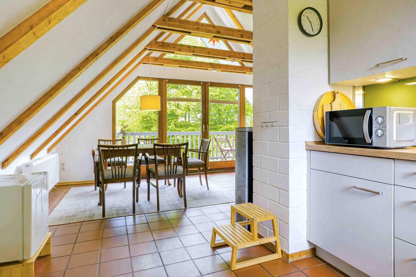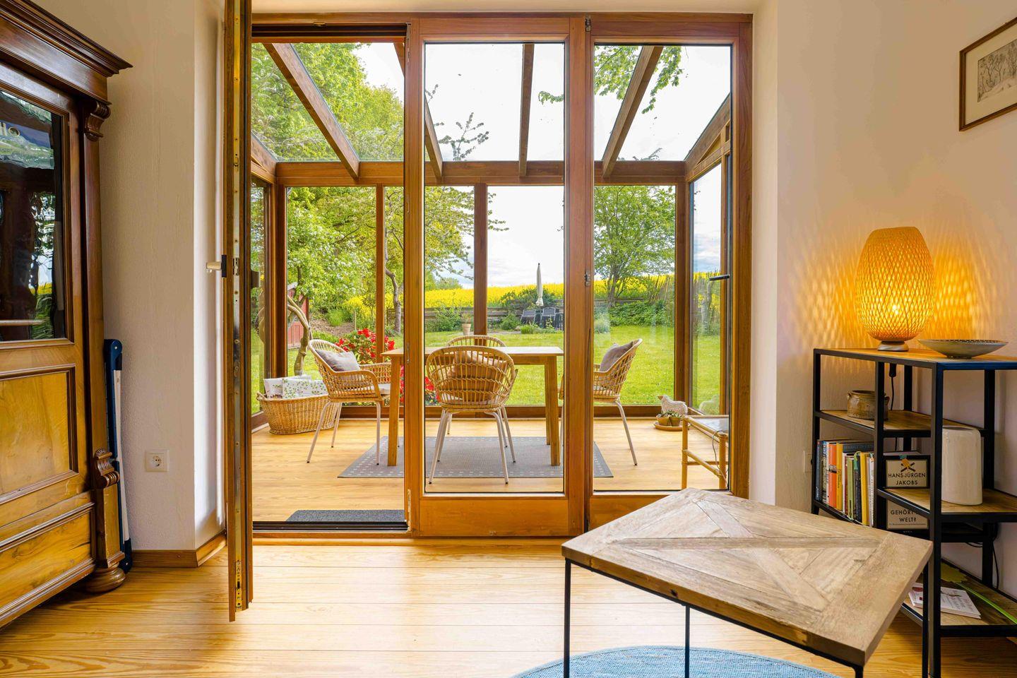 Das Ferienhaus Feldblick in Ulsnis ist eine charmante und komfortable Unterkunft auf 80 m², ergänzt durch einen gemütlichen 10 m² Wintergarten, die Platz für bis zu 4 Personen bietet. Das Haus verfügt über vier Zimmer, darunter einen großzügigen kombinierten Wohn- und Essbereich mit einem Kaminofen, Esstisch, Sofa, Sessel, Kommode und Sichtschutz an den Fenstern. Die offene Küche ist modern ausgestattet mit Mikrowelle, Induktionskochfeld, Backofen, Kühlschrank mit Gefrierfach, Spülmaschine, Kaffeefiltermaschine, Wasserkocher, Toaster und Handrührgerät – perfekt für die Zubereitung leckerer Mahlzeiten. Im Eingangsbereich ist eine Garderobe vorhanden.