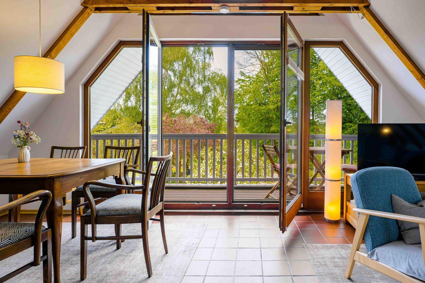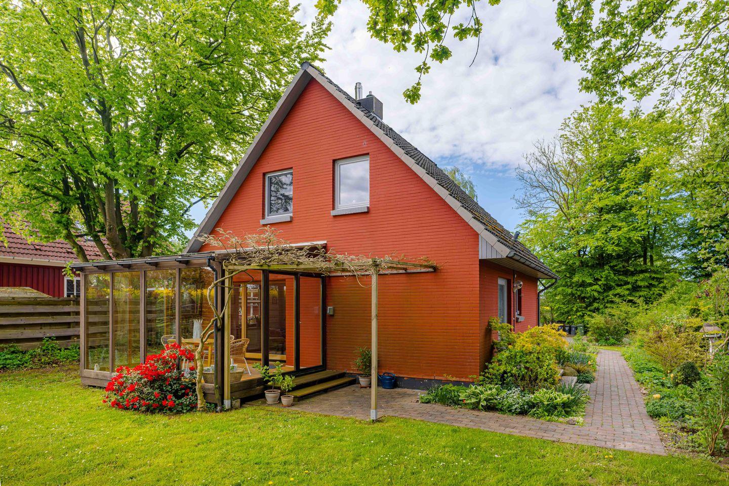 Der Außenbereich lädt zum Verweilen ein: Eine nicht überdachte Terrasse sowie ein überdachter Balkon bieten Platz für Sonnenbaden oder gemütliche Abende. Der Garten mit Liegewiese, Gartenmöbeln (Esstisch mit vier Stühlen), zwei Sonnenliegen, Holzkohlegrill und Feuerschale mit Aufsatz sorgt für entspannte Stunden im Freien. Ein Gartenhaus steht ebenfalls zur Verfügung. Für Kinder befindet sich in ca. 200 Metern Entfernung ein öffentlicher Spielplatz.