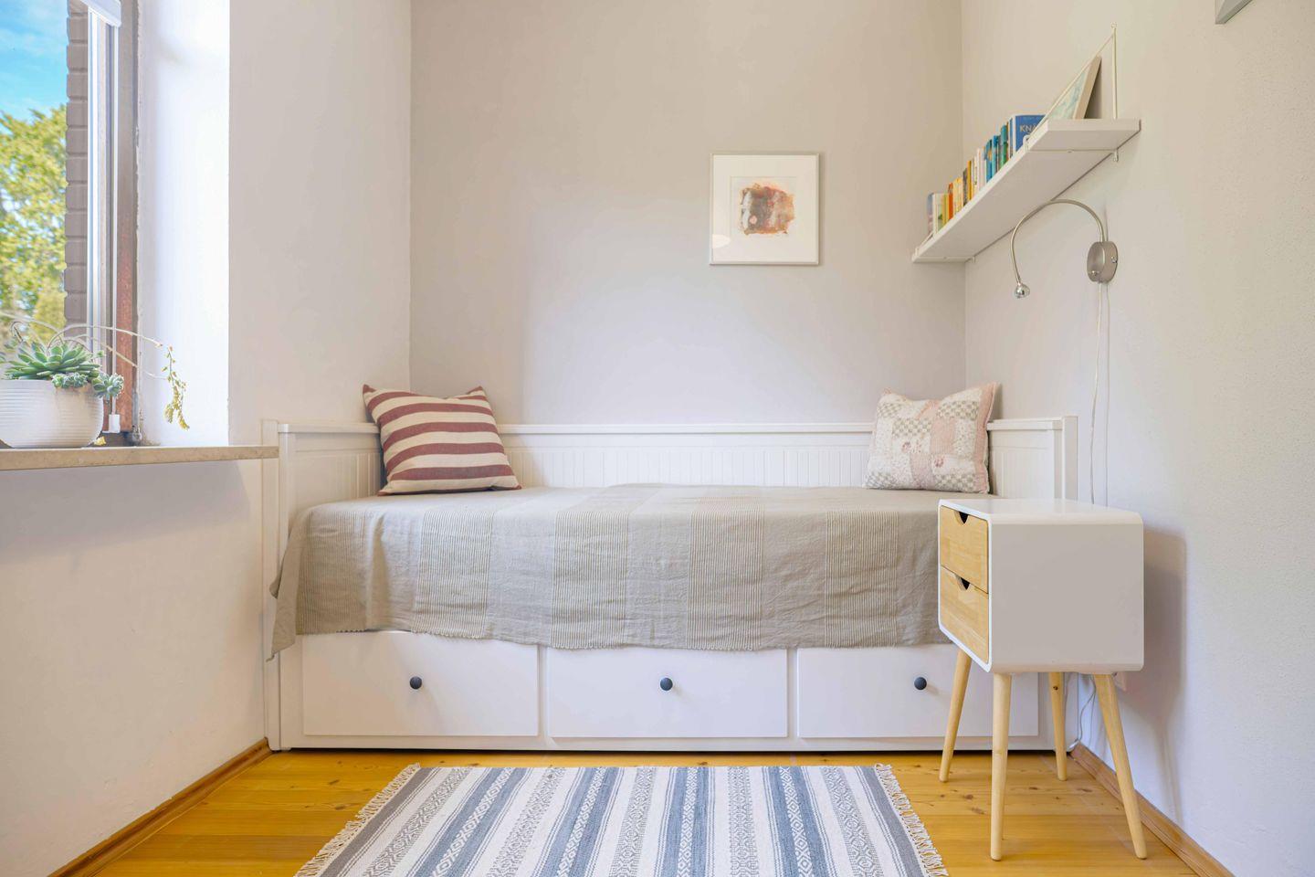 Im Objekt gibt es zwei Schlafzimmer: Das erste mit einem Doppelbett (200x200 cm) mit offenem Fußende, Kleiderschrank und Verdunklungsmöglichkeit; das zweite mit einem ausziehbaren Hemnes-Bett, das bei Bedarf als Einzel- oder Doppelbett genutzt werden kann, ebenfalls mit Kleiderschrank und Verdunkelung. Das Badezimmer ist mit Dusche, WC, Haartrockner, Waschbecken und Fenster ausgestattet.