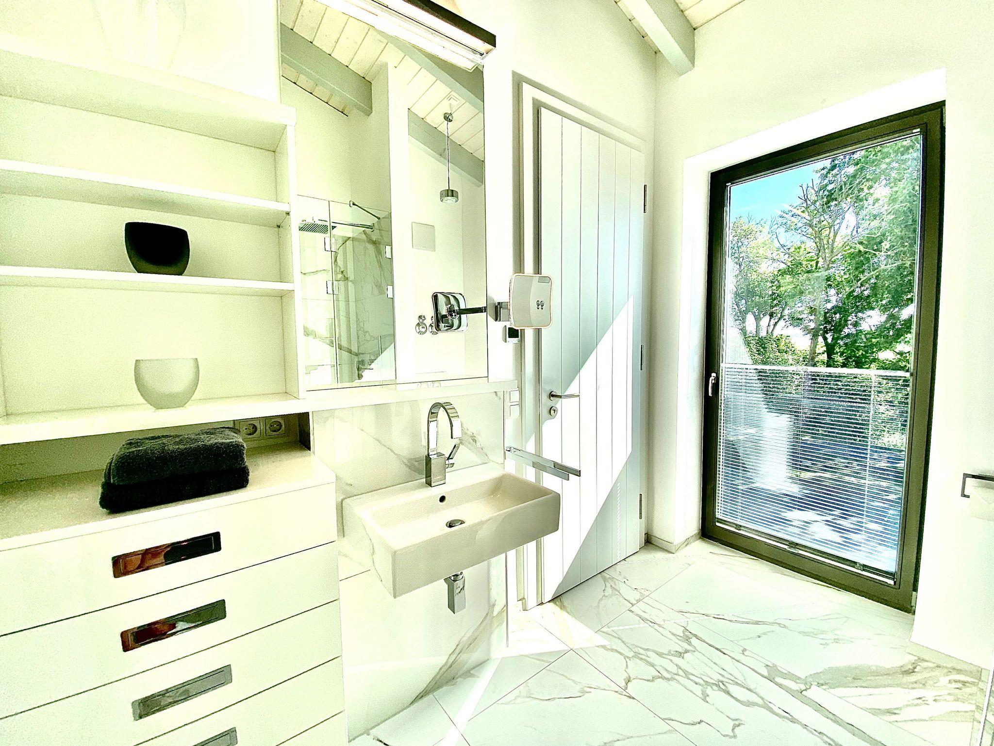 Das hochwertig geflieste Badezimmer überzeugt mit eleganten Dornbracht-Armaturen, einer bodentiefen Dusche, einem Waschtisch inklusive beleuchtetem Kosmetikspiegel und Fön sowie einem beheizbaren Handtuchtrockner.