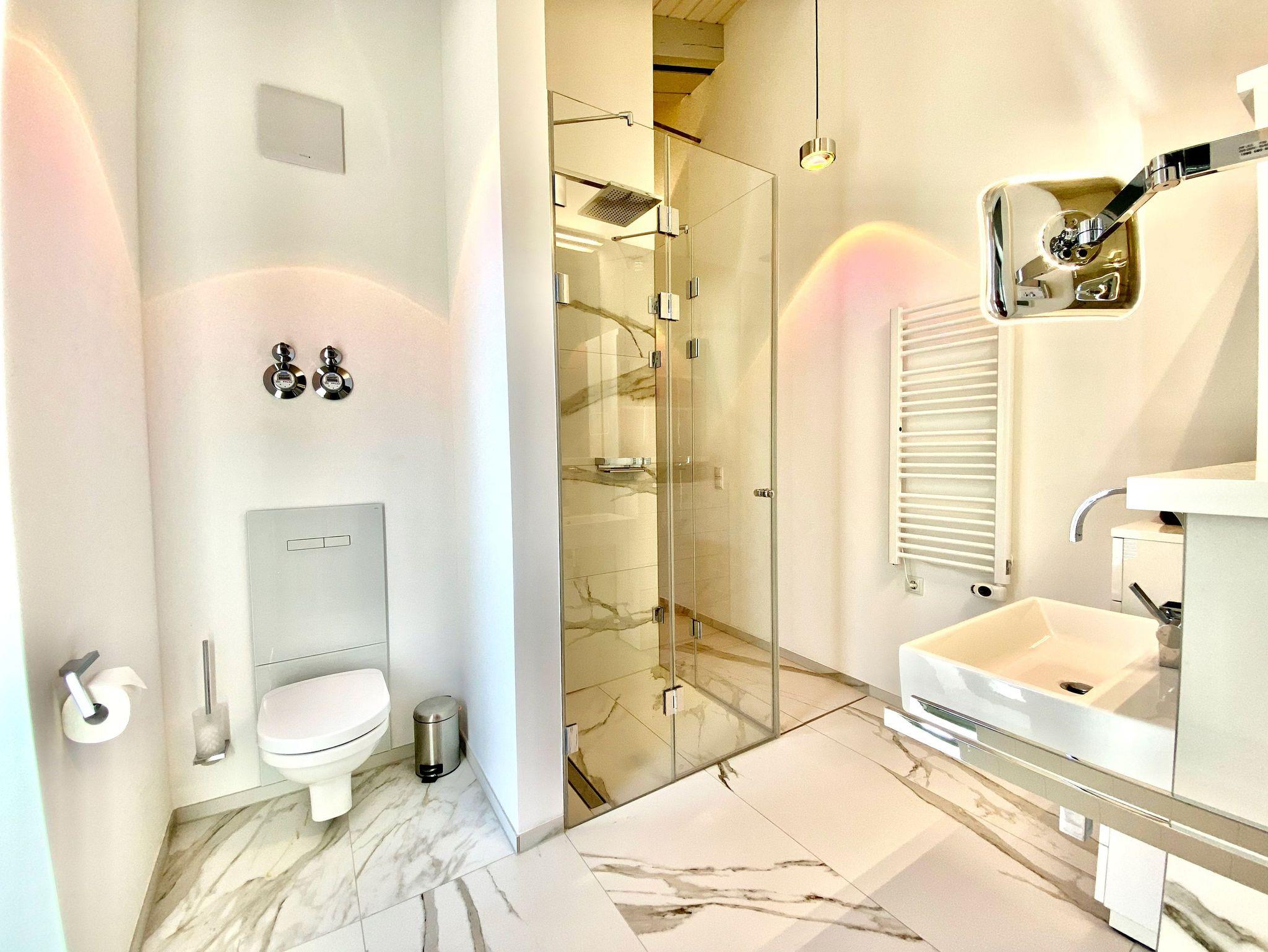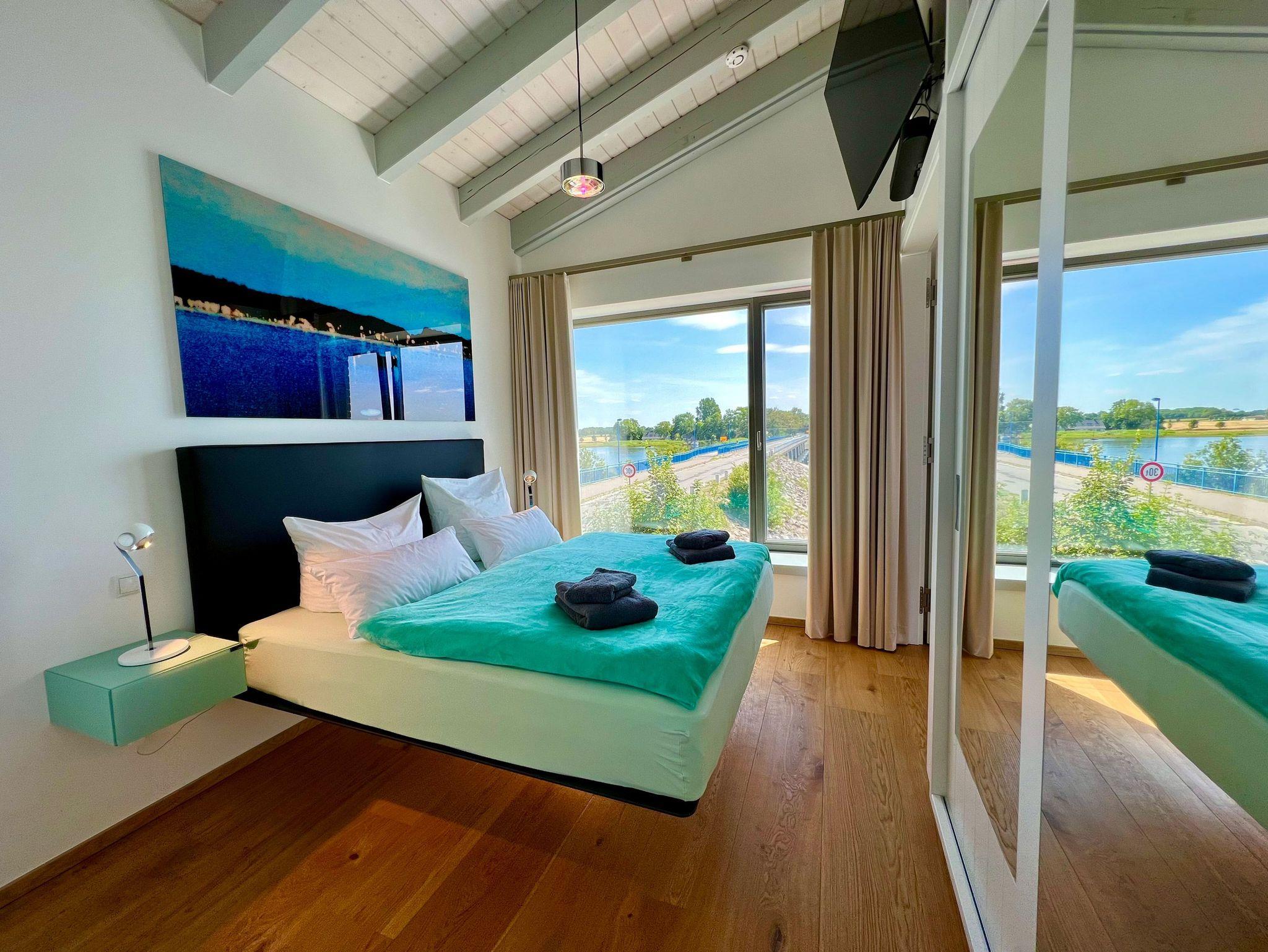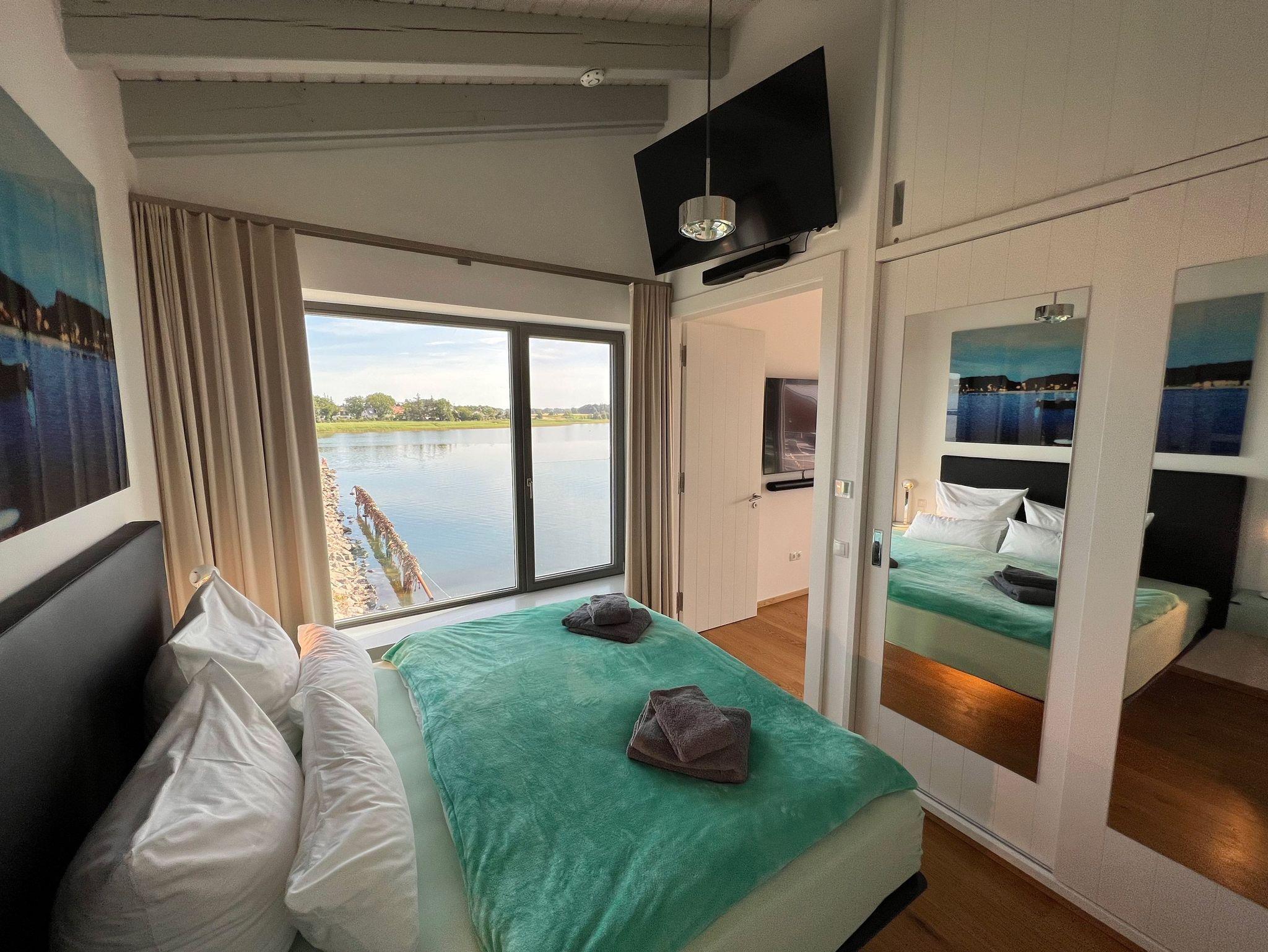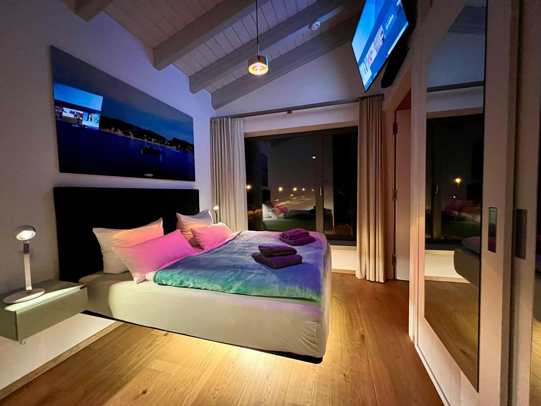 Eleganz pur auch im rund 12 qm großen Schlafzimmer, wo das schwebende Bett mit seiner Ambiente-Unterbeleuchtung süße Träume und einen entspannten Schlaf verspricht. Auch Verdunkelungsvorhänge an den Fenstern, dazu einen zweiten Flat-TV und einen geräumigen Kleiderschrank muss man hier nicht missen.