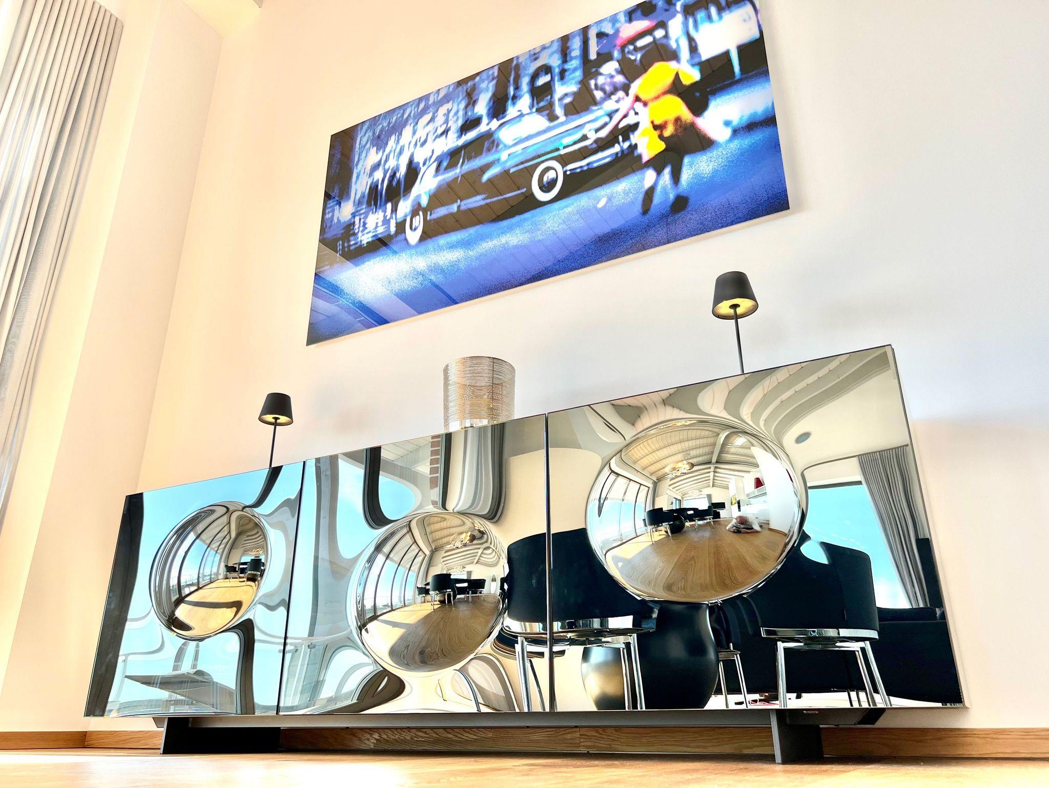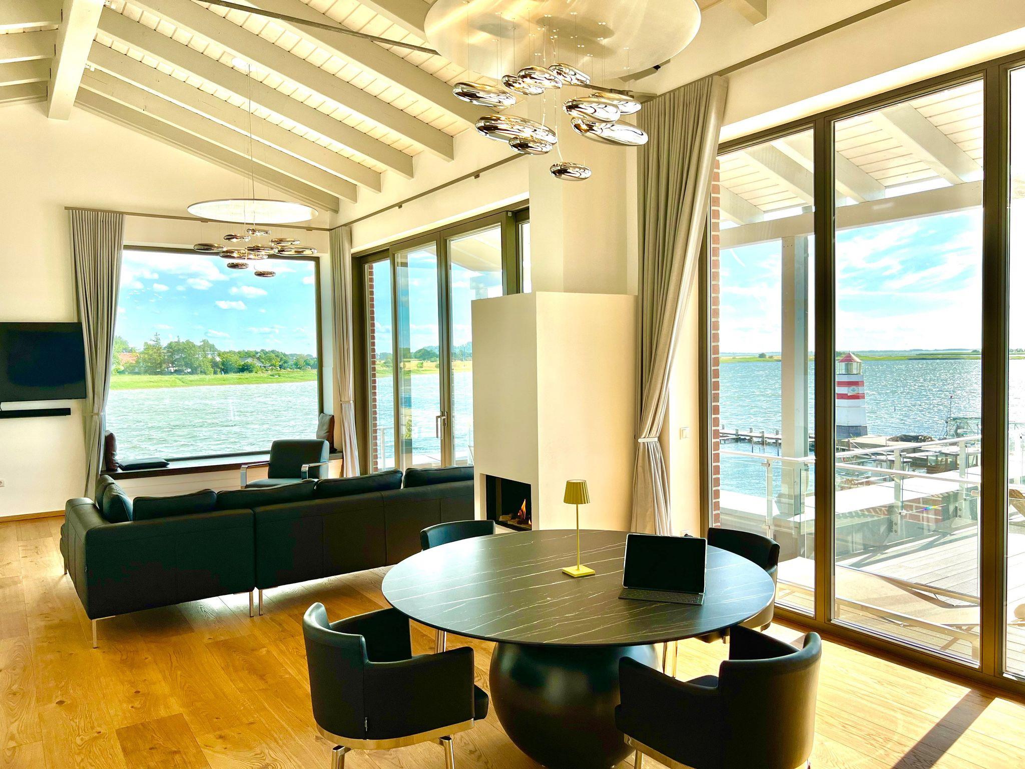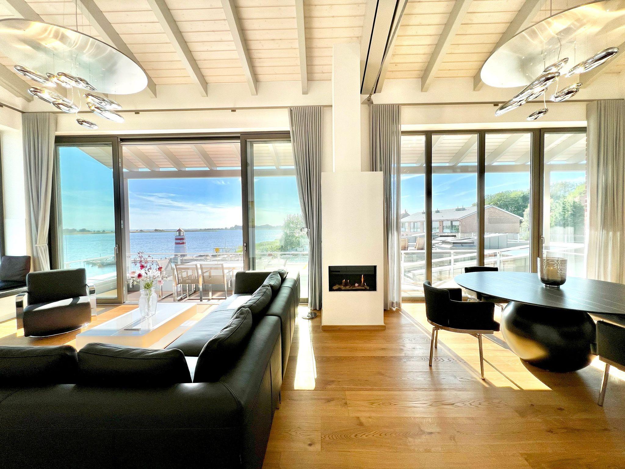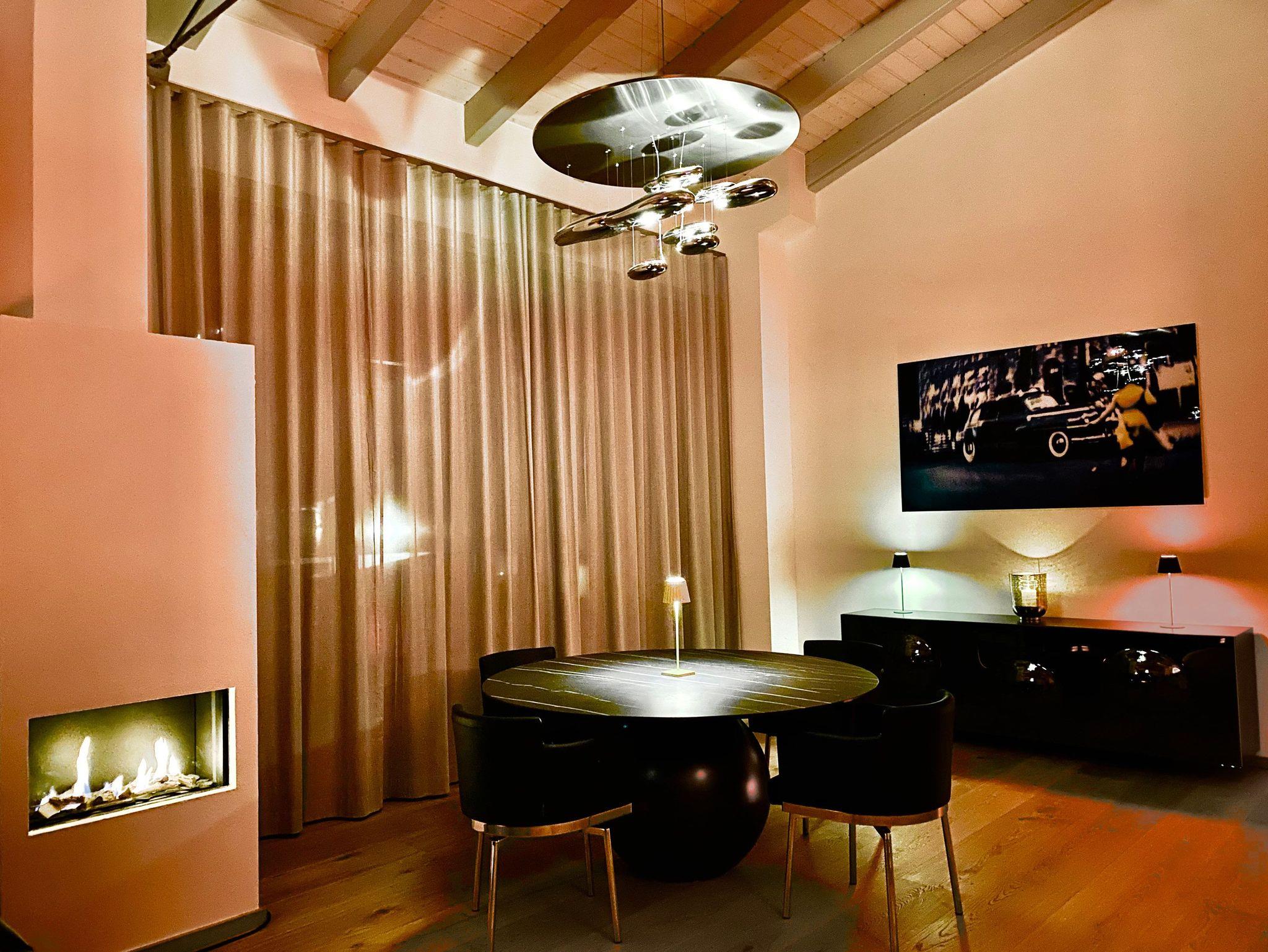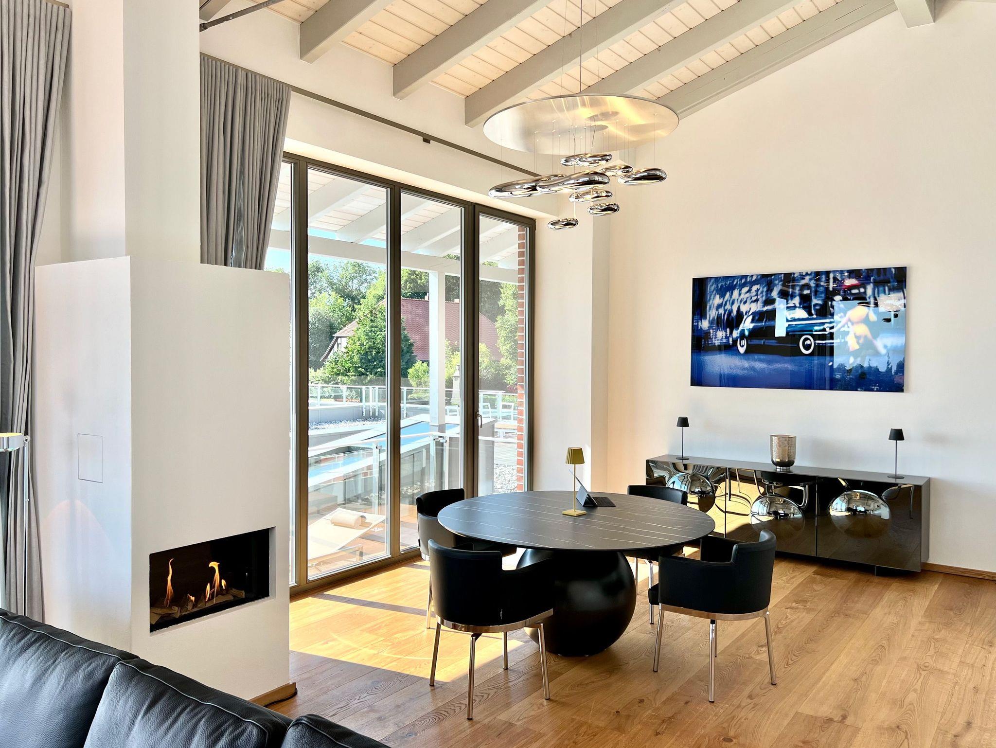 Hochwertige Designermöbel, sorgfältig ausgesuchte und platzierte Dekorationen und der gasbetriebene Kamin prägen das Ambiente im gut 55 qm großen Wohnzimmer. Ein großformatiger Smart-TV, eine Sonos-Anlage und kostenfreies W-LAN (Glasfaser mit bis zu 200 Mbit/s) sorgen für mediale Abwechslung, wann immer gewünscht.