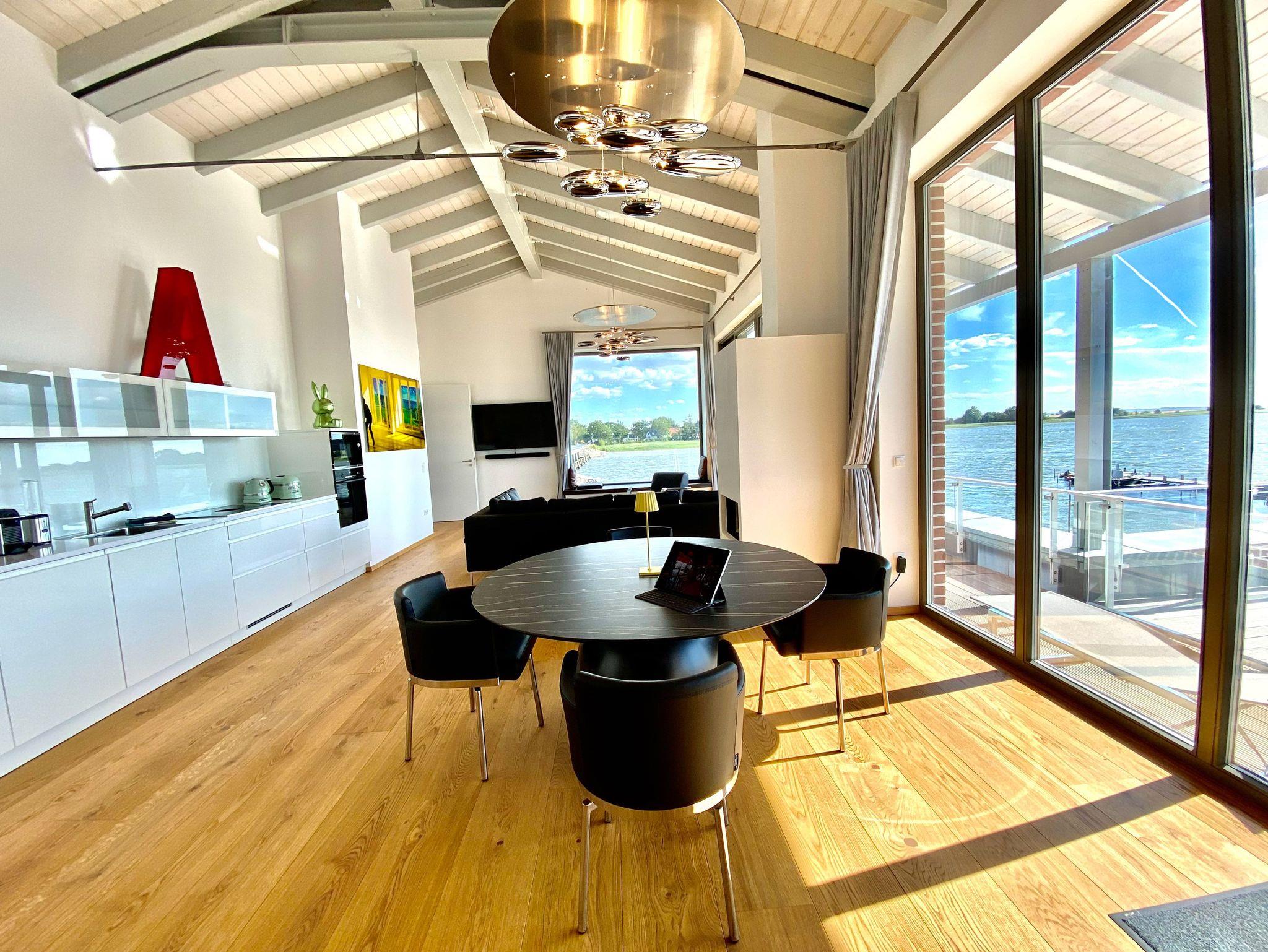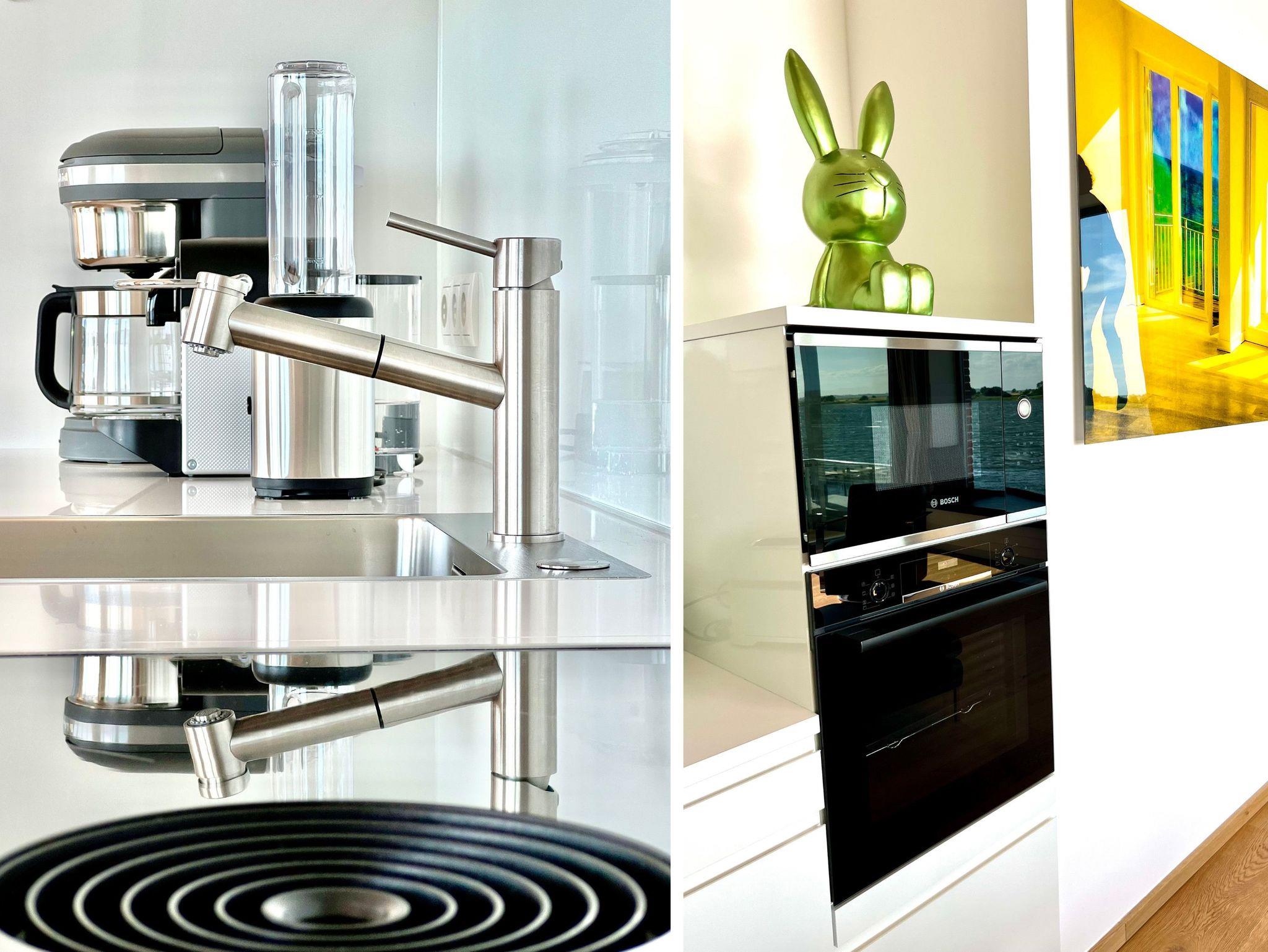 Die gekonnt in den Wohnraum integrierte LEICHT-Küche bietet mit einem Induktionsherd und BORA Dunstabzug, Backofen, Mikrowelle, einer Nespresso- und einer Filterkaffeemaschine sowie Wasserkocher, Toaster und dem sonstigen Kleininventar alles, um sich bequem selbst zu „bekochen“. Die erste „Bistronomie“ von Rügen, die „Kutter-Schnute“, befindet sich nur ca. 50 m vom Haus entfernt.